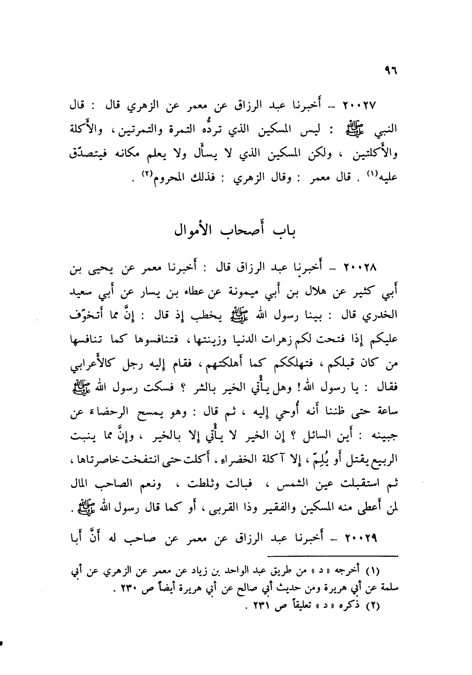 ٢٠٠٢٧ - أَخْبَرَنَا عَبْدُ الرَّزَّاقِ، عَنْ مَعْمَرٍ، عَنِ الزُّهْرِيِّ، قَالَ: قَالَ النَّبِيُّ صَلَّى اللهُ عَلَيْهِ وَسَلَّمَ: «لَيْسَ الْمِسْكِينُ الَّذِي تَرُدُّهُ التَّمْرَةُ وَالتَّمْرَتَانِ، وَالْأُكْلَةُ وَالْأُكْلَتَانِ، وَلَكِنَّ الْمِسْكِينَ الَّذِي لَا يَسْأَلُ، وَلَا يُعْلَمُ مَكَانُهُ، فَيُتَصَدَّقَ عَلَيْهِ» قَالَ مَعْمَرٌ: وَقَالَ الزُّهْرِيُّ: «فَذَلِكَ الْمَحْرُومُ»