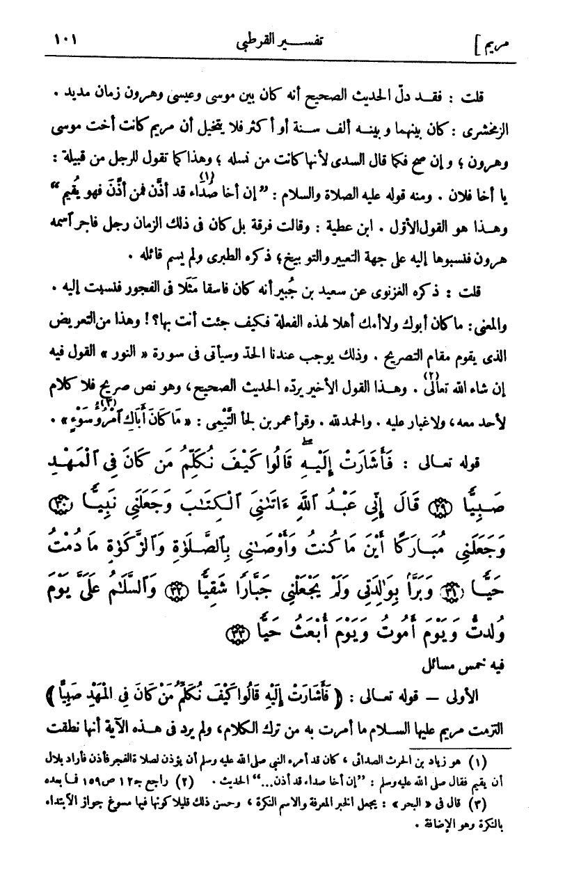 قُلْتُ: فَقَدْ دَلَّ الْحَدِيثُ الصَّحِيحُ أَنَّهُ كَانَ بين موسى وعيسى وهرون زَمَانٌ مَدِيدٌ. الزَّمَخْشَرِيُّ: كَانَ بَيْنَهُمَا وَبَيْنَهُ أَلْفُ سَنَةٍ أَوْ أَكْثَرُ فَلَا يُتَخَيَّلُ أَنَّ مَرْيَمَ كانت أخت موسى وهرون، وَإِنْ صَحَّ فَكَمَا قَالَ السُّدِّيُّ لِأَنَّهَا كَانَتْ مِنْ نَسْلِهِ، وَهَذَا كَمَا تَقُولُ لِلرَّجُلِ مِنْ قَبِيلَةٍ: يَا أَخَا فُلَانٍ. وَمِنْهُ قَوْلُهُ عَلَيْهِ الصَّلَاةُ وَالسَّلَامُ: (إِنَّ أَخَا صُدَاءٍ «١» قَدْ أَذَّنَ فَمَنْ أَذَّنَ فَهُوَ يُقِيمُ) وَهَذَا هُوَ الْقَوْلُ الْأَوَّلُ. ابْنُ عَطِيَّةَ: وَقَالَتْ فِرْقَةٌ بَلْ كَانَ في ذلك الزمان رجل فاجر اسمه هرون فَنَسَبُوهَا إِلَيْهِ عَلَى جِهَةِ التَّعْيِيرِ وَالتَّوْبِيخِ، ذَكَرَهُ الطَّبَرِيُّ وَلَمْ يُسَمِّ قَائِلَهُ. قُلْتُ: ذَكَرَهُ الْغَزْنَوِيُّ عَنْ سَعِيدِ بْنِ جُبَيْرٍ أَنَّهُ كَانَ فَاسِقًا مَثَلًا فِي الْفُجُورِ فَنُسِبَتْ إِلَيْهِ. وَالْمَعْنَى: مَا كَانَ أَبُوكِ وَلَا أُمُّكِ أَهْلًا لِهَذِهِ الْفَعْلَةِ فَكَيْفَ جِئْتِ أَنْتِ بِهَا؟! وَهَذَا مِنَ التَّعْرِيضِ الَّذِي يَقُومُ مَقَامَ التَّصْرِيحِ. وَذَلِكَ يُوجِبُ عِنْدَنَا الْحَدَّ وَسَيَأْتِي فِي سُورَةِ" النُّورِ" الْقَوْلُ فِيهِ إِنْ شَاءَ اللَّهُ تَعَالَى «٢». وَهَذَا الْقَوْلُ الْأَخِيرُ يَرُدُّهُ الْحَدِيثُ الصَّحِيحُ، وَهُوَ نَصٌّ صَرِيحٌ فَلَا كَلَامَ لِأَحَدٍ مَعَهُ، وَلَا غُبَارَ عَلَيْهِ. وَالْحَمْدُ لِلَّهِ. وَقَرَأَ عُمَرُ بْنُ لَجَأَ التَّيْمِيُّ: (مَا كان أباك امرؤ «٣» سوء).