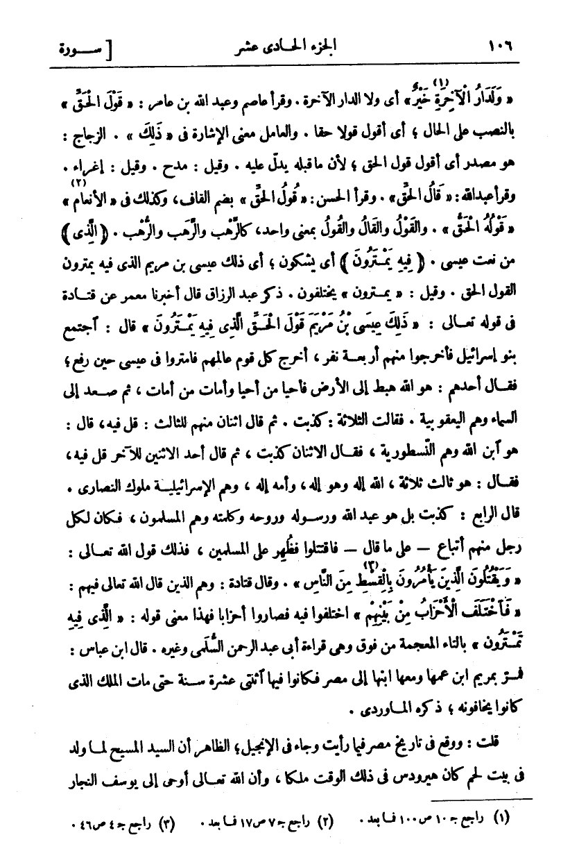 " وَلَلدَّارُ الْآخِرَةُ خَيْرٌ ١٠" «١» [الانعام: ٣٢] أَيْ وَلَا الدَّارُ الْآخِرَةُ. وَقَرَأَ عَاصِمٌ وَعَبْدُ اللَّهِ بْنُ عَامِرٍ" قَوْلَ الْحَقِّ" بِالنَّصْبِ عَلَى الْحَالِ، أَيْ أَقُولُ قَوْلًا حَقًّا. وَالْعَامِلُ مَعْنَى الْإِشَارَةِ فِي (ذلِكَ). الزَّجَّاجُ: هُوَ مَصْدَرٌ أَيْ أَقُولُ قَوْلَ الْحَقِّ لِأَنَّ مَا قَبْلَهُ يَدُلُّ عَلَيْهِ. وَقِيلَ: مَدْحٌ. وَقِيلَ: إِغْرَاءٌ. وَقَرَأَ عَبْدُ اللَّهِ:" قَالَ الْحَقَّ". وَقَرَأَ الْحَسَنُ:" قُولُ الْحَقِّ" بضم القاف، وكذلك في" الانعام" «٢» " قَوْلَ الْحَقِّ". وَالْقَوْلُ وَالْقَالُ وَالْقُولُ بِمَعْنًى وَاحِدٍ، كَالرَّهْبِ وَالرَّهَبِ وَالرُّهْبِ. (الَّذِي) مِنْ نَعْتِ عِيسَى. (فِيهِ يَمْتَرُونَ) أي يشكون، أي ذلك عيسى بن مَرْيَمَ الَّذِي فِيهِ يَمْتَرُونَ الْقَوْلَ الْحَقَّ. وَقِيلَ:" يَمْتَرُونَ" يَخْتَلِفُونَ. ذَكَرَ عَبْدُ الرَّزَّاقِ قَالَ أَخْبَرَنَا مَعْمَرٌ عَنْ قَتَادَةَ فِي قَوْلِهِ تَعَالَى (ذلِكَ عِيسَى ابْنُ مَرْيَمَ قَوْلَ الْحَقِّ الَّذِي فِيهِ يَمْتَرُونَ) قَالَ: اجْتَمَعَ بَنُو إِسْرَائِيلَ فَأَخْرَجُوا مِنْهُمْ أَرْبَعَةَ نَفَرٍ، أَخْرَجَ كُلُّ قَوْمٍ عَالِمَهُمْ فَامْتَرَوْا فِي عِيسَى حِينَ رُفِعَ، فَقَالَ أَحَدُهُمْ: هُوَ اللَّهُ هَبَطَ إِلَى الْأَرْضِ فَأَحْيَا مَنْ أَحْيَا وَأَمَاتَ مَنْ أَمَاتَ، ثُمَّ صَعَدَ إِلَى السَّمَاءِ وَهُمُ الْيَعْقُوبِيَّةُ. فَقَالَتِ الثَّلَاثَةُ: كَذَبْتَ. ثُمَّ قَالَ اثْنَانِ مِنْهُمْ لِلثَّالِثِ: قُلْ فِيهِ، قَالَ: هُوَ ابْنُ اللَّهِ وَهُمُ النُّسْطُورِيَّةُ، فَقَالَ الِاثْنَانِ كَذَبْتَ، ثُمَّ قَالَ أَحَدُ الِاثْنَيْنِ لِلْآخَرِ قُلْ فِيهِ، فَقَالَ: هُوَ ثَالِثُ ثَلَاثَةٍ، اللَّهُ إِلَهٌ وَهُوَ إِلَهٌ، وَأُمُّهُ إِلَهٌ، وَهُمُ الْإِسْرَائِيلِيَّةُ مُلُوكُ النَّصَارَى. قَالَ الرَّابِعُ: كَذَبْتَ بَلْ هُوَ عَبْدُ اللَّهِ وَرَسُولُهُ وَرُوحُهُ وَكَلِمَتُهُ وَهُمُ الْمُسْلِمُونَ، فَكَانَ لِكُلِّ رَجُلٍ مِنْهُمْ أَتْبَاعٌ- عَلَى مَا قَالَ- فَاقْتَتَلُوا فَظُهِرَ عَلَى الْمُسْلِمِينَ، فَذَلِكَ قَوْلُ اللَّهِ تَعَالَى: (وَيَقْتُلُونَ الَّذِينَ يَأْمُرُونَ بِالْقِسْطِ «٣» مِنَ النَّاسِ) [آل عمران: ٢١]. وَقَالَ قَتَادَةُ: وَهُمُ الَّذِينَ قَالَ اللَّهُ تَعَالَى فِيهِمْ: (فَاخْتَلَفَ الْأَحْزابُ مِنْ بَيْنِهِمْ) اخْتَلَفُوا فِيهِ فصاروا أحزابا فهذا معنى قوله (الَّذِي فِيهِ تَمْتَرُونَ) بِالتَّاءِ الْمُعْجَمَةِ مِنْ فَوْقٍ وَهِيَ قِرَاءَةُ أَبِي عَبْدِ الرَّحْمَنِ السُّلَمِيِّ وَغَيْرِهِ. قَالَ ابْنُ عَبَّاسٍ: فَمَرَّ بِمَرْيَمَ ابْنُ عَمِّهَا وَمَعَهَا ابْنُهَا إِلَى مِصْرَ فَكَانُوا فِيهَا اثْنَتَيْ عَشْرَةَ سَنَةً حَتَّى مَاتَ الْمَلِكُ الَّذِي كَانُوا يَخَافُونَهُ، ذَكَرَهُ الْمَاوَرْدِيُّ. قُلْتُ: وَوَقَعَ فِي تَارِيخِ مِصْرَ فِيمَا رَأَيْتُ وَجَاءَ فِي الْإِنْجِيلِ الظَّاهِرِ أَنَّ السَّيِّدَ الْمَسِيحَ لَمَّا وُلِدَ فِي بَيْتِ لَحْمٍ كَانَ هِيرُودِسَ فِي ذَلِكَ الْوَقْتِ مَلِكًا وَأَنَّ اللَّهَ تَعَالَى أَوْحَى إِلَى يُوسُفَ النَّجَّارِ