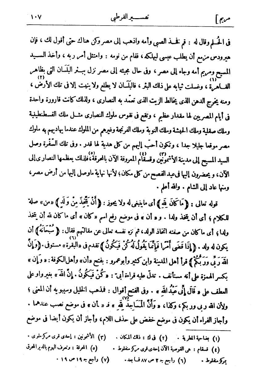 فِي الْحُلْمِ وَقَالَ لَهُ: قُمْ فَخُذِ الصَّبِيَّ وَأُمَّهُ وَاذْهَبْ إِلَى مِصْرَ وَكُنْ هُنَاكَ حَتَّى أَقُولَ لَكَ، فَإِنَّ هِيرُودِسَ مُزْمِعٌ أَنْ يَطْلُبَ عِيسَى لِيُهْلِكَهُ فَقَامَ مِنْ نَوْمِهِ: وَامْتَثَلَ أَمْرَ رَبِّهِ وَأَخَذَ السَّيِّدَ الْمَسِيحَ وَمَرْيَمَ أُمَّهُ وَجَاءَ إِلَى مِصْرَ، وَفِي حَالِ مَجِيئِهِ إِلَى مِصْرَ نَزَلَ بِبِئْرِ الْبَلَسَانِ الَّتِي بِظَاهِرِ الْقَاهِرَةِ «١»، وَغَسَلَتْ ثِيَابَهُ عَلَى ذَلِكَ الْبِئْرَ فَالْبَلَسَانُ لَا يَطْلُعُ وَلَا يَنْبُتُ إِلَّا فِي تِلْكَ الْأَرْضِ «٢»، وَمِنْهُ يَخْرُجُ الدُّهْنُ الَّذِي يُخَالِطُ الزَّيْتَ الَّذِي تُعَمَّدُ بِهِ النَّصَارَى وَلِذَلِكَ كَانَتْ قَارُورَةٌ وَاحِدَةٌ فِي أَيَّامِ الْمِصْرِيِّينَ لَهَا مِقْدَارٌ عَظِيمٌ، وَتَقَعُ فِي نُفُوسِ مُلُوكِ النَّصَارَى مِثْلَ مَلِكِ الْقُسْطَنْطِينِيَّةِ وَمَلِكِ صِقِلِّيَةَ وَمَلِكِ الْحَبَشَةِ وَمَلِكِ النُّوبَةِ وَمَلِكِ الْفِرِنْجَةِ وغيرهم من الملوك عند ما يُهَادِيهِمْ بِهِ مُلُوكُ مِصْرَ مَوْقِعًا جَلِيلًا جِدًّا وَتَكُونُ أَحَبَّ إِلَيْهِمْ مِنْ كُلِّ هَدِيَّةٍ لَهَا قَدْرٌ. وَفِي تِلْكَ السَّفْرَةِ وَصَلَ السَّيِّدُ الْمَسِيحُ إِلَى مَدِينَةِ الْأُشْمُونَيْنِ «٣» وَقَسْقَامَ «٤» الْمَعْرُوفَةِ الْآنَ بِالْمُحَرَّقَةِ «٥» فَلِذَلِكَ يُعَظِّمُهَا النَّصَارَى إِلَى الْآنَ، وَيَحْضُرُونَ إِلَيْهَا فِي عِيدِ الْفِصْحِ مِنْ كُلِّ مَكَانٍ، لِأَنَّهَا نِهَايَةُ مَا وَصَلَ إِلَيْهَا مِنْ أَرْضِ مِصْرَ، وَمِنْهَا عَادَ إِلَى الشَّامِ. وَاللَّهُ أَعْلَمُ. قَوْلُهُ تَعَالَى: (مَا كانَ لِلَّهِ) أَيْ مَا يَنْبَغِي لَهُ وَلَا يَجُوزُ: (أَنْ يَتَّخِذَ مِنْ وَلَدٍ) " مِنْ" صِلَةٌ لِلْكَلَامِ، أَيْ أَنْ يَتَّخِذَ وَلَدًا. وَ" أَنْ" فِي مَوْضِعِ رَفْعِ اسْمِ" كانَ" أَيْ مَا كَانَ لِلَّهِ أَنْ يَتَّخِذَ وَلَدًا، أَيْ مَا كَانَ مِنْ صِفَتِهِ اتِّخَاذُ الْوَلَدِ، ثُمَّ نَزَّهَ نَفْسَهُ تَعَالَى عَنْ مَقَالَتِهِمْ فَقَالَ: (سُبْحانَهُ) أَنْ يَكُونَ لَهُ وَلَدٌ. (إِذا قَضى أَمْراً فَإِنَّما يَقُولُ لَهُ كُنْ فَيَكُونُ) تَقَدَّمَ في (البقرة) «٦» مستوفى. (إِنَّ اللَّهَ رَبِّي وَرَبُّكُمْ) قَرَأَ أَهْلُ الْمَدِينَةِ وَابْنُ كَثِيرٍ وَأَبُو عَمْرٍو: بِفَتْحِ" أَنَّ" وَأَهْلُ الْكُوفَةِ" وَإِنَّ" بِكَسْرِ الْهَمْزَةِ عَلَى أَنَّهُ مُسْتَأْنَفٌ. تَدُلُّ عليه قراءة أبي" كن فيكون. إن اللَّهَ" بِغَيْرِ وَاوٍ عَلَى الْعَطْفِ عَلَى" قالَ إِنِّي عَبْدُ اللَّهِ ٣٠". وَفِي الْفَتْحِ أَقْوَالٌ: فَمَذْهَبُ الْخَلِيلِ وَسِيبَوَيْهِ أَنَّ الْمَعْنَى، وَلِأَنَّ اللَّهَ رَبِّي وَرَبُّكُمْ، وَكَذَا" وَأَنَّ الْمَساجِدَ «٧» لِلَّهِ" فَ"- أَنَّ" فِي مَوْضِعِ نَصْبٍ عِنْدَهُمَا. وَأَجَازَ الْفَرَّاءُ أَنْ يَكُونَ فِي مَوْضِعِ خَفْضٍ عَلَى حَذْفِ اللَّامِ، وأجاز أن يكون أيضا في موضع
