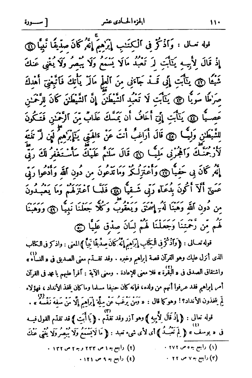 وَاذْكُرْ فِي الْكِتابِ إِبْراهِيمَ إِنَّهُ كانَ صِدِّيقاً نَبِيًّا (٤١) إِذْ قالَ لِأَبِيهِ يَا أَبَتِ لِمَ تَعْبُدُ مَا لَا يَسْمَعُ وَلا يُبْصِرُ وَلا يُغْنِي عَنْكَ شَيْئاً (٤٢) يَا أَبَتِ إِنِّي قَدْ جاءَنِي مِنَ الْعِلْمِ مَا لَمْ يَأْتِكَ فَاتَّبِعْنِي أَهْدِكَ صِراطاً سَوِيًّا (٤٣) يَا أَبَتِ لَا تَعْبُدِ الشَّيْطانَ إِنَّ الشَّيْطانَ كانَ لِلرَّحْمنِ عَصِيًّا (٤٤) يَا أَبَتِ إِنِّي أَخافُ أَنْ يَمَسَّكَ عَذابٌ مِنَ الرَّحْمنِ فَتَكُونَ لِلشَّيْطانِ وَلِيًّا (٤٥)