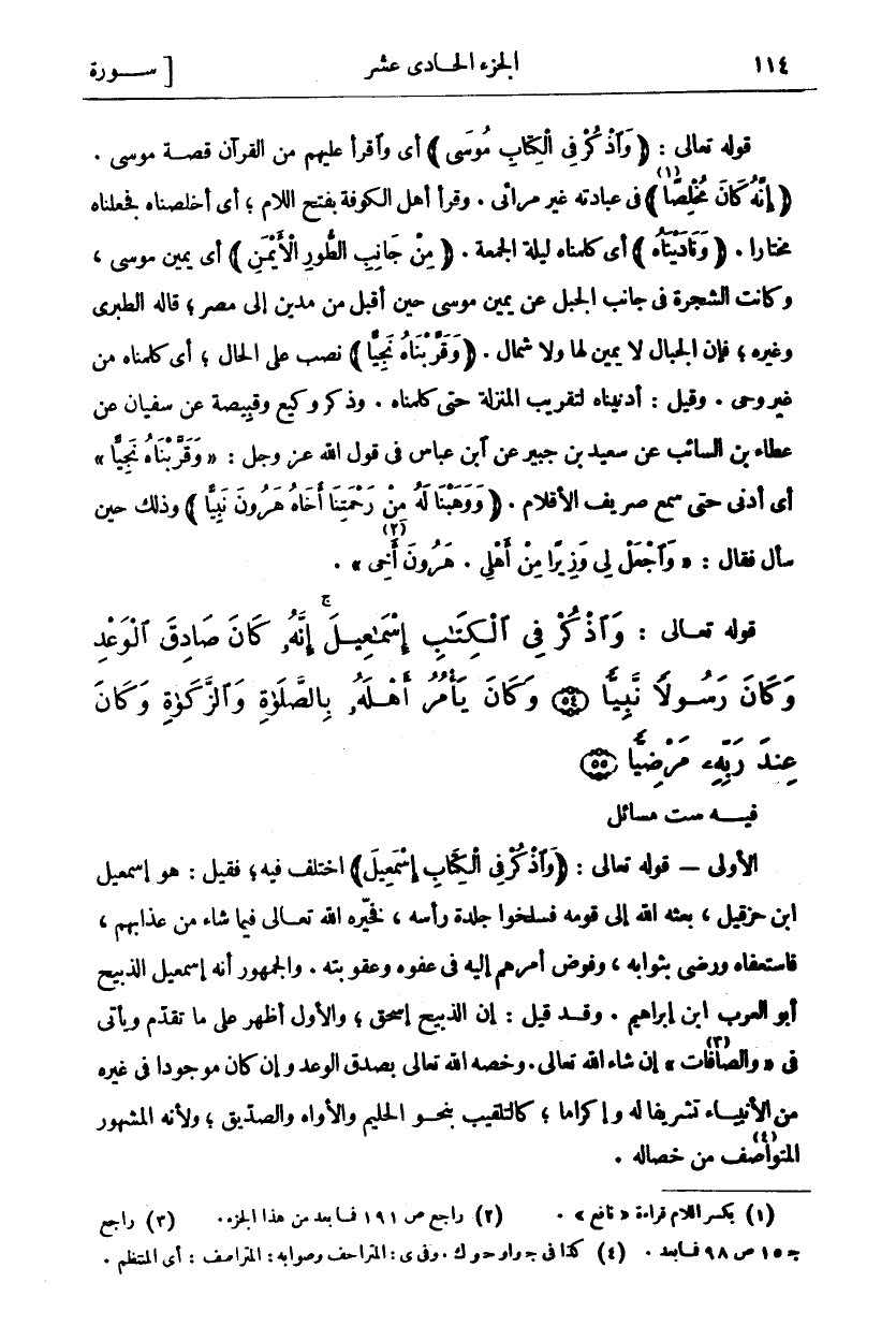 قَوْلُهُ تَعَالَى: (وَاذْكُرْ فِي الْكِتابِ مُوسى) أَيْ وَاقْرَأْ عَلَيْهِمْ مِنَ الْقُرْآنِ قِصَّةَ مُوسَى. (إِنَّهُ كانَ مُخْلَصاً) «١» في عبادته غير مرائي. وَقَرَأَ أَهْلُ الْكُوفَةِ بِفَتْحِ اللَّامِ، أَيْ أَخْلَصْنَاهُ فَجَعَلْنَاهُ مُخْتَارًا. (وَنادَيْناهُ) أَيْ كَلَّمْنَاهُ لَيْلَةَ الْجُمُعَةِ. (مِنْ جانِبِ الطُّورِ الْأَيْمَنِ) أَيْ يَمِينَ مُوسَى، وَكَانَتِ الشَّجَرَةُ فِي جَانِبِ الْجَبَلِ عَنْ يَمِينِ مُوسَى حِينَ أَقْبَلَ مِنْ مَدْيَنَ إِلَى مِصْرَ، قَالَهُ الطَّبَرِيُّ وَغَيْرُهُ فَإِنَّ الْجِبَالَ لَا يَمِينَ لَهَا وَلَا شِمَالَ. (وَقَرَّبْناهُ نَجِيًّا) نُصِبَ عَلَى الْحَالِ، أَيْ كَلَّمْنَاهُ مِنْ غَيْرِ وَحْيٍ. وَقِيلَ: أَدْنَيْنَاهُ لِتَقْرِيبِ الْمَنْزِلَةِ حَتَّى كَلَّمْنَاهُ. وَذَكَرَ وَكِيعٌ وَقَبِيصَةُ عَنْ سُفْيَانَ عَنْ عَطَاءِ بْنِ السَّائِبِ عَنْ سَعِيدِ بْنِ جُبَيْرٍ عَنِ ابْنِ عَبَّاسٍ فِي قَوْلِ اللَّهِ عَزَّ وَجَلَّ:" وَقَرَّبْناهُ نَجِيًّا" أي أدنى حتى سمع صريف الْأَقْلَامِ. (وَوَهَبْنا لَهُ مِنْ رَحْمَتِنا أَخاهُ هارُونَ نَبِيًّا) وَذَلِكَ حِينَ سَأَلَ فَقَالَ:" وَاجْعَلْ لِي وَزِيراً مِنْ أَهْلِي هارُونَ أَخِي" «٢».