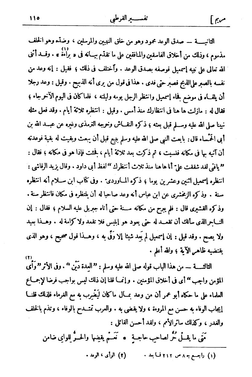 الثَّانِيَةُ- صِدْقُ الْوَعْدِ مَحْمُودٌ وَهُوَ مِنْ خُلُقِ النَّبِيِّينَ وَالْمُرْسَلِينَ، وَضِدُّهُ وَهُوَ الْخُلْفُ مَذْمُومٌ، وَذَلِكَ مِنْ أَخْلَاقِ الْفَاسِقِينَ وَالْمُنَافِقِينَ عَلَى مَا تَقَدَّمَ بَيَانُهُ فِي" بَرَاءَةٍ" «١». وَقَدْ أَثْنَى اللَّهُ تَعَالَى عَلَى نَبِيِّهِ إِسْمَاعِيلَ فَوَصَفَهُ بِصِدْقِ الْوَعْدِ. وَاخْتُلِفَ فِي ذَلِكَ، فَقِيلَ: إِنَّهُ وَعَدَ مِنْ نَفْسِهِ بِالصَّبْرِ عَلَى الذَّبْحِ فَصَبَرَ حَتَّى فُدِيَ. هَذَا فِي قَوْلِ مَنْ يَرَى أَنَّهُ الذَّبِيحُ. وَقِيلَ: وَعَدَ رَجُلًا أَنْ يَلْقَاهُ فِي مَوْضِعٍ فَجَاءَ إِسْمَاعِيلُ وَانْتَظَرَ الرَّجُلَ يَوْمَهُ وَلَيْلَتَهُ، فَلَمَّا كَانَ فِي الْيَوْمِ الْآخَرِ جَاءَ، فَقَالَ لَهُ: مَا زلت ها هنا فِي انْتِظَارِكَ مُنْذُ أَمْسِ. وَقِيلَ: انْتَظَرَهُ ثَلَاثَةَ أيام. وقد فَعَلَ مِثْلَهُ نَبِيُّنَا صَلَّى اللَّهُ عَلَيْهِ وَسَلَّمَ قَبْلَ بَعْثِهِ، ذَكَرَهُ النَّقَّاشُ وَخَرَّجَهُ التِّرْمِذِيُّ وَغَيْرُهُ عَنْ عَبْدِ اللَّهِ بْنِ أَبِي الْحَمْسَاءِ قَالَ: بَايَعْتُ النَّبِيَّ صَلَّى اللَّهُ عَلَيْهِ وَسَلَّمَ بِبَيْعٍ قَبْلَ أَنْ يُبْعَثَ وَبَقِيَتْ لَهُ بَقِيَّةٌ فَوَعَدْتُهُ أَنْ آتِيَهُ بِهَا فِي مَكَانِهِ فَنَسِيتُ، ثُمَّ ذَكَرْتُ بَعْدَ ثَلَاثَةِ أَيَّامٍ، فَجِئْتُ فَإِذَا هُوَ فِي مَكَانِهِ، فَقَالَ: (يَا فَتَى لَقَدْ شَقَقْتَ عَلَيَّ أَنَا هَاهُنَا مُنْذُ ثَلَاثٍ أَنْتَظِرُكَ) لَفْظُ أَبِي دَاوُدَ. وَقَالَ يَزِيدُ الرَّقَاشِيُّ: انْتَظَرَهُ إِسْمَاعِيلُ اثْنَيْنِ وَعِشْرِينَ يَوْمًا، ذَكَرَهُ الْمَاوَرْدِيُّ. وَفِي كِتَابِ ابْنِ سَلَّامٍ أَنَّهُ انْتَظَرَهُ سَنَةً. وَذَكَرَهُ الزَّمَخْشَرِيُّ عَنِ ابْنِ عَبَّاسٍ أَنَّهُ وَعَدَ صَاحِبًا لَهُ أن ينتظره في مكان فانتظر سَنَةً. وَذَكَرَهُ الْقُشَيْرِيُّ قَالَ: فَلَمْ يَبْرَحْ مِنْ مَكَانِهِ سَنَةً حَتَّى أَتَاهُ جِبْرِيلُ عَلَيْهِ السَّلَامُ فَقَالَ: إِنَّ التَّاجِرَ الَّذِي سَأَلَكَ أَنْ تَقْعُدَ لَهُ حَتَّى يَعُودَ هُوَ إِبْلِيسُ فَلَا تَقْعُدْ وَلَا كَرَامَةَ لَهُ. وَهَذَا بَعِيدٌ وَلَا يَصِحُّ. وَقَدْ قِيلَ: إِنَّ إِسْمَاعِيلَ لَمْ يَعِدْ شَيْئًا إِلَّا وَفَّى بِهِ، وَهَذَا قَوْلٌ صَحِيحٌ، وَهُوَ الَّذِي يَقْتَضِيهِ ظَاهِرُ الْآيَةِ، وَاللَّهُ أَعْلَمُ. الثَّالِثَةُ- مِنْ هَذَا الْبَابِ قَوْلُهُ صَلَّى اللَّهُ عَلَيْهِ وَسَلَّمَ (الْعِدَةُ دَيْنٌ). وَفِي الْأَثَرِ (وَأْيُ «٢» الْمُؤْمِنِ وَاجِبٌ) أَيْ فِي أَخْلَاقِ الْمُؤْمِنِينَ. وَإِنَّمَا قُلْنَا إِنَّ ذَلِكَ لَيْسَ بِوَاجِبٍ فَرْضًا لِإِجْمَاعِ الْعُلَمَاءِ عَلَى مَا حَكَاهُ أَبُو عُمَرَ أَنَّ مَنْ وَعَدَ بِمَالٍ مَا كَانَ لِيَضْرِبَ بِهِ مَعَ الْغُرَمَاءِ فَلِذَلِكَ قُلْنَا إِيجَابُ الْوَفَاءِ بِهِ حَسَنٌ مَعَ الْمُرُوءَةِ، وَلَا يُقْضَى بِهِ. وَالْعَرَبُ تَمْتَدِحُ بِالْوَفَاءِ، وَتَذُمُّ بِالْخُلْفِ وَالْغَدْرِ، وَكَذَلِكَ سَائِرُ الْأُمَمِ، وَلَقَدْ أَحْسَنَ الْقَائِلُ: