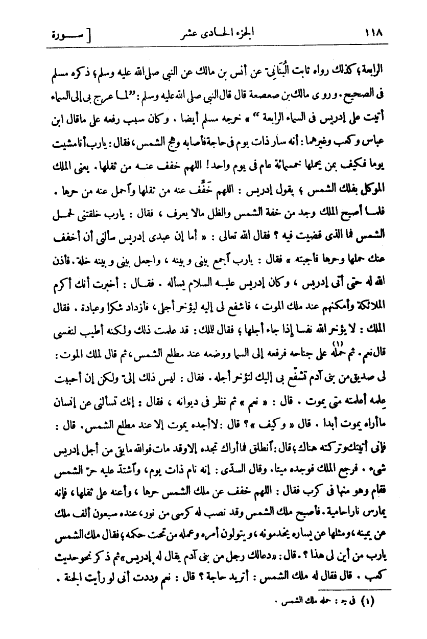 الرَّابِعَةِ، كَذَلِكَ رَوَاهُ ثَابِتٌ الْبُنَانِيُّ عَنْ أَنَسُ بْنُ مَالِكٍ عَنِ النَّبِيِّ صَلَّى اللَّهُ عَلَيْهِ وَسَلَّمَ، ذَكَرَهُ مُسْلِمٌ فِي الصَّحِيحِ. وَرَوَى مَالِكُ بْنُ صَعْصَعَةَ قَالَ قَالَ النَّبِيُّ صَلَّى اللَّهُ عَلَيْهِ وَسَلَّمَ: (لَمَّا عُرِجَ بِي إِلَى السَّمَاءِ أَتَيْتُ عَلَى إِدْرِيسَ فِي السَّمَاءِ الرَّابِعَةِ). خَرَّجَهُ مُسْلِمٌ أَيْضًا. وَكَانَ سَبَبُ رَفْعِهِ عَلَى مَا قَالَ ابْنُ عَبَّاسٍ وَكَعْبٌ وَغَيْرُهُمَا: أَنَّهُ سَارَ ذَاتَ يَوْمٍ فِي حَاجَةٍ فَأَصَابَهُ وَهَجُ الشَّمْسِ، فَقَالَ: (يَا رَبِّ أَنَا مَشَيْتُ يَوْمًا فَكَيْفَ بِمَنْ يَحْمِلُهَا خَمْسَمِائَةِ عَامٍ فِي يَوْمٍ وَاحِدٍ! اللَّهُمَّ خَفِّفْ عَنْهُ مِنْ ثِقَلِهَا. يَعْنِي الْمَلَكَ الْمُوَكَّلَ بِفَلَكِ الشَّمْسِ (، يَقُولُ إِدْرِيسُ: اللَّهُمَّ خَفِّفْ عَنْهُ مِنْ ثِقَلِهَا وَاحْمِلْ عَنْهُ مِنْ حَرِّهَا. فَلَمَّا أَصْبَحَ الْمَلَكُ وَجَدَ مِنْ خِفَّةِ الشَّمْسِ والظل مالا يَعْرِفُ فَقَالَ: يَا رَبِّ خَلَقْتَنِي لِحَمْلِ الشَّمْسِ فَمَا الَّذِي قَضَيْتَ فِيهِ؟ فَقَالَ اللَّهُ تَعَالَى:" أَمَا إِنَّ عَبْدِي إِدْرِيسَ سَأَلَنِي أَنْ أُخَفِّفَ عَنْكَ حَمْلَهَا وَحَرَّهَا فَأَجَبْتُهُ" فَقَالَ: يَا رَبِّ اجْمَعْ بَيْنِي وَبَيْنَهُ، وَاجْعَلْ بَيْنِي وَبَيْنَهُ خُلَّةً. فَأَذِنَ اللَّهُ لَهُ حَتَّى أَتَى إِدْرِيسَ، وَكَانَ إِدْرِيسُ عَلَيْهِ السَّلَامُ يَسْأَلُهُ. فَقَالَ أُخْبِرْتُ أَنَّكَ أَكْرَمُ الْمَلَائِكَةِ وَأَمْكَنُهُمْ عِنْدَ مَلَكِ الْمَوْتِ، فَاشْفَعْ لِي إِلَيْهِ لِيُؤَخِّرَ أَجَلِي، فَأَزْدَادُ شُكْرًا وَعِبَادَةً. فَقَالَ الْمَلَكُ: لَا يُؤَخِّرُ اللَّهُ نَفْسًا إِذَا جَاءَ أَجَلُهَا فَقَالَ لِلْمَلَكِ: قَدْ عَلِمْتُ ذَلِكَ وَلَكِنَّهُ أَطْيَبُ لِنَفْسِي قَالَ نَعَمْ. ثُمَّ حَمَلَهُ «١» عَلَى جَنَاحِهِ فَرَفَعَهُ إِلَى السَّمَاءِ وَوَضَعَهُ عِنْدَ مَطْلَعِ الشَّمْسِ، ثُمَّ قَالَ لِمَلَكِ الْمَوْتِ: لِي صَدِيقٌ مِنْ بَنِي آدَمَ تَشَفَّعَ بِي إِلَيْكَ لِتُؤَخِّرَ أَجَلَهُ. فَقَالَ: لَيْسَ ذَلِكَ إِلَيَّ وَلَكِنْ إِنْ أَحْبَبْتَ عِلْمَهُ أَعْلَمْتُهُ مَتَى يَمُوتُ. قَالَ":" نَعَمْ" ثُمَّ نَظَرَ فِي دِيوَانِهِ، فَقَالَ: إِنَّكَ تَسْأَلُنِي عَنْ إِنْسَانٍ مَا أَرَاهُ يَمُوتُ أَبَدًا. قَالَ" وَكَيْفَ"؟ قَالَ: لَا أَجِدُهُ يَمُوتُ إِلَّا عِنْدَ مَطْلَعِ الشَّمْسِ. قَالَ: فَإِنِّي أَتَيْتُكَ وَتَرَكْتُهُ هُنَاكَ، قَالَ: انْطَلِقْ فَمَا أَرَاكَ تَجِدُهُ إِلَّا وَقَدْ مَاتَ فَوَاللَّهِ مَا بَقِيَ مِنْ أَجَلِ إدريس شي. فَرَجَعَ الْمَلَكُ فَوَجَدَهُ مَيِّتًا. وَقَالَ السُّدِّيُّ: إِنَّهُ نَامَ ذَاتَ يَوْمٍ، وَاشْتَدَّ عَلَيْهِ حَرُّ الشَّمْسِ، فَقَامَ وَهُوَ مِنْهَا فِي كَرْبٍ فَقَالَ: اللَّهُمَّ خَفِّفْ عَنْ مَلَكِ الشَّمْسِ حَرَّهَا، وَأَعِنْهُ عَلَى ثِقَلِهَا، فَإِنَّهُ يُمَارِسُ نَارًا حَامِيَةً. فَأَصْبَحَ مَلَكُ الشَّمْسِ وَقَدْ نُصِبَ لَهُ كُرْسِيٌّ مِنْ نُورٍ عِنْدَهُ سَبْعُونَ أَلْفَ مَلَكٍ عَنْ يَمِينِهِ، وَمِثْلُهَا عَنْ يَسَارِهِ يَخْدُمُونَهُ، وَيَتَوَلَّوْنَ أَمْرَهُ وَعَمَلَهُ مِنْ تَحْتِ حُكْمِهِ، فَقَالَ مَلَكُ الشَّمْسِ: يَا رَبِّ مِنْ أَيْنَ لِي هَذَا؟. قَالَ" دَعَا لَكَ رَجُلٌ مِنْ بَنِي آدَمَ يُقَالُ لَهُ إِدْرِيسُ" ثُمَّ ذَكَرَ نَحْوَ حَدِيثِ كَعْبٍ. قَالَ فَقَالَ لَهُ مَلَكُ الشَّمْسِ: أَتُرِيدُ حَاجَةً؟ قَالَ: نَعَمْ وددت أني لو رأيت الجنة.