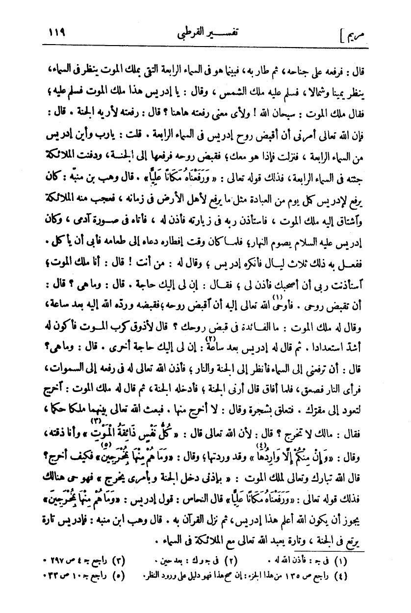 قَالَ: فَرَفَعَهُ عَلَى جَنَاحِهِ، ثُمَّ طَارَ بِهِ، فَبَيْنَمَا هُوَ فِي السَّمَاءِ الرَّابِعَةِ الْتَقَى بِمَلَكِ الْمَوْتِ يَنْظُرُ فِي السَّمَاءِ، يَنْظُرُ يَمِينًا وَشِمَالًا، فَسَلَّمَ عَلَيْهِ مَلَكُ الشَّمْسِ، وَقَالَ: يَا إِدْرِيسُ هَذَا مَلَكُ الْمَوْتِ فَسَلِّمْ عَلَيْهِ فَقَالَ مَلَكُ الموت: سبحان الله! ولاي معنى رفعته هاهنا؟ قَالَ: رَفَعْتُهُ لِأُرِيَهُ الْجَنَّةَ. قَالَ: فَإِنَّ اللَّهَ تَعَالَى أَمَرَنِي أَنْ أَقْبِضَ رُوحَ إِدْرِيسَ فِي السَّمَاءِ الرَّابِعَةِ. قُلْتُ: يَا رَبِّ وَأَيْنَ إِدْرِيسُ مِنَ السَّمَاءِ الرَّابِعَةِ، فَنَزَلْتُ فَإِذَا هُوَ مَعَكَ، فَقَبَضَ رُوحَهُ فَرَفَعَهَا إِلَى الْجَنَّةِ، وَدَفَنَتِ الْمَلَائِكَةُ جُثَّتَهُ فِي السَّمَاءِ الرَّابِعَةِ، فَذَلِكَ قَوْلُهُ تَعَالَى:" وَرَفَعْناهُ مَكاناً عَلِيًّا" قَالَ وَهْبُ بْنُ مُنَبِّهٍ: كَانَ يُرْفَعُ لِإِدْرِيسَ كُلَّ يَوْمٍ مِنَ الْعِبَادَةِ مِثْلَ مَا يُرْفَعُ لِأَهْلِ الْأَرْضِ فِي زَمَانِهِ، فَعَجِبَ مِنْهُ الْمَلَائِكَةُ وَاشْتَاقَ إِلَيْهِ مَلَكُ الْمَوْتِ، فَاسْتَأْذَنَ رَبَّهُ فِي زِيَارَتِهِ فَأَذِنَ لَهُ، فَأَتَاهُ فِي صُورَةِ آدَمِيٍّ، وَكَانَ إِدْرِيسُ عَلَيْهِ السَّلَامُ يَصُومُ النَّهَارَ، فَلَمَّا كَانَ وَقْتُ إِفْطَارِهِ دَعَاهُ إِلَى طَعَامِهِ فَأَبَى أَنْ يَأْكُلَ. فَفَعَلَ بِهِ ذَلِكَ ثَلَاثَ لَيَالٍ فَأَنْكَرَهُ إِدْرِيسُ، وَقَالَ لَهُ: مَنْ أَنْتَ! قَالَ أَنَا مَلَكُ الْمَوْتِ، اسْتَأْذَنْتُ رَبِّي أَنْ أَصْحَبَكَ فَأَذِنَ لِي، فَقَالَ: إِنَّ لِي إِلَيْكَ حَاجَةً. قَالَ: وَمَا هِيَ؟ قَالَ: أَنْ تَقْبِضَ رُوحِي. فَأَوْحَى «١» اللَّهُ تَعَالَى إِلَيْهِ أن اقبض روحه، فقبضه ورده الله إِلَيْهِ بَعْدَ سَاعَةٍ، وَقَالَ لَهُ مَلَكُ الْمَوْتِ: ما الفائدة في قبض روحك؟ قال لا ذوق كُرَبَ الْمَوْتِ فَأَكُونَ لَهُ أَشَدَّ اسْتِعْدَادًا. ثُمَّ قَالَ لَهُ إِدْرِيسُ بَعْدَ سَاعَةٍ «٢»: إِنَّ لِي إِلَيْكَ حَاجَةً أُخْرَى. قَالَ: وَمَا هِيَ؟ قَالَ أَنْ تَرْفَعَنِي إِلَى السَّمَاءِ فَأَنْظُرَ إِلَى الْجَنَّةِ وَالنَّارِ، فَأَذِنَ اللَّهُ تَعَالَى لَهُ فِي رَفْعِهِ إلى السموات، فَرَأَى النَّارَ فَصَعِقَ، فَلَمَّا أَفَاقَ قَالَ أَرِنِي الْجَنَّةَ، فَأَدْخَلَهُ الْجَنَّةَ، ثُمَّ قَالَ لَهُ مَلَكُ الْمَوْتِ: اخْرُجْ لِتَعُودَ إِلَى مَقَرِّكَ. فَتَعَلَّقَ بِشَجَرَةٍ وَقَالَ: لَا أَخْرُجُ مِنْهَا. فَبَعَثَ اللَّهُ تَعَالَى بينهما ملكا حكما، فقال مالك لَا تَخْرُجُ؟ قَالَ: لِأَنَّ اللَّهَ تَعَالَى قَالَ:" كُلُّ نَفْسٍ ذائِقَةُ الْمَوْتِ" «٣» [آل عمران: ١٨٥] وَأَنَا ذُقْتُهُ، وَقَالَ:" وَإِنْ مِنْكُمْ إِلَّا وارِدُها" «٤» [مريم: ٧١] وَقَدْ وَرَدْتُهَا، وَقَالَ:" وَما هُمْ مِنْها بِمُخْرَجِينَ" «٥» [الحجر: ٤٨] فَكَيْفَ أَخْرُجُ؟ قَالَ اللَّهُ تَبَارَكَ وَتَعَالَى لِمَلَكِ الْمَوْتِ:" بِإِذْنِي دَخَلَ الْجَنَّةَ وَبِأَمْرِي يَخْرُجُ" فَهُوَ حي هنالك فَذَلِكَ قَوْلُهُ تَعَالَى" وَرَفَعْناهُ مَكاناً عَلِيًّا" قَالَ النَّحَّاسُ: قَوْلُ إِدْرِيسَ:" وَما هُمْ مِنْها بِمُخْرَجِينَ" يَجُوزُ أَنْ يَكُونَ اللَّهُ أَعْلَمَ هَذَا إِدْرِيسَ، ثم نزل القرآن به. قال وهب ابن مُنَبِّهٍ: فَإِدْرِيسُ تَارَةً يَرْتَعُ فِي الْجَنَّةِ، وَتَارَةً يَعْبُدُ اللَّهَ تَعَالَى مَعَ الْمَلَائِكَةِ فِي السَّمَاءِ.