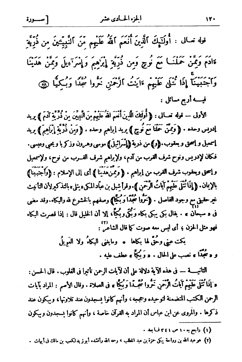 و" سُجَّداً" نُصِبَ عَلَى الْحَالِ" وَبُكِيًّا" عَطْفٌ عَلَيْهِ. الثَّانِيَةُ- فِي هَذِهِ الْآيَةِ دَلَالَةٌ عَلَى أَنَّ لِآيَاتِ الرَّحْمَنِ تَأْثِيرًا فِي الْقُلُوبِ. قَالَ الْحَسَنُ: (إِذا تُتْلى عَلَيْهِمْ آياتُ الرَّحْمنِ خَرُّوا سُجَّداً وَبُكِيًّا) الصَّلَاةِ. وَقَالَ الْأَصَمُّ: الْمُرَادُ بِآيَاتِ الرَّحْمَنِ الْكُتُبُ الْمُتَضَمِّنَةُ لِتَوْحِيدِهِ وَحُجَجِهِ، وَأَنَّهُمْ كَانُوا يَسْجُدُونَ عِنْدَ تِلَاوَتِهَا، وَيَبْكُونَ عِنْدَ ذِكْرِهَا. وَالْمَرْوِيُّ عَنِ ابْنِ عَبَّاسٍ أَنَّ الْمُرَادَ بِهِ الْقُرْآنُ خَاصَّةً، وَأَنَّهُمْ كانوا يسجدون ويبكون