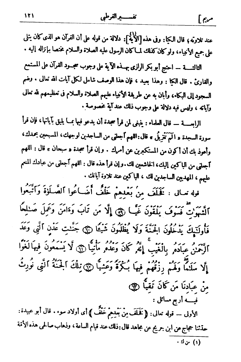 فَخَلَفَ مِنْ بَعْدِهِمْ خَلْفٌ أَضاعُوا الصَّلاةَ وَاتَّبَعُوا الشَّهَواتِ فَسَوْفَ يَلْقَوْنَ غَيًّا (٥٩) إِلاَّ مَنْ تابَ وَآمَنَ وَعَمِلَ صالِحاً فَأُولئِكَ يَدْخُلُونَ الْجَنَّةَ وَلا يُظْلَمُونَ شَيْئاً (٦٠) جَنَّاتِ عَدْنٍ الَّتِي وَعَدَ الرَّحْمنُ عِبادَهُ بِالْغَيْبِ إِنَّهُ كانَ وَعْدُهُ مَأْتِيًّا (٦١) لَا يَسْمَعُونَ فِيها لَغْواً إِلاَّ سَلاماً وَلَهُمْ رِزْقُهُمْ فِيها بُكْرَةً وَعَشِيًّا (٦٢) تِلْكَ الْجَنَّةُ الَّتِي نُورِثُ مِنْ عِبادِنا مَنْ كانَ تَقِيًّا (٦٣)
