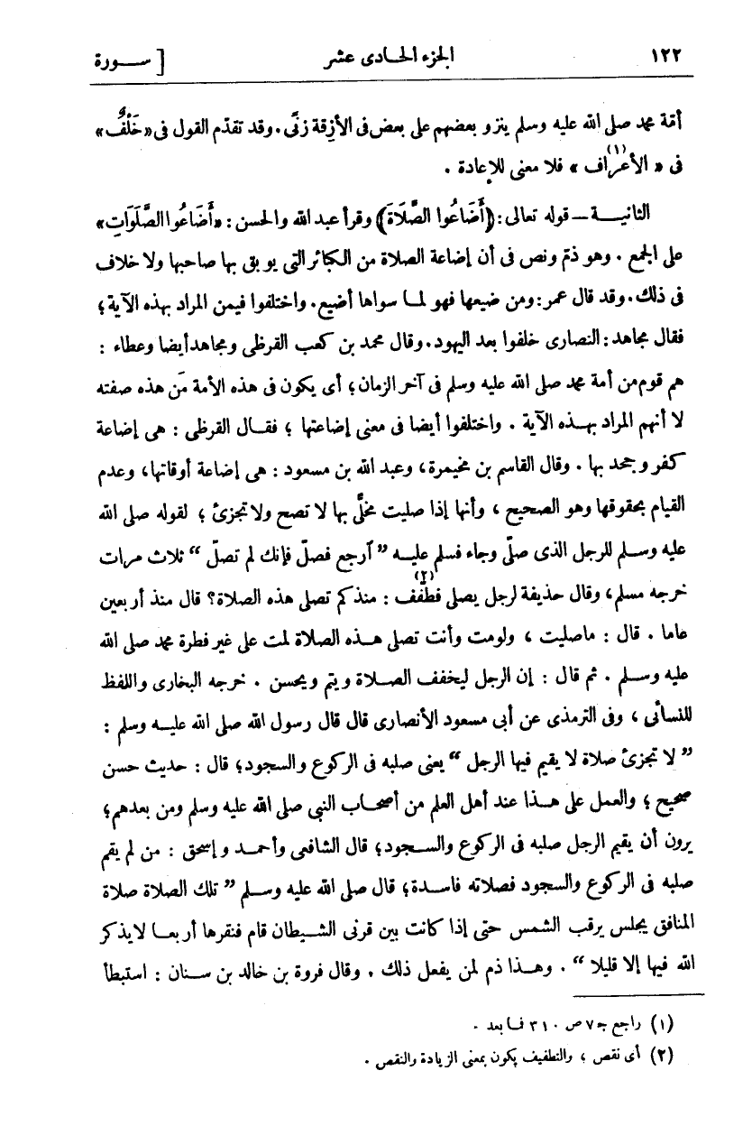 أُمَّةِ مُحَمَّدٍ صَلَّى اللَّهُ عَلَيْهِ وَسَلَّمَ يَنْزُو بَعْضُهُمْ عَلَى بَعْضٍ فِي الْأَزِقَّةِ زِنًى. وَقَدْ تَقَدَّمَ الْقَوْلُ فِي" خَلْفٌ ٨٠" فِي" الْأَعْرَافِ" «١» فَلَا مَعْنَى لِلْإِعَادَةِ. الثَّانِيَةُ- قَوْلُهُ تَعَالَى: (أَضاعُوا الصَّلاةَ) وَقَرَأَ عَبْدُ اللَّهِ وَالْحَسَنُ:" أَضَاعُوا الصَّلَوَاتِ" عَلَى الْجَمْعِ. وَهُوَ ذَمٌّ وَنَصٌّ فِي أَنَّ إِضَاعَةَ الصَّلَاةِ مِنَ الْكَبَائِرِ الَّتِي يُوبَقُ بِهَا صَاحِبُهَا وَلَا خِلَافَ فِي ذَلِكَ، وَقَدْ قَالَ عُمَرُ: وَمَنْ ضَيَّعَهَا فَهُوَ لِمَا سِوَاهَا أَضْيَعُ. وَاخْتَلَفُوا فِيمَنِ الْمُرَادُ بِهَذِهِ الْآيَةِ، فَقَالَ مُجَاهِدٌ: النَّصَارَى خَلَفُوا بَعْدَ الْيَهُودِ. وَقَالَ مُحَمَّدُ بْنُ كَعْبٍ الْقُرَظِيُّ وَمُجَاهِدٌ أَيْضًا وَعَطَاءٌ: هُمْ قَوْمٌ مِنْ أُمَّةِ مُحَمَّدٍ صَلَّى اللَّهُ عَلَيْهِ وَسَلَّمَ فِي آخِرِ الزَّمَانِ، أَيْ يَكُونُ فِي هَذِهِ الْأُمَّةِ مَنْ هَذِهِ صِفَتُهُ لَا أَنَّهُمُ الْمُرَادُ بِهَذِهِ الْآيَةِ. وَاخْتَلَفُوا أَيْضًا فِي مَعْنَى إِضَاعَتِهَا، فَقَالَ الْقُرَظِيُّ: هِيَ إِضَاعَةُ كُفْرٍ وَجَحْدٍ بِهَا. وَقَالَ الْقَاسِمُ بْنُ مُخَيْمِرَةَ، وَعَبْدُ اللَّهِ بْنُ مَسْعُودٍ: هِيَ إِضَاعَةُ أَوْقَاتِهَا، وَعَدَمُ الْقِيَامِ بِحُقُوقِهَا وَهُوَ الصَّحِيحُ، وَأَنَّهَا إِذَا صُلِّيَتْ مُخَلًّى بِهَا لَا تَصِحُّ وَلَا تُجْزِئُ، لِقَوْلِهِ صَلَّى اللَّهُ عَلَيْهِ وَسَلَّمَ لِلرَّجُلِ الَّذِي صَلَّى وَجَاءَ فَسَلَّمَ عَلَيْهِ (ارْجِعْ فَصَلِّ فَإِنَّكَ لَمْ تُصَلِّ) ثَلَاثَ مَرَّاتٍ خَرَّجَهُ مُسْلِمٌ، وَقَالَ حُذَيْفَةُ لِرَجُلٍ يُصَلِّي فَطَفَّفَ «٢»: مُنْذُ كَمْ تُصَلِّي هَذِهِ الصَّلَاةَ؟ قَالَ مُنْذُ أَرْبَعِينَ عَامًا. قَالَ: مَا صَلَّيْتَ، وَلَوْ مِتَّ وَأَنْتَ تُصَلِّي هَذِهِ الصَّلَاةَ لَمِتَّ عَلَى غَيْرِ فِطْرَةِ مُحَمَّدٍ صَلَّى اللَّهُ عَلَيْهِ وَسَلَّمَ. ثُمَّ قَالَ: إِنَّ الرَّجُلَ لَيُخَفِّفُ الصَّلَاةَ وَيُتِمُّ وَيُحْسِنُ. خَرَّجَهُ الْبُخَارِيُّ وَاللَّفْظُ لِلنَّسَائِيِّ، وَفِي التِّرْمِذِيِّ عَنْ أَبِي مَسْعُودٍ الْأَنْصَارِيِّ قَالَ قَالَ رَسُولُ اللَّهِ صَلَّى اللَّهُ عَلَيْهِ وَسَلَّمَ: (لَا تُجْزِئُ صَلَاةٌ لَا يُقِيمُ فِيهَا الرَّجُلُ) يَعْنِي صُلْبَهُ فِي الرُّكُوعِ وَالسُّجُودِ، قَالَ: حَدِيثٌ حَسَنٌ صَحِيحٌ، وَالْعَمَلُ عَلَى هَذَا عِنْدَ أَهْلِ الْعِلْمِ مِنْ أَصْحَابِ النَّبِيِّ صَلَّى اللَّهُ عَلَيْهِ وَسَلَّمَ وَمَنْ بَعْدَهُمْ، يَرَوْنَ أَنْ يُقِيمَ الرَّجُلُ صُلْبَهُ فِي الرُّكُوعِ وَالسُّجُودِ، قَالَ الشَّافِعِيُّ وَأَحْمَدُ وَإِسْحَاقُ: مَنْ لَمْ يُقِمْ صُلْبَهُ فِي الرُّكُوعِ وَالسُّجُودِ فَصَلَاتُهُ فَاسِدَةٌ، قَالَ صَلَّى اللَّهُ عَلَيْهِ وَسَلَّمَ (تِلْكَ الصَّلَاةُ صَلَاةُ الْمُنَافِقِ يَجْلِسُ يَرْقُبُ الشَّمْسَ حَتَّى إِذَا كَانَتْ بَيْنَ قَرْنَيِ الشَّيْطَانِ قَامَ فَنَقَرَهَا أَرْبَعًا لَا يَذْكُرُ اللَّهَ فِيهَا إِلَّا قَلِيلًا (. وَهَذَا ذَمٌّ لِمَنْ يَفْعَلُ ذَلِكَ. وَقَالَ فَرْوَةُ بْنُ خالد بن سنان: استبطأ