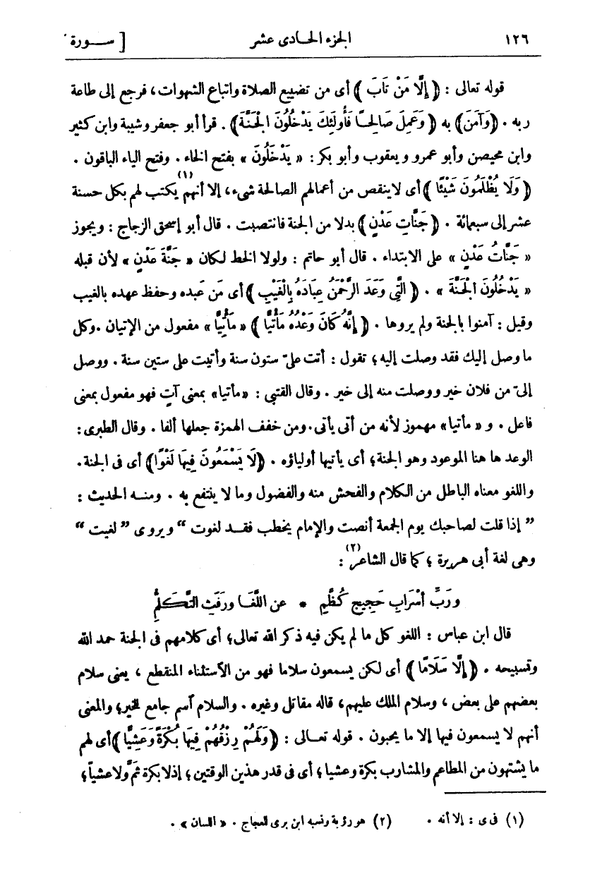 قَوْلُهُ تَعَالَى: (إِلَّا مَنْ تابَ) ٦٠ أَيْ مِنْ تَضْيِيعِ الصَّلَاةِ وَاتِّبَاعِ الشَّهَوَاتِ فَرَجَعَ إِلَى طَاعَةِ رَبِّهِ. (وَآمَنَ) ١١٠ بِهِ (وَعَمِلَ صالِحاً فَأُولئِكَ يَدْخُلُونَ الْجَنَّةَ) ٦٠. قَرَأَ أَبُو جَعْفَرٍ وَشَيْبَةُ وَابْنُ كَثِيرٍ وَابْنُ مُحَيْصِنٍ وَأَبُو عَمْرٍو وَيَعْقُوبُ وَأَبُو بَكْرٍ: (يُدْخَلُونَ) بِفَتْحِ الْخَاءِ. وَفَتَحَ الْيَاءَ الْبَاقُونَ. (وَلا يُظْلَمُونَ شَيْئاً) ٦٠ أَيْ لَا يُنْقَصُ مِنْ أَعْمَالِهِمُ الصالحة شي إِلَّا أَنَّهُمْ «١» يُكْتَبُ لَهُمْ بِكُلِّ حَسَنَةٍ عَشْرٌ إِلَى سَبْعِمِائَةٍ. (جَنَّاتِ عَدْنٍ) بَدَلًا مِنَ الْجَنَّةِ فَانْتَصَبَتْ. قَالَ أَبُو إِسْحَاقَ الزَّجَّاجُ: وَيَجُوزُ" جَنَّاتُ عَدْنٍ" عَلَى الِابْتِدَاءِ. قَالَ أَبُو حَاتِمٍ: وَلَوْلَا الْخَطُّ لَكَانَ" جَنَّةِ عَدْنٍ" لِأَنَّ قَبْلَهُ" يَدْخُلُونَ الْجَنَّةَ". (الَّتِي وَعَدَ الرَّحْمنُ عِبادَهُ بِالْغَيْبِ) أي من عبده وحفظ عهده بالغيب وقيل: آمنوا بالجنة ولم يروها.- إنه كان وعده مأتيا (" مَأْتِيًّا" مَفْعُولٌ مِنَ الْإِتْيَانِ. وَكُلُّ مَا وَصَلَ إِلَيْكَ فَقَدْ وَصَلْتَ إِلَيْهِ تَقُولُ: أَتَتْ عَلَيَّ سِتُّونَ سَنَةً وَأَتَيْتُ عَلَى سِتِّينَ سَنَةً. وَوَصَلَ إِلَيَّ مِنْ فُلَانٍ خَيْرٌ وَوَصَلْتُ مِنْهُ إِلَى خَيْرٍ. وَقَالَ الْقُتَبِيُّ:" مَأْتِيًّا" بِمَعْنَى آتٍ فَهُوَ مَفْعُولٌ بِمَعْنَى فَاعِلٍ. وَ" مَأْتِيًّا" مَهْمُوزٌ لِأَنَّهُ مِنْ أَتَى يَأْتِي. وَمَنْ خَفَّفَ الْهَمْزَةَ جَعَلَهَا أَلِفًا. وَقَالَ الطَّبَرِيُّ: الْوَعْدُ هَاهُنَا الْمَوْعُودُ وَهُوَ الْجَنَّةُ أَيْ يَأْتِيهَا أَوْلِيَاؤُهُ. (لَا يَسْمَعُونَ فِيها لَغْواً) أَيْ فِي الْجَنَّةِ. وَاللَّغْوُ مَعْنَاهُ الْبَاطِلُ مِنَ الْكَلَامِ وَالْفُحْشُ مِنْهُ وَالْفُضُولُ وَمَا لَا يُنْتَفَعُ بِهِ. وَمِنْهُ الْحَدِيثُ: (إِذَا قُلْتَ لِصَاحِبِكَ يَوْمَ الْجُمُعَةِ أَنْصِتْ وَالْإِمَامُ يَخْطُبُ فَقَدْ لَغَوْتَ) وَيُرْوَى" لَغَيْتَ" وَهِيَ لُغَةُ أَبِي هُرَيْرَةَ كَمَا قال الشاعر «٢»: