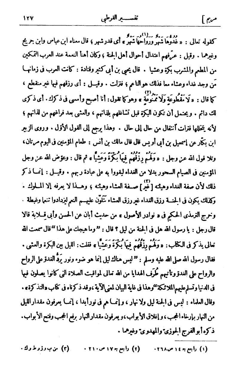كَقَوْلِهِ تَعَالَى:" غُدُوُّها شَهْرٌ وَرَواحُها «١» شَهْرٌ" أَيْ قَدْرَ شَهْرٍ، قَالَ مَعْنَاهُ ابْنُ عَبَّاسٍ وَابْنُ جُرَيْجٍ وَغَيْرُهُمَا. وَقِيلَ: عَرَّفَهُمُ اعْتِدَالَ أَحْوَالِ أَهْلِ الْجَنَّةِ وَكَانَ أَهْنَأَ النِّعْمَةِ عِنْدَ الْعَرَبِ التَّمْكِينُ مِنَ الْمَطْعَمِ وَالْمَشْرَبِ بُكْرَةً وَعَشِيًّا. قَالَ يَحْيَى بْنُ أَبِي كَثِيرٍ وَقَتَادَةُ كَانَتِ الْعَرَبُ فِي زَمَانِهَا مَنْ وَجَدَ غَدَاءً وَعَشَاءً مَعًا فَذَلِكَ هُوَ النَّاعِمُ فَنَزَلَتْ. وَقِيلَ: أَيْ رِزْقُهُمْ فِيهَا غَيْرُ مُنْقَطِعٍ كَمَا قَالَ: (لَا مَقْطُوعَةٍ وَلَا ممنوعة) «٢» كَمَا تَقُولُ: أَنَا أُصْبِحُ وَأُمْسِي فِي ذِكْرِكَ. أَيْ ذِكْرِي لَكَ دَائِمٌ. وَيَحْتَمِلُ أَنْ تَكُونَ الْبُكْرَةُ قَبْلَ تَشَاغُلِهِمْ بِلَذَّاتِهِمْ وَالْعَشِيُّ بَعْدَ فَرَاغِهِمْ مِنْ لَذَّاتِهِمْ لِأَنَّهُ يَتَخَلَّلُهَا فَتَرَاتُ انْتِقَالٍ مِنْ حَالٍ إِلَى حَالٍ. وَهَذَا يَرْجِعُ إِلَى الْقَوْلِ الْأَوَّلِ. وَرَوَى الزُّبَيْرُ بْنُ بَكَّارٍ عَنْ إِسْمَاعِيلَ بْنِ أَبِي أُوَيْسٍ قَالَ قَالَ مَالِكُ بْنُ أَنَسٍ: طَعَامُ الْمُؤْمِنِينَ فِي الْيَوْمِ مَرَّتَانِ وَتَلَا قَوْلَ اللَّهِ عَزَّ وَجَلَّ" وَلَهُمْ رِزْقُهُمْ فِيها بُكْرَةً وَعَشِيًّا" ثُمَّ قَالَ: وَعَوَّضَ اللَّهُ عَزَّ وَجَلَّ الْمُؤْمِنِينَ فِي الصِّيَامِ السَّحُورَ بَدَلًا مِنَ الْغَدَاءِ لِيَقْوَوْا بِهِ عَلَى عِبَادَةِ رَبِّهِمْ. وَقِيلَ: إِنَّمَا ذَكَرَ ذَلِكَ لِأَنَّ صِفَةَ الْغَدَاءِ وَهَيْئَتَهُ [غير «٣»] صِفَةِ الْعَشَاءِ وَهَيْئَتِهِ، وَهَذَا لَا يَعْرِفُهُ إِلَّا الْمُلُوكُ. وَكَذَلِكَ يَكُونُ فِي الْجَنَّةِ رِزْقُ الْغَدَاءِ غَيْرَ رِزْقِ الْعَشَاءِ تَتَلَوَّنُ عَلَيْهِمُ النِّعَمُ لِيَزْدَادُوا تَنَعُّمًا وَغِبْطَةً. وَخَرَّجَ التِّرْمِذِيُّ الْحَكِيمُ فِي (نَوَادِرِ الْأُصُولِ) مِنْ حَدِيثِ أَبَانٍ عَنِ الْحَسَنِ وَأَبِي قِلَابَةَ قَالَا قَالَ رَجُلٌ: يَا رَسُولَ اللَّهِ هَلْ فِي الْجَنَّةِ مِنْ لَيْلٍ؟ قَالَ (وَمَا هَيَّجَكَ عَلَى هَذَا) قَالَ سَمِعْتُ اللَّهَ تَعَالَى يَذْكُرُ فِي الْكِتَابِ:" وَلَهُمْ رِزْقُهُمْ فِيها بُكْرَةً وَعَشِيًّا" فقلت: الليل بين البكرة والعشي. فَقَالَ رَسُولُ اللَّهِ صَلَّى اللَّهُ عَلَيْهِ وَسَلَّمَ: (لَيْسَ هُنَاكَ لَيْلٌ إِنَّمَا هُوَ ضَوْءٌ وَنُورٌ يَرُدُّ الْغُدُوَّ عَلَى الرَّوَاحِ وَالرَّوَاحَ عَلَى الْغُدُوِّ وَتَأْتِيهِمْ طُرَفُ الْهَدَايَا مِنَ اللَّهِ تَعَالَى لِمَوَاقِيتِ الصَّلَاةِ الَّتِي كَانُوا يُصَلُّونَ فِيهَا فِي الدُّنْيَا وَتُسَلِّمُ عَلَيْهِمُ الْمَلَائِكَةُ) وَهَذَا فِي غَايَةِ الْبَيَانِ لِمَعْنَى الْآيَةِ وَقَدْ ذَكَرْنَاهُ فِي كِتَابِ (التَّذْكِرَةِ). وَقَالَ الْعُلَمَاءُ: لَيْسَ فِي الْجَنَّةِ لَيْلٌ وَلَا نَهَارٌ وَإِنَّمَا هُمْ فِي نُورٍ أَبَدًا إِنَّمَا يَعْرِفُونَ مِقْدَارَ اللَّيْلِ مِنَ النَّهَارِ بِإِرْخَاءِ الْحُجُبِ وَإِغْلَاقِ الْأَبْوَابِ وَيَعْرِفُونَ مِقْدَارَ النَّهَارِ بِرَفْعِ الْحُجُبِ وَفَتْحِ الْأَبْوَابِ. ذَكَرَهُ أَبُو الْفَرَجِ الْجَوْزِيُّ وَالْمَهْدَوِيُّ وغيرهما.