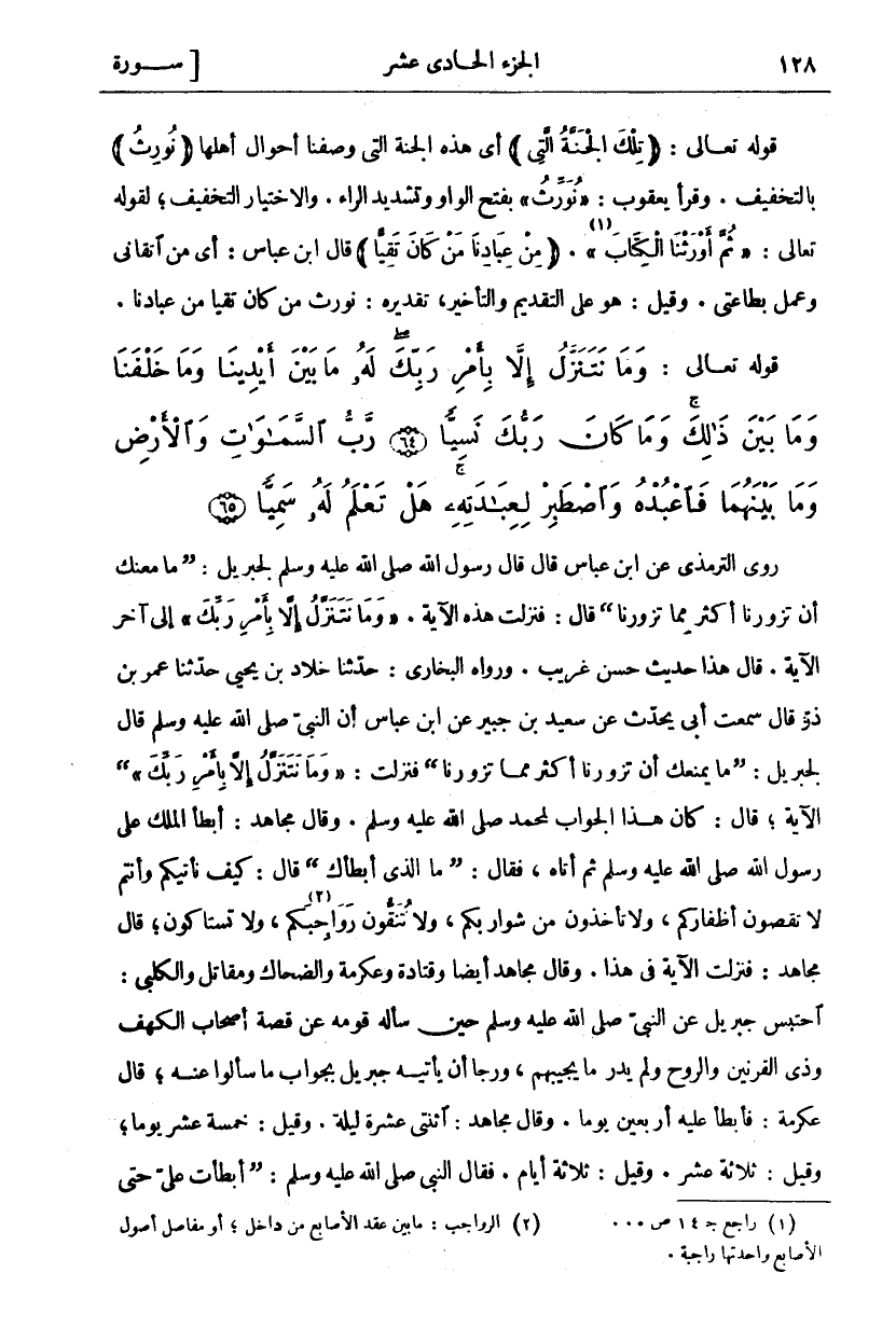 رَوَى التِّرْمِذِيُّ عَنِ ابْنِ عَبَّاسٍ قَالَ قَالَ رَسُولُ اللَّهِ صلى لِجِبْرِيلَ (مَا مَنَعَكَ أَنْ تَزُورَنَا أَكْثَرَ مِمَّا تَزُورُنَا) قَالَ: فَنَزَلَتْ هَذِهِ الْآيَةُ (وَما نَتَنَزَّلُ إِلَّا بِأَمْرِ رَبِّكَ) إِلَى آخِرِ الْآيَةِ. قَالَ هَذَا حَدِيثٌ حَسَنٌ غَرِيبٌ. وَرَوَاهُ الْبُخَارِيُّ: حَدَّثَنَا خلال بْنُ يَحْيَى حَدَّثَنَا عُمَرُ بْنُ ذَرٍّ قَالَ سَمِعْتُ أَبِي يُحَدِّثُ عَنْ سَعِيدِ بْنِ جُبَيْرٍ عَنِ ابْنِ عَبَّاسٍ أَنَّ النَّبِيَّ صَلَّى اللَّهُ عَلَيْهِ وَسَلَّمَ قَالَ لِجِبْرِيلَ: (مَا يَمْنَعُكَ أَنْ تزورنا أكثر مما تزرونا) فَنَزَلَتْ:" وَما نَتَنَزَّلُ إِلَّا بِأَمْرِ رَبِّكَ" الْآيَةَ، قَالَ كَانَ هَذَا الْجَوَابُ لِمُحَمَّدٍ صَلَّى اللَّهُ عَلَيْهِ وَسَلَّمَ. وَقَالَ مُجَاهِدٌ أَبْطَأَ الْمَلَكُ عَلَى رَسُولِ اللَّهِ صَلَّى اللَّهُ عَلَيْهِ وَسَلَّمَ ثُمَّ أَتَاهُ فَقَالَ: (مَا الَّذِي أَبْطَأَكَ) قَالَ: كَيْفَ نَأْتِيكُمْ وَأَنْتُمْ لَا تَقُصُّونَ أَظْفَارَكُمْ وَلَا تَأْخُذُونَ مِنْ شَوَارِبِكُمْ، وَلَا تُنَقُّونَ رَوَاجِبَكُمْ «٢»، وَلَا تَسْتَاكُونَ، قَالَ مُجَاهِدٌ: فَنَزَلَتِ الْآيَةُ فِي هَذَا. وَقَالَ مُجَاهِدٌ أَيْضًا وَقَتَادَةُ وَعِكْرِمَةُ وَالضَّحَّاكُ وَمُقَاتِلٌ وَالْكَلْبِيُّ: احْتَبَسَ جِبْرِيلُ عَنِ النَّبِيِّ صَلَّى اللَّهُ عَلَيْهِ وَسَلَّمَ حِينَ سَأَلَهُ قَوْمُهُ عَنْ قِصَّةِ أَصْحَابِ الْكَهْفِ وَذِي الْقَرْنَيْنِ وَالرُّوحِ وَلَمْ يَدْرِ مَا يُجِيبُهُمْ وَرَجَا أَنْ يَأْتِيَهُ جِبْرِيلُ بِجَوَابِ مَا سَأَلُوهُ عَنْهُ قَالَ عِكْرِمَةُ: فَأَبْطَأَ عَلَيْهِ أَرْبَعِينَ يَوْمًا. وَقَالَ مُجَاهِدٌ: اثْنَتَيْ عَشْرَةَ لَيْلَةً. وَقِيلَ: خَمْسَةَ عَشَرَ يَوْمًا وَقِيلَ ثَلَاثَةَ عَشَرَ وَقِيلَ ثَلَاثَةَ أَيَّامٍ فَقَالَ النَّبِيُّ صَلَّى اللَّهُ عَلَيْهِ وَسَلَّمَ (أبطأت علي حتى