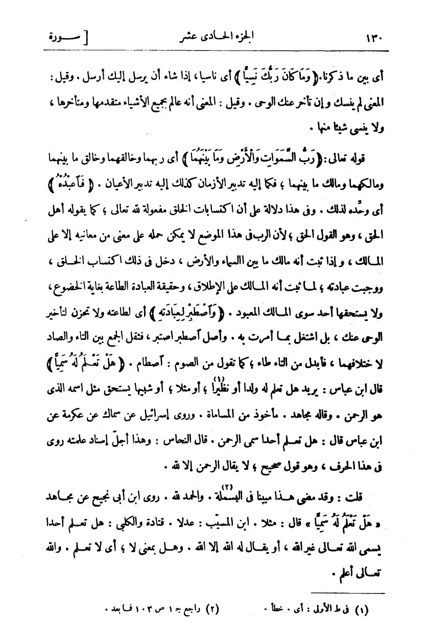 أَيْ بَيْنَ مَا ذَكَرْنَا. (وَما كانَ رَبُّكَ نَسِيًّا) أَيْ نَاسِيًا إِذَا شَاءَ أَنْ يُرْسِلَ إِلَيْكَ أَرْسَلَ وَقِيلَ: الْمَعْنَى لَمْ يَنْسَكَ وَإِنْ تَأَخَّرَ عَنْكَ الْوَحْيُ. وَقِيلَ: الْمَعْنَى أَنَّهُ عَالِمٌ بِجَمِيعِ الْأَشْيَاءِ مُتَقَدِّمِهَا وَمُتَأَخِّرِهَا وَلَا يَنْسَى شَيْئًا مِنْهَا. قَوْلُهُ تَعَالَى: (رَبُّ السَّماواتِ وَالْأَرْضِ وَما بَيْنَهُما) أَيْ رَبُّهُمَا وَخَالِقُهُمَا وَخَالِقُ مَا بَيْنَهُمَا وَمَالِكُهُمَا وَمَالِكُ مَا بَيْنَهُمَا، فَكَمَا إِلَيْهِ تَدْبِيرُ الْأَزْمَانِ كَذَلِكَ إِلَيْهِ تَدْبِيرُ الْأَعْيَانِ. (فَاعْبُدْهُ) أَيْ وَحِّدُهُ لِذَلِكَ. وَفِي هَذَا دَلَالَةٌ عَلَى أَنَّ اكْتِسَابَاتِ الْخَلْقِ مَفْعُولَةٌ لِلَّهِ تَعَالَى كَمَا يَقُولُهُ أَهْلُ الْحَقِّ وَهُوَ الْقَوْلُ الْحَقُّ لِأَنَّ الرَّبَّ في هذا الموضع لَا يُمْكِنُ حَمْلُهُ عَلَى مَعْنًى مِنْ مَعَانِيهِ إِلَّا عَلَى الْمَالِكِ وَإِذَا ثَبَتَ أَنَّهُ مَالِكُ مَا بَيْنَ السَّمَاءِ وَالْأَرْضِ دَخَلَ فِي ذَلِكَ اكْتِسَابُ الْخَلْقِ وَوَجَبَتْ عِبَادَتُهُ لِمَا ثَبَتَ أَنَّهُ الْمَالِكُ عَلَى الْإِطْلَاقِ وَحَقِيقَةُ الْعِبَادَةِ الطَّاعَةُ بِغَايَةِ الْخُضُوعِ وَلَا يَسْتَحِقُّهَا أَحَدٌ سِوَى الْمَالِكِ الْمَعْبُودِ. (وَاصْطَبِرْ لِعِبادَتِهِ) أَيْ لِطَاعَتِهِ وَلَا تَحْزَنْ لِتَأْخِيرِ الْوَحْيِ عَنْكَ بَلِ اشْتَغِلْ بِمَا أُمِرْتَ بِهِ. وَأَصْلُ اصْطَبِرِ اصْتَبِرْ فَثَقُلَ الْجَمْعُ بَيْنَ التَّاءِ وَالصَّادِ لِاخْتِلَافِهِمَا فَأُبْدِلَ مِنَ التَّاءِ طَاءٌ كَمَا تَقُولُ مِنَ الصَّوْمِ: اصْطَامَ. (هَلْ تَعْلَمُ لَهُ سَمِيًّا) قَالَ ابْنُ عَبَّاسٍ: يُرِيدُ هَلْ تَعْلَمُ لَهُ وَلَدًا أَيْ نَظِيرًا «١»، أَوْ مِثْلًا أَوْ شَبِيهًا يَسْتَحِقُّ مِثْلَ اسْمِهِ الَّذِي هُوَ الرَّحْمَنُ. وقاله مُجَاهِدٌ. مَأْخُوذٌ مِنَ الْمُسَامَاةِ. وَرَوَى إِسْرَائِيلُ عَنْ سِمَاكٍ عَنْ عِكْرِمَةَ عَنِ ابْنِ عَبَّاسٍ قَالَ: هَلْ تَعْلَمُ لَهُ أَحَدًا سُمِّيَ الرَّحْمَنُ. قَالَ النَّحَّاسُ: وَهَذَا أَجَلُّ إِسْنَادٍ عَلِمْتُهُ رُوِيَ فِي هَذَا الْحَرْفِ وَهُوَ قَوْلٌ صَحِيحٌ وَلَا يُقَالُ الرَّحْمَنُ إِلَّا لِلَّهِ. قُلْتُ وَقَدْ مَضَى هَذَا مبينا في البسملة «٢». والحمد لِلَّهِ. رَوَى ابْنُ أَبِي نَجِيحٍ عَنْ مُجَاهِدٍ (هَلْ تَعْلَمُ لَهُ سَمِيًّا) قَالَ: مِثْلًا. ابْنُ الْمُسَيَّبُ: عِدْلًا. قَتَادَةُ وَالْكَلْبِيُّ هَلْ تَعْلَمُ أَحَدًا يُسَمَّى اللَّهَ تَعَالَى غَيْرَ اللَّهِ أَوْ يُقَالُ لَهُ اللَّهُ إِلَّا اللَّهُ وَهَلْ بِمَعْنَى لَا، أي لا تعلم. والله تعالى أعلم.