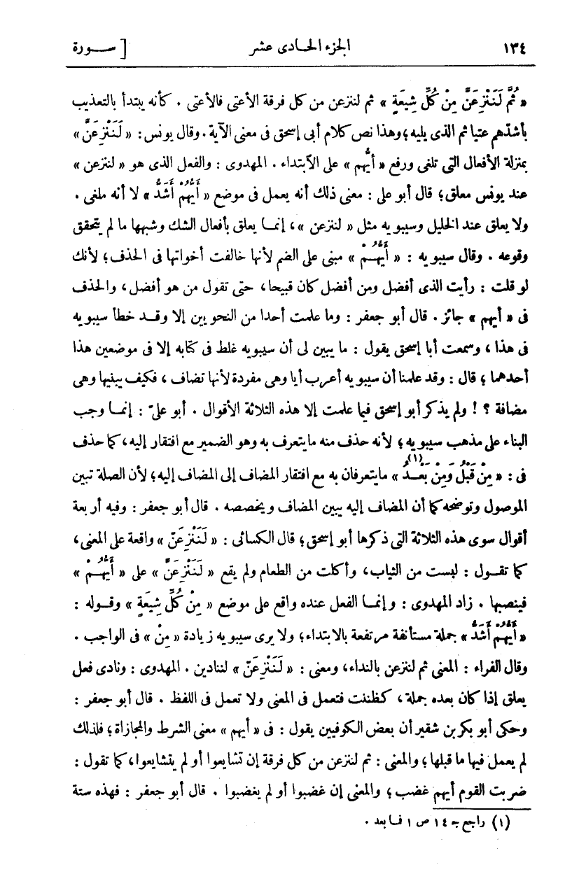 " ثُمَّ لَنَنْزِعَنَّ مِنْ كُلِّ شِيعَةٍ" ثُمَّ لَنَنْزِعَنَّ مِنْ كُلِّ فِرْقَةٍ الْأَعْتَى فَالْأَعْتَى. كَأَنَّهُ يُبْتَدَأُ بِالتَّعْذِيبِ بِأَشَدِّهِمْ عِتِيًّا ثُمَّ الَّذِي يَلِيهِ وَهَذَا نَصُّ كَلَامِ أَبِي إِسْحَاقَ فِي مَعْنَى الْآيَةِ. وَقَالَ يُونُسُ:" لَنَنْزِعَنَّ" بِمَنْزِلَةِ الْأَفْعَالِ الَّتِي تُلْغَى ورفع" أَيُّهُمْ" على الابتداء. المهدوي: والفعل هُوَ" لَنَنْزِعَنَّ" عِنْدَ يُونُسَ مُعَلَّقٌ قَالَ أَبُو عَلِيٍّ: مَعْنَى ذَلِكَ أَنَّهُ يَعْمَلُ فِي مَوْضِعِ" أَيُّهُمْ أَشَدُّ" لَا أَنَّهُ مُلْغًى. وَلَا يُعَلَّقُ عِنْدَ الْخَلِيلِ وَسِيبَوَيْهِ مِثْلَ" لَنَنْزِعَنَّ" إِنَّمَا يُعَلَّقُ بِأَفْعَالِ الشَّكِّ وَشَبَهِهَا مَا لَمْ يَتَحَقَّقْ وُقُوعُهُ. وَقَالَ سِيبَوَيْهِ:" أَيُّهُمْ" مَبْنِيٌّ عَلَى الضَّمِّ لِأَنَّهَا خَالَفَتْ أَخَوَاتِهَا فِي الْحَذْفِ، لِأَنَّكَ لَوْ قُلْتَ: رَأَيْتُ الَّذِي أَفْضَلُ وَمَنْ أَفْضَلُ كَانَ قَبِيحًا، حَتَّى تَقُولَ مَنْ هُوَ أَفْضَلُ، وَالْحَذْفُ فِي" أَيِّهِمْ" جَائِزٌ. قَالَ أَبُو جَعْفَرٍ: وَمَا عَلِمْتُ أَحَدًا مِنَ النَّحْوِيِّينَ إِلَّا وَقَدْ خَطَّأَ سِيبَوَيْهِ فِي هَذَا وَسَمِعْتُ أَبَا إِسْحَاقَ يَقُولُ: مَا يَبِينُ لِي أَنَّ سِيبَوَيْهِ غَلِطَ فِي كِتَابِهِ إِلَّا فِي مَوْضِعَيْنِ هَذَا أَحَدُهُمَا، قَالَ: وَقَدْ عَلِمْنَا أَنَّ سِيبَوَيْهِ أَعْرَبَ أَيًّا وَهِيَ مُفْرَدَةٌ لِأَنَّهَا تُضَافُ، فَكَيْفَ يَبْنِيهَا وَهِيَ مُضَافَةٌ؟! وَلَمْ يَذْكُرْ أَبُو إِسْحَاقَ فِيمَا عَلِمْتُ إِلَّا هَذِهِ الثَّلَاثَةَ الْأَقْوَالِ. أَبُو عَلِيٍّ: إِنَّمَا وَجَبَ الْبِنَاءُ عَلَى مَذْهَبِ سِيبَوَيْهِ لِأَنَّهُ حَذَفَ مِنْهُ مَا يَتَعَرَّفُ بِهِ وَهُوَ الضَّمِيرُ مَعَ افْتِقَارٍ إِلَيْهِ كَمَا حُذِفَ فِي" مِنْ قَبْلُ وَمِنْ بَعْدُ ٣٠: ٤" «١» مَا يَتَعَرَّفَانِ بِهِ مَعَ افْتِقَارِ الْمُضَافِ إِلَى الْمُضَافِ إِلَيْهِ لِأَنَّ الصِّلَةَ تُبَيِّنُ الْمَوْصُولَ وَتُوَضِّحُهُ كَمَا أَنَّ الْمُضَافَ إِلَيْهِ يُبَيِّنُ الْمُضَافَ وَيُخَصِّصُهُ. قَالَ أَبُو جَعْفَرٍ: وَفِيهِ أَرْبَعَةُ أَقْوَالٍ سِوَى هَذِهِ الثَّلَاثَةِ الَّتِي ذَكَرَهَا أَبُو إِسْحَاقَ قَالَ الْكِسَائِيُّ:" لَنَنْزِعَنَّ" وَاقِعَةٌ عَلَى الْمَعْنَى كَمَا تَقُولُ: لَبِسْتُ مِنَ الثِّيَابِ وَأَكَلْتُ مِنَ الطَّعَامِ وَلَمْ يَقَعْ" لَنَنْزِعَنَّ" عَلَى" أَيُّهُمْ" فَيَنْصِبَهَا. زَادَ الْمَهْدَوِيُّ: وَإِنَّمَا الْفِعْلُ عِنْدَهُ وَاقِعٌ عَلَى مَوْضِعِ" مِنْ كُلِّ شِيعَةٍ" وَقَوْلُهُ:" أَيُّهُمْ أَشَدُّ" جُمْلَةٌ مُسْتَأْنَفَةٌ مُرْتَفِعَةٌ بِالِابْتِدَاءِ وَلَا يَرَى سِيبَوَيْهِ زِيَادَةَ" مِنْ" فِي الْوَاجِبِ. وَقَالَ الْفَرَّاءُ: الْمَعْنَى ثُمَّ لَنَنْزِعَنَّ بِالنِّدَاءِ وَمَعْنَى:" لَنَنْزِعَنَّ" لَنُنَادِيَنَّ. الْمَهْدَوِيُّ: وَنَادَى فِعْلٌ يُعَلَّقُ إِذَا كَانَ بَعْدَهُ جُمْلَةٌ كَظَنَنْتُ فَتَعْمَلُ فِي الْمَعْنَى وَلَا تَعْمَلُ فِي اللَّفْظِ قَالَ أَبُو جَعْفَرٍ وَحَكَى أَبُو بَكْرِ بْنُ شُقَيْرٍ أَنَّ بَعْضَ الْكُوفِيِّينَ يَقُولُ فِي" أَيُّهُمْ" مَعْنَى الشَّرْطِ وَالْمُجَازَاةِ فَلِذَلِكَ لَمْ يَعْمَلْ فِيهَا مَا قَبْلَهَا وَالْمَعْنَى: ثُمَّ لَنَنْزِعَنَّ مِنْ كُلِّ فِرْقَةٍ إِنْ تَشَايَعُوا أَوْ لَمْ يَتَشَايَعُوا كَمَا تَقُولُ: ضَرَبْتُ الْقَوْمَ أَيُّهُمْ غَضِبَ وَالْمَعْنَى إِنْ غَضِبُوا أَوْ لَمْ يَغْضَبُوا قَالَ أَبُو جَعْفَرٍ فَهَذِهِ ستة