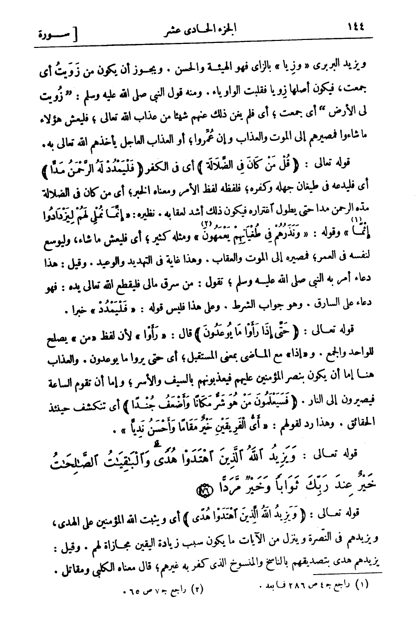 وَيَزِيدَ الْبَرْبَرِيِّ" وَزِيًّا" بِالزَّايِ فَهُوَ الْهَيْئَةُ وَالْحُسْنُ. وَيَجُوزُ أَنْ يَكُونَ مِنْ زَوَيْتُ أَيْ جَمَعْتُ، فَيَكُونُ أَصْلُهَا زَوِيًّا فَقُلِبَتِ الْوَاوُ يَاءً. وَمِنْهُ قَوْلُ النَّبِيِّ صَلَّى اللَّهُ عَلَيْهِ وَسَلَّمَ: (زُوِيَتْ لِي الْأَرْضُ) أَيْ جُمِعَتْ، أَيْ فَلَمْ يُغْنِ ذَلِكَ عَنْهُمْ شَيْئًا مِنْ عَذَابِ اللَّهِ تَعَالَى، فَلْيَعِشْ هَؤُلَاءِ مَا شَاءُوا فَمَصِيرُهُمْ إِلَى الْمَوْتِ وَالْعَذَابِ وَإِنْ عُمِّرُوا، أَوِ الْعَذَابِ الْعَاجِلِ يَأْخُذُهُمُ اللَّهُ تَعَالَى بِهِ. قَوْلُهُ تَعَالَى: (قُلْ مَنْ كانَ فِي الضَّلالَةِ) أَيْ فِي الْكُفْرِ (فَلْيَمْدُدْ لَهُ الرَّحْمنُ مَدًّا) أَيْ فَلْيَدَعْهُ فِي طُغْيَانِ جَهْلِهِ وَكُفْرِهِ فَلَفْظُهُ لَفْظُ الْأَمْرِ وَمَعْنَاهُ الْخَبَرُ أي من كان الضَّلَالَةِ مَدَّهُ الرَّحْمَنُ مَدًّا حَتَّى يَطُولَ اغْتِرَارُهُ فَيَكُونَ ذَلِكَ أَشَدَّ لِعِقَابِهِ. نَظِيرُهُ:" إِنَّما نُمْلِي لَهُمْ لِيَزْدادُوا إِثْماً" «١» [آل عمران: ١٧٨] وقوله:" وَنَذَرُهُمْ فِي طُغْيانِهِمْ يَعْمَهُونَ ١١٠" «٢» [الانعام: ١١٠] وَمِثْلُهُ كَثِيرٌ، أَيْ فَلْيَعِشْ مَا شَاءَ، وَلْيُوَسِّعْ لِنَفْسِهِ فِي الْعُمُرِ، فَمَصِيرُهُ إِلَى الْمَوْتِ وَالْعِقَابِ. وَهَذَا غَايَةٌ فِي التَّهْدِيدِ وَالْوَعِيدِ. وَقِيلَ: هَذَا دُعَاءٌ أُمِرَ بِهِ النَّبِيُّ صَلَّى اللَّهُ عَلَيْهِ وَسَلَّمَ، تَقُولُ: مَنْ سَرَقَ مَالِي فَلْيَقْطَعِ اللَّهُ تَعَالَى يَدَهُ: فَهُوَ دُعَاءٌ عَلَى السَّارِقِ. وَهُوَ جَوَابُ الشَّرْطِ. وَعَلَى هَذَا فَلَيْسَ قَوْلُهُ:" فَلْيَمْدُدْ" خَبَرًا. قَوْلُهُ تَعَالَى: (حَتَّى إِذا رَأَوْا مَا يُوعَدُونَ) قال:" رَأَوْا" لان لفظ" من" يصلح للواحد والجمع. و" إذا" مَعَ الْمَاضِي بِمَعْنَى الْمُسْتَقْبَلِ، أَيْ حَتَّى يَرَوْا مَا يُوعَدُونَ وَالْعَذَابُ هُنَا إِمَّا أَنْ يَكُونَ بِنَصْرِ الْمُؤْمِنِينَ عَلَيْهِمْ فَيُعَذِّبُونَهُمْ بِالسَّيْفِ وَالْأَسْرِ، وَإِمَّا أَنْ تَقُومَ السَّاعَةُ فَيَصِيرُونَ إِلَى النَّارِ. (فَسَيَعْلَمُونَ مَنْ هُوَ شَرٌّ مَكاناً وَأَضْعَفُ جُنْداً) أَيْ تَنْكَشِفُ حِينَئِذٍ الْحَقَائِقُ وَهَذَا رَدٌّ لِقَوْلِهِمْ: (أَيُّ الْفَرِيقَيْنِ خَيْرٌ مَقاماً وَأَحْسَنُ نَدِيًّا). قَوْلُهُ تَعَالَى: (وَيَزِيدُ اللَّهُ الَّذِينَ اهْتَدَوْا هُدىً) أَيْ وَيُثَبِّتُ اللَّهُ الْمُؤْمِنِينَ عَلَى الْهُدَى وَيَزِيدُهُمْ فِي النُّصْرَةِ وَيُنْزِلُ مِنَ الْآيَاتِ مَا يَكُونُ سَبَبَ زِيَادَةِ الْيَقِينِ مُجَازَاةً لَهُمْ وَقِيلَ: يَزِيدُهُمْ هُدًى بِتَصْدِيقِهِمْ بِالنَّاسِخِ وَالْمَنْسُوخِ الَّذِي كَفَرَ بِهِ غيرهم قال معناه الكلبي ومقاتل.