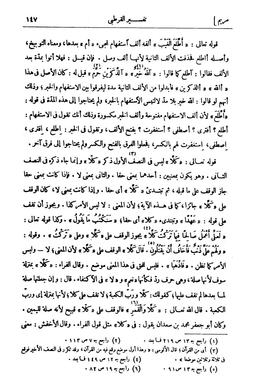 قَوْلُهُ تَعَالَى: (أَطَّلَعَ الْغَيْبَ) أَلِفُهُ أَلِفُ اسْتِفْهَامٍ لِمَجِيءِ" أَمِ" بَعْدَهَا وَمَعْنَاهُ التَّوْبِيخُ وَأَصْلُهُ أَاطَّلَعَ فَحُذِفَتِ الْأَلِفُ الثَّانِيَةُ لِأَنَّهَا أَلِفُ وَصْلٍ فَإِنْ قِيلَ فَهَلَّا أَتَوْا بِمَدَّةٍ بَعْدَ الْأَلِفِ فَقَالُوا أطلع كما قالوا" لله خَيْرٌ" «١» " آلذَّكَرَيْنِ حَرَّمَ" «٢» قِيلَ لَهُ كَانَ الْأَصْلُ فِي هَذَا" أَاللَّهُ"" أَالذَّكَرَيْنِ" فَأَبْدَلُوا مِنَ الْأَلِفِ الثَّانِيَةِ مَدَّةً لِيُفَرِّقُوا بَيْنَ الِاسْتِفْهَامِ وَالْخَبَرِ وَذَلِكَ أَنَّهُمْ لَوْ قَالُوا: اللَّهُ خَيْرٌ بِلَا مَدٍّ لَالْتَبَسَ الِاسْتِفْهَامُ بِالْخَبَرِ وَلَمْ يَحْتَاجُوا إِلَى هَذِهِ الْمَدَّةِ فِي قَوْلِهِ:" أَطَّلَعَ" لِأَنَّ أَلِفَ الِاسْتِفْهَامِ مَفْتُوحَةٌ وَأَلِفَ الْخَبَرِ مَكْسُورَةٌ وَذَلِكَ أَنَّكَ تَقُولُ فِي الِاسْتِفْهَامِ: أَطَّلَعَ؟ أَفَتَرَى؟ أَصْطَفَى؟ أَسْتَغْفَرْتَ؟ بِفَتْحِ الْأَلِفِ، وَتَقُولُ فِي الْخَبَرِ: اطَّلَعَ، افْتَرَى، اصْطَفَى، اسْتَغْفَرْتَ لَهُمْ بِالْكَسْرِ، فَجَعَلُوا الْفَرْقَ بِالْفَتْحِ وَالْكَسْرِ وَلَمْ يَحْتَاجُوا إِلَى فَرْقٍ آخَرَ قَوْلُهُ تَعَالَى: (كَلَّا) لَيْسَ فِي النِّصْفِ «٣» الْأَوَّلِ ذِكْرُ" كَلَّا" وَإِنَّمَا جَاءَ ذِكْرُهُ فِي النِّصْفِ الثَّانِي. وَهُوَ يَكُونُ بِمَعْنَيَيْنِ: أَحَدُهُمَا بِمَعْنَى حَقًّا. وَالثَّانِي بِمَعْنَى لَا. فَإِذَا كَانَتْ بِمَعْنَى حَقًّا جَازَ الْوَقْفُ عَلَى مَا قَبْلَهُ ثُمَّ تَبْتَدِئُ" كَلَّا" أَيْ حَقًّا. وَإِذَا كَانَتْ بِمَعْنَى لَا كَانَ الْوَقْفُ على" كَلَّا" جائز كَمَا فِي هَذِهِ الْآيَةِ لِأَنَّ الْمَعْنَى: لَا لَيْسَ الْأَمْرُ كَذَا. وَيَجُوزُ أَنْ تَقِفَ عَلَى قَوْلِهِ" عَهْداً ٨٠" وَتَبْتَدِئَ" كَلَّا" أَيْ حَقًّا" سَنَكْتُبُ مَا يَقُولُ" وَكَذَا قَوْلُهُ تَعَالَى:" لَعَلِّي أَعْمَلُ صالِحاً فِيما تَرَكْتُ كَلَّا ١٠٠" «٤» [المؤمنون: ١٠٠] يَجُوزُ الْوَقْفُ عَلَى" كَلَّا" وَعَلَى" تَرَكْتُ". وَقَوْلُهُ:" وَلَهُمْ عَلَيَّ ذَنْبٌ فَأَخافُ أَنْ يَقْتُلُونِ قالَ كَلَّا" «٥»." الْوَقْفُ عَلَى" كَلَّا" لِأَنَّ الْمَعْنَى لَا- وَلَيْسَ الْأَمْرُ كَمَا تَظُنُّ." فَاذْهَبا". فَلَيْسَ لِلْحَقِّ فِي هَذَا الْمَعْنَى مَوْضِعٌ. وَقَالَ الْفَرَّاءُ" كَلَّا" بِمَنْزِلَةِ سَوْفَ لِأَنَّهَا صِلَةٌ وَهِيَ حَرْفُ رَدٍّ فَكَأَنَّهَا" نَعَمْ" وَ" لَا" فِي الِاكْتِفَاءِ. قَالَ: وَإِنْ جَعَلْتَهَا صِلَةً لِمَا بَعْدَهَا لَمْ تَقِفْ عَلَيْهَا كَقَوْلِكَ: كَلَّا وَرَبِّ الْكَعْبَةِ، لَا تَقِفُ على كلا لأنها بِمَنْزِلَةِ إِي وَرَبِّ الْكَعْبَةِ. قَالَ اللَّهُ تَعَالَى" كَلَّا وَالْقَمَرِ" «٦» [المدثر: ٣٢] فَالْوَقْفُ عَلَى" كَلَّا" قَبِيحٌ لِأَنَّهُ صِلَةٌ لِلْيَمِينِ. وَكَانَ أَبُو جَعْفَرٍ مُحَمَّدُ بْنُ سَعْدَانَ يَقُولُ فِي" كَلَّا" مِثْلَ قَوْلِ الْفَرَّاءِ وَقَالَ الْأَخْفَشُ معنى