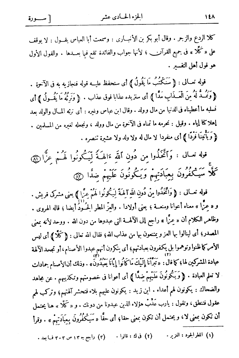 كَلَّا الرَّدْعُ وَالزَّجْرُ وَقَالَ أَبُو بَكْرِ بْنُ الْأَنْبَارِيِّ وَسَمِعْتُ أَبَا الْعَبَّاسِ يَقُولُ: لَا يُوقَفُ عَلَى" كَلَّا" جَمِيعَ الْقُرْآنِ لِأَنَّهَا جَوَابٌ وَالْفَائِدَةُ تَقَعُ فِيمَا بَعْدَهَا. وَالْقَوْلُ الْأَوَّلُ هُوَ قَوْلُ أَهْلِ التَّفْسِيرِ. قَوْلُهُ تَعَالَى: (سَنَكْتُبُ مَا يَقُولُ) أَيْ سَنَحْفَظُ عَلَيْهِ قَوْلَهُ فَنُجَازِيهِ بِهِ فِي الْآخِرَةِ. (وَنَمُدُّ لَهُ مِنَ الْعَذابِ مَدًّا) أَيْ سَنَزِيدُهُ عَذَابًا فَوْقَ عَذَابٍ. (وَنَرِثُهُ مَا يَقُولُ) ٨٠ أَيْ نَسْلُبُهُ مَا أَعْطَيْنَاهُ فِي الدُّنْيَا مِنْ مَالٍ وَوَلَدٍ. وَقَالَ ابْنُ عَبَّاسٍ وَغَيْرُهُ: أَيْ نَرِثُهُ الْمَالَ وَالْوَلَدَ بَعْدَ إِهْلَاكِنَا إِيَّاهُ. وَقِيلَ: نَحْرِمُهُ مَا تَمَنَّاهُ فِي الْآخِرَةِ مِنْ مَالٍ وَوَلَدٍ وَنَجْعَلُهُ لِغَيْرِهِ مِنَ الْمُسْلِمِينَ. (وَيَأْتِينا فَرْداً) ٨٠ أَيْ مُنْفَرِدًا لَا مَالَ لَهُ وَلَا وَلَدَ ولا عشيرة تنصره.