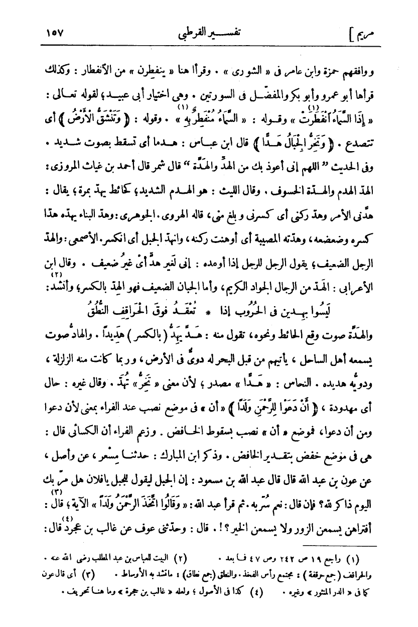 والهدة صوت وقع الحائط ونحوه تقول منه: هَدَّ يَهِدُّ (بِالْكَسْرِ) هَدِيدًا وَالْهَادُّ صَوْتٌ يَسْمَعُهُ أَهْلُ السَّاحِلِ يَأْتِيهِمْ مِنْ قِبَلِ الْبَحْرِ لَهُ دَوِيٌّ فِي الْأَرْضِ وَرُبَّمَا كَانَتْ مِنْهُ الزَّلْزَلَةُ وَدَوِيُّهُ هَدِيدُهُ. النَّحَّاسُ" هَدًّا ٨٠" مَصْدَرٌ لِأَنَّ مَعْنَى" تَخِرُّ ٩٠" تُهَدُّ. وَقَالَ غَيْرُهُ: حَالٌ أَيْ مَهْدُودَةٌ (أَنْ دَعَوْا لِلرَّحْمَنِ وَلَدًا) " أَنْ" فِي مَوْضِعِ نصب عند الفراء لِأَنْ دَعَوْا وَمِنْ أَنْ دَعَوْا فَمَوْضِعُ" أَنْ" نَصْبٌ بِسُقُوطِ الْخَافِضِ. وَزَعَمَ الْفَرَّاءُ أَنَّ الْكِسَائِيَّ قَالَ: هِيَ فِي مَوْضِعِ خَفْضٍ بِتَقْدِيرِ الْخَافِضِ. وَذَكَرَ ابْنُ الْمُبَارَكِ: حَدَّثَنَا مِسْعَرٌ عَنْ وَاصِلٍ عَنْ عَوْنِ بْنِ عَبْدِ اللَّهِ قَالَ قَالَ عَبْدُ اللَّهِ بْنُ مَسْعُودٍ: إِنَّ الْجَبَلَ لَيَقُولُ لِلْجَبَلِ يَا فُلَانُ هَلْ مَرَّ بِكَ الْيَوْمَ ذاكر لله؟ فإن قال: نعم سربه ثُمَّ قَرَأَ عَبْدُ اللَّهِ" وَقالُوا اتَّخَذَ الرَّحْمنُ وَلَداً" الْآيَةَ قَالَ: «٤» أَفَتَرَاهُنَّ يَسْمَعْنَ الزُّورَ وَلَا يَسْمَعْنَ الْخَيْرَ؟!. قَالَ: وَحَدَّثَنِي عَوْفٌ عَنْ غَالِبِ بن عجرد «٥» قال:
