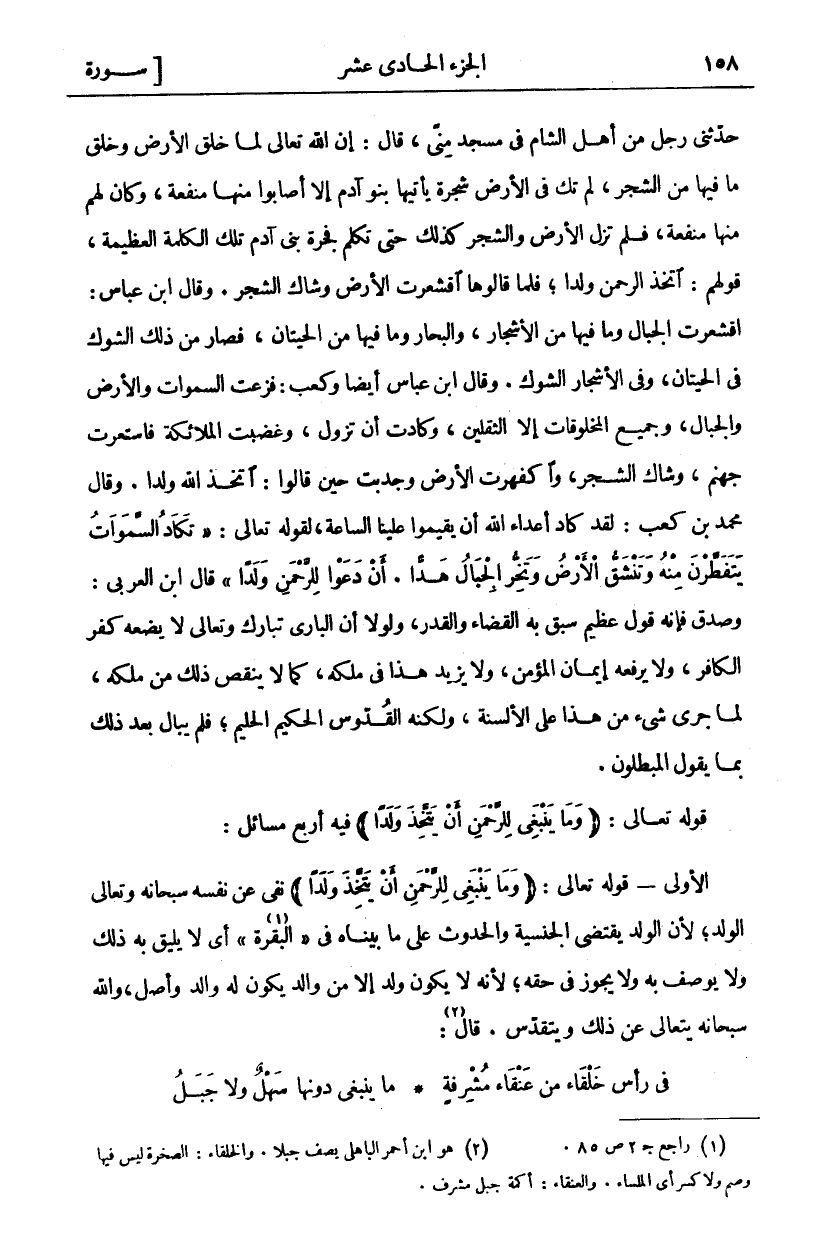 حَدَّثَنِي رَجُلٌ مِنْ أَهْلِ الشَّامِ فِي مَسْجِدِ مِنًى قَالَ: إِنَّ اللَّهَ تَعَالَى لَمَّا خَلَقَ الْأَرْضَ وَخَلَقَ مَا فِيهَا مِنَ الشَّجَرِ لَمْ تَكُ فِي الْأَرْضِ شَجَرَةٌ يَأْتِيهَا بَنُو آدَمَ إِلَّا أَصَابُوا مِنْهَا مَنْفَعَةً وَكَانَ لَهُمْ مِنْهَا مَنْفَعَةٌ، فَلَمْ تَزَلِ الْأَرْضُ وَالشَّجَرُ كَذَلِكَ حَتَّى تَكَلَّمَ فَجَرَةُ بَنِي آدَمَ تِلْكَ الْكَلِمَةَ الْعَظِيمَةَ قَوْلُهُمْ" اتَّخَذَ الرَّحْمنُ وَلَداً" فَلَمَّا قَالُوهَا اقْشَعَرَّتِ الْأَرْضُ وَشَاكَ الشَّجَرُ. وَقَالَ ابْنُ عَبَّاسٍ: اقْشَعَرَّتِ الْجِبَالُ وَمَا فِيهَا مِنَ الْأَشْجَارِ وَالْبِحَارِ وَمَا فِيهَا مِنَ الْحِيتَانِ فَصَارَ مِنْ ذَلِكَ الشَّوْكُ فِي الْحِيتَانِ وَفِي الْأَشْجَارِ الشَّوْكُ. وَقَالَ ابْنُ عباس أيضا وكعب: فزعت السموات وَالْأَرْضُ وَالْجِبَالُ وَجَمِيعُ الْمَخْلُوقَاتِ إِلَّا الثَّقَلَيْنِ وَكَادَتْ أَنْ تَزُولَ وَغَضِبَتِ الْمَلَائِكَةُ فَاسْتَعَرَتْ جَهَنَّمُ وَشَاكَ الشَّجَرُ وَاكْفَهَرَّتِ الْأَرْضُ وَجَدَبَتْ حِينَ قَالُوا: اتَّخَذَ اللَّهُ وَلَدًا. وَقَالَ مُحَمَّدُ بْنُ كَعْبٍ: لَقَدْ كَادَ أَعْدَاءُ اللَّهِ أَنْ يُقِيمُوا عَلَيْنَا السَّاعَةَ لِقَوْلِهِ تَعَالَى" تَكادُ السَّماواتُ يَتَفَطَّرْنَ مِنْهُ وَتَنْشَقُّ الْأَرْضُ وَتَخِرُّ الْجِبالُ هَدًّا. أَنْ دَعَوْا لِلرَّحْمنِ وَلَداً ٩٠" قَالَ ابْنُ الْعَرَبِيِّ: وَصَدَقَ فَإِنَّهُ قَوْلٌ عَظِيمٌ سَبَقَ بِهِ الْقَضَاءُ وَالْقَدَرُ وَلَوْلَا أَنَّ الْبَارِيَ تَبَارَكَ وَتَعَالَى لَا يَضَعُهُ كُفْرُ الْكَافِرِ وَلَا يَرْفَعُهُ إِيمَانُ الْمُؤْمِنِ وَلَا يَزِيدُ هَذَا فِي مُلْكِهِ كَمَا لَا يَنْقُصُ ذَلِكَ مِنْ ملكه لما جرى شي مِنْ هَذَا عَلَى الْأَلْسِنَةِ وَلَكِنَّهُ الْقُدُّوسُ الْحَكِيمُ الْحَلِيمُ فَلَمْ يُبَالِ بَعْدَ ذَلِكَ بِمَا يَقُولُ الْمُبْطِلُونَ قَوْلُهُ تَعَالَى: (وَما يَنْبَغِي لِلرَّحْمنِ أَنْ يَتَّخِذَ وَلَداً) فِيهِ أَرْبَعُ مَسَائِلَ: الْأُولَى- قَوْلُهُ تَعَالَى: (وَما يَنْبَغِي لِلرَّحْمنِ أَنْ يَتَّخِذَ وَلَداً) نَفَى عَنْ نَفْسِهِ سُبْحَانَهُ وَتَعَالَى الْوَلَدُ لِأَنَّ الْوَلَدَ يَقْتَضِي الْجِنْسِيَّةَ وَالْحُدُوثَ عَلَى مَا بَيَّنَّاهُ فِي" الْبَقَرَةِ" «١» أَيْ لَا يَلِيقُ بِهِ ذَلِكَ وَلَا يُوصَفُ بِهِ وَلَا يَجُوزُ فِي حَقِّهِ لِأَنَّهُ لَا يَكُونُ وَلَدٌ إِلَّا مِنْ وَالِدٍ يَكُونُ لَهُ وَالِدٌ وَأَصْلٌ وَاللَّهُ سُبْحَانَهُ يَتَعَالَى عَنْ ذَلِكَ وَيَتَقَدَّسُ. قَالَ: «٢»