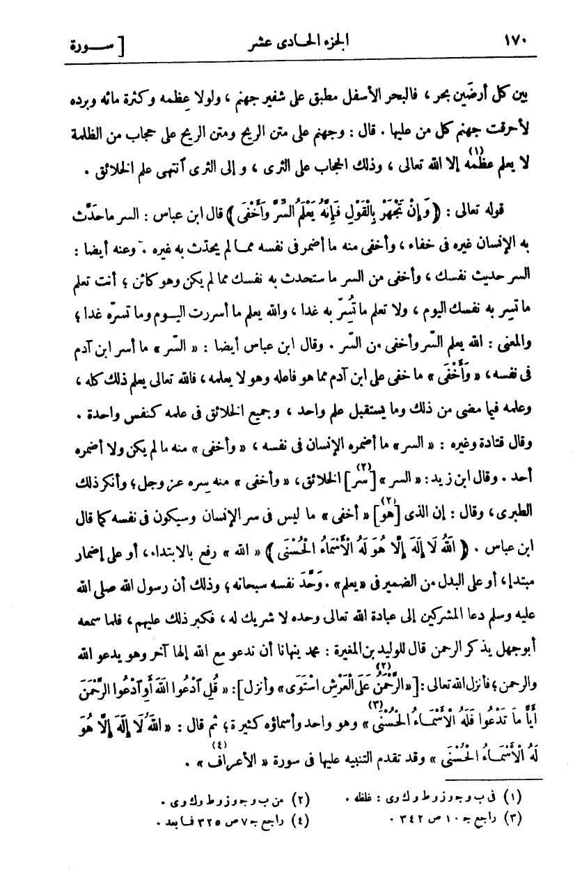 بَيْنَ كُلِّ أَرَضِينَ بَحْرٌ فَالْبَحْرُ الْأَسْفَلُ مُطْبِقٌ عَلَى شَفِيرِ جَهَنَّمَ وَلَوْلَا عِظَمُهُ وَكَثْرَةُ مَائِهِ وَبَرْدِهِ لَأَحْرَقَتْ جَهَنَّمُ كُلَّ مَنْ عَلَيْهَا. قَالَ: وَجَهَنَّمُ عَلَى مَتْنِ الرِّيحِ وَمَتْنُ الرِّيحِ عَلَى حِجَابٍ مِنَ الظُّلْمَةِ لَا يَعْلَمُ عِظَمَهُ «١» إِلَّا اللَّهُ تَعَالَى وَذَلِكَ الْحِجَابُ عَلَى الثَّرَى وَإِلَى الثَّرَى انْتَهَى عِلْمُ الْخَلَائِقِ. قَوْلُهُ تَعَالَى: (وَإِنْ تَجْهَرْ بِالْقَوْلِ فَإِنَّهُ يَعْلَمُ السِّرَّ وَأَخْفى) ٢٠: ٧ قَالَ ابْنُ عَبَّاسٍ: السِّرُّ مَا حَدَّثَ بِهِ الْإِنْسَانُ غَيْرَهُ فِي خَفَاءٍ وَأَخْفَى مِنْهُ مَا أَضْمَرَ فِي نَفْسِهِ مِمَّا لَمْ يُحَدِّثْ بِهِ غَيْرَهُ. وَعَنْهُ أَيْضًا السِّرُّ حَدِيثُ نَفْسِكَ وَأَخْفَى مِنَ السِّرِّ مَا سَتُحَدِّثُ بِهِ نَفْسَكَ مِمَّا لَمْ يَكُنْ وَهُوَ كَائِنٌ أَنْتَ تَعْلَمُ مَا تُسِرُّ بِهِ نَفْسُكَ الْيَوْمَ وَلَا تَعْلَمُ مَا تُسِرُّ بِهِ غَدًا وَاللَّهُ يَعْلَمُ مَا أَسْرَرْتَ الْيَوْمَ وَمَا تُسِرُّهُ غَدًا وَالْمَعْنَى: اللَّهُ يَعْلَمُ السِّرَّ وَأَخْفَى مِنَ السِّرِّ وَقَالَ ابْنُ عَبَّاسٍ أَيْضًا" السِّرُّ" مَا أَسَرَّ ابْنُ آدَمَ فِي نَفْسِهِ" وَأَخْفَى" مَا خَفِيَ عَلَى ابْنِ آدَمَ مِمَّا هُوَ فَاعِلُهُ وَهُوَ لَا يَعْلَمُهُ فَاللَّهُ تَعَالَى يَعْلَمُ ذَلِكَ كُلَّهِ وَعِلْمُهُ فِيمَا مَضَى مِنْ ذَلِكَ وَمَا يُسْتَقْبَلُ عِلْمٌ وَاحِدٌ وَجَمِيعُ الْخَلَائِقِ فِي عِلْمِهِ كَنَفْسٍ وَاحِدَةٍ وَقَالَ قَتَادَةُ وَغَيْرُهُ:" السِّرَّ ٢٠: ٧" مَا أَضْمَرَهُ الْإِنْسَانُ فِي نَفْسِهِ" وَأَخْفى ٢٠: ٧" مِنْهُ مَا لَمْ يَكُنْ وَلَا أَضْمَرَهُ أَحَدٌ. وقال ابن زيد:" السر" [سر «٢»] الْخَلَائِقِ" وَأَخْفى ٢٠: ٧" مِنْهُ سِرُّهُ عَزَّ وَجَلَّ وَأَنْكَرَ ذلك الطبري وقال إن الذي [هو «٣»] " أَخْفى ٢٠: ٧" مَا لَيْسَ فِي سِرِّ الْإِنْسَانِ وَسَيَكُونُ فِي نَفْسِهِ كَمَا قَالَ ابْنُ عَبَّاسٍ. (اللَّهُ لَا إِلهَ إِلَّا هُوَ لَهُ الْأَسْماءُ الْحُسْنى) " اللَّهُ" رُفِعَ بِالِابْتِدَاءِ أَوْ عَلَى إِضْمَارِ مُبْتَدَإٍ أَوْ عَلَى الْبَدَلِ مِنَ الضَّمِيرِ فِي" يَعْلَمُ". وَحَّدَ نَفْسَهُ سُبْحَانَهُ وَذَلِكَ أَنَّ رَسُولَ اللَّهِ صَلَّى اللَّهُ عَلَيْهِ وَسَلَّمَ دَعَا الْمُشْرِكِينَ إِلَى عِبَادَةِ اللَّهِ تَعَالَى وَحْدَهُ لَا شَرِيكَ لَهُ فَكَبُرَ ذَلِكَ عَلَيْهِمْ فَلَمَّا سَمِعَهُ أَبُو جَهْلٍ يَذْكُرُ الرَّحْمَنَ قَالَ لِلْوَلِيدِ بْنِ الْمُغِيرَةِ: مُحَمَّدٌ يَنْهَانَا أَنْ نَدْعُوَ مَعَ اللَّهِ إِلَهًا آخَرَ وَهُوَ يَدْعُو اللَّهَ وَالرَّحْمَنَ فَأَنْزَلَ اللَّهُ تَعَالَى: [" الرَّحْمنُ عَلَى الْعَرْشِ اسْتَوى ٢٠: ٥" وأنزل]:" قُلِ ادْعُوا اللَّهَ أَوِ ادْعُوا الرَّحْمنَ أَيًّا مَا تَدْعُوا فَلَهُ الْأَسْماءُ الْحُسْنى ١١٠" «٤» وَهُوَ وَاحِدٌ وَأَسْمَاؤُهُ كَثِيرَةٌ ثُمَّ قَالَ" اللَّهُ لَا إِلهَ إِلَّا هُوَ لَهُ الْأَسْماءُ الْحُسْنى ٢٠: ٨". وَقَدْ تَقَدَّمَ التنبيه عليها في سورة (الأعراف)