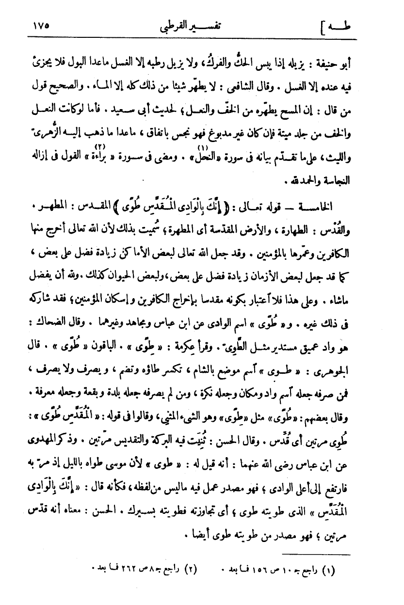 أَبُو حَنِيفَةَ: يُزِيلُهُ إِذَا يَبِسَ الْحَكُّ وَالْفَرْكُ، وَلَا يُزِيلُ رَطْبَهُ إِلَّا الْغَسْلُ مَا عَدَا الْبَوْلَ فَلَا يُجْزِئُ فِيهِ عِنْدَهُ إِلَّا الْغَسْلُ. وَقَالَ الشَّافِعِيُّ: لَا يُطَهِّرُ شَيْئًا مِنْ ذَلِكَ كله إِلَّا الْمَاءُ. وَالصَّحِيحُ قَوْلُ مَنْ قَالَ: إِنَّ الْمَسْحَ يُطَهِّرُهُ مِنَ الْخُفِّ وَالنَّعْلِ، لِحَدِيثِ أَبِي سَعِيدٍ. فَأَمَّا لَوْ كَانَتِ النَّعْلُ وَالْخُفُّ مِنْ جِلْدِ مَيْتَةٍ فَإِنْ كَانَ غَيْرَ مَدْبُوغٍ فَهُوَ نَجِسٌ بِاتِّفَاقٍ، مَا عَدَا مَا ذَهَبَ إِلَيْهِ الزُّهْرِيُّ وَاللَّيْثُ، عَلَى مَا تَقَدَّمَ بَيَانُهُ فِي سُورَةِ" النَّحْلِ" «١». وَمَضَى فِي سُورَةِ" بَرَاءَةٍ" «٢» الْقَوْلُ فِي إِزَالَةِ النَّجَاسَةِ وَالْحَمْدُ لِلَّهِ. الْخَامِسَةُ- قَوْلُهُ تعالى: (إِنَّكَ بِالْوادِ الْمُقَدَّسِ طُوىً) ٢٠: ١٢ الْمُقَدَّسُ: الْمُطَهَّرُ. وَالْقُدْسُ: الطَّهَارَةُ، وَالْأَرْضُ الْمُقَدَّسَةُ أَيِ الْمُطَهَّرَةُ، سُمِّيَتْ بِذَلِكَ لِأَنَّ اللَّهَ تَعَالَى أَخْرَجَ مِنْهَا الْكَافِرِينَ وَعَمَرَهَا بِالْمُؤْمِنِينَ. وَقَدْ جَعَلَ اللَّهُ تَعَالَى لِبَعْضِ الْأَمَاكِنِ زِيَادَةَ فَضْلٍ عَلَى بَعْضٍ، كَمَا قَدْ جَعَلَ لِبَعْضِ الْأَزْمَانِ زِيَادَةَ فَضْلٍ عَلَى بَعْضٍ، وَلِبَعْضِ الْحَيَوَانِ كَذَلِكَ. وَلِلَّهِ أَنْ يُفَضِّلَ مَا شَاءَ. وَعَلَى هَذَا فَلَا اعْتِبَارَ بِكَوْنِهِ مُقَدَّسًا بِإِخْرَاجِ الْكَافِرِينَ وَإِسْكَانِ الْمُؤْمِنِينَ، فَقَدْ شَارَكَهُ فِي ذَلِكَ غَيْرُهُ. وَ (طُوىً) اسْمُ الْوَادِي عَنِ ابْنِ عَبَّاسٍ وَمُجَاهِدٍ وَغَيْرِهِمَا. وَقَالَ الضَّحَّاكُ: هُوَ وَادٍ عَمِيقٌ مُسْتَدِيرٌ مِثْلُ الطَّوِيِّ. وَقَرَأَ عِكْرِمَةُ:" طِوًى". الْبَاقُونَ" طُوىً". قَالَ الْجَوْهَرِيُّ:" طُوىً" اسْمُ مَوْضِعٍ بِالشَّامِ، تُكْسَرُ طَاؤُهُ وَتُضَمُّ، وَيُصْرَفُ وَلَا يُصْرَفُ، فَمَنْ صَرَفَهُ جَعَلَهُ اسْمَ وَادٍ وَمَكَانٍ وَجَعَلَهُ نَكِرَةً، وَمَنْ لَمْ يَصْرِفْهُ جَعَلَهُ بَلْدَةً وَبُقْعَةً وَجَعَلَهُ مَعْرِفَةً. وَقَالَ بَعْضُهُمْ:" طُوىً" مِثْلَ" طِوًى" وَهُوَ الشَّيْءُ الْمَثْنِيُّ، وَقَالُوا فِي قَوْلِهِ:" الْمُقَدَّسِ طُوىً": طُوِيَ مَرَّتَيْنِ أَيْ قُدِّسَ. وَقَالَ الْحَسَنُ: ثُنِيَتْ فِيهِ الْبَرَكَةُ وَالتَّقْدِيسُ مَرَّتَيْنِ. وَذَكَرَ الْمَهْدَوِيُّ عَنْ ابْنِ عَبَّاسٍ رَضِيَ اللَّهُ عَنْهُمَا: أَنَّهُ قِيلَ لَهُ:" طُوىً" لِأَنَّ مُوسَى طَوَاهُ بِاللَّيْلِ إِذْ مَرَّ بِهِ فَارْتَفَعَ إِلَى أَعْلَى الْوَادِي، فَهُوَ مَصْدَرٌ عَمِلَ فِيهِ مَا لَيْسَ مِنْ لَفْظِهِ، فَكَأَنَّهُ قَالَ: (إِنَّكَ بِالْوادِ الْمُقَدَّسِ) ٢٠: ١٢ الَّذِي طَوَيْتَهُ طُوًى، أَيْ تَجَاوَزْتَهُ فَطَوَيْتَهُ بِسَيْرِكَ. الْحَسَنُ: مَعْنَاهُ أَنَّهُ قُدِّسَ مَرَّتَيْنِ، فَهُوَ مَصْدَرٌ مِنْ طَوَيْتُهُ طُوًى أيضا.