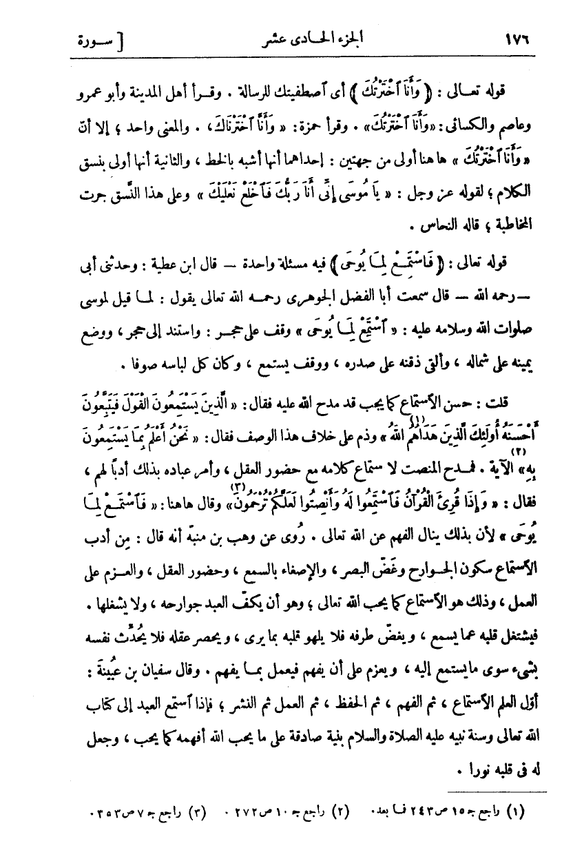 قَوْلُهُ تَعَالَى: (وَأَنَا اخْتَرْتُكَ) ٢٠: ١٣ أَيِ اصْطَفَيْتُكَ لِلرِّسَالَةِ. وَقَرَأَ أَهْلُ الْمَدِينَةِ وَأَبُو عَمْرٍو وَعَاصِمٌ وَالْكِسَائِيُّ" وَأَنَا اخْتَرْتُكَ ٢٠: ١٣". وَقَرَأَ حَمْزَةُ" وَأَنَّا اخْتَرْنَاكَ". وَالْمَعْنَى واحد إلا أن" وَأَنَا اخْتَرْتُكَ ٢٠: ١٣" ها هنا أَوْلَى مِنْ جِهَتَيْنِ: إِحْدَاهُمَا أَنَّهَا أَشْبَهُ بِالْخَطِّ، وَالثَّانِيَةُ أَنَّهَا أَوْلَى بِنَسَقِ الْكَلَامِ، لِقَوْلِهِ عَزَّ وَجَلَّ:" يَا مُوسى إِنِّي أَنَا رَبُّكَ فَاخْلَعْ نَعْلَيْكَ ٢٠: ١٢ - ١١" وَعَلَى هَذَا النَّسَقِ جَرَتِ الْمُخَاطَبَةُ، قَالَهُ النَّحَّاسُ. قَوْلُهُ تَعَالَى: (فَاسْتَمِعْ لِما يُوحى) ٢٠: ١٣ فِيهِ مَسْأَلَةٌ وَاحِدَةٌ- قَالَ ابْنُ عَطِيَّةَ: وَحَدَّثَنِي أَبِي- رَحِمَهُ اللَّهُ- قَالَ سَمِعْتُ أَبَا الْفَضْلِ الْجَوْهَرِيُّ رَحِمَهُ اللَّهُ تَعَالَى يَقُولُ: لَمَّا قِيلَ لِمُوسَى صَلَوَاتُ اللَّهِ وَسَلَامُهُ عَلَيْهِ:" فَاسْتَمِعْ لِما يُوحى ٢٠: ١٣" وَقَفَ عَلَى حَجَرٍ، وَاسْتَنَدَ إِلَى حَجَرٍ، وَوَضَعَ يَمِينَهُ عَلَى شِمَالِهِ، وَأَلْقَى ذَقَنَهُ عَلَى صَدْرِهِ، وَوَقَفَ يَسْتَمِعُ، وَكَانَ كُلُّ لِبَاسِهِ صُوفًا. قُلْتُ: حُسْنُ الِاسْتِمَاعِ كَمَا يَجِبُ قَدْ مَدَحَ اللَّهُ عَلَيْهِ فَقَالَ:" الَّذِينَ يَسْتَمِعُونَ الْقَوْلَ فَيَتَّبِعُونَ أَحْسَنَهُ أُولئِكَ الَّذِينَ هَداهُمُ «١» اللَّهُ" [الزمر: ١٨] وَذَمَّ عَلَى خِلَافِ هَذَا الْوَصْفِ فَقَالَ:" نَحْنُ أَعْلَمُ بِما يَسْتَمِعُونَ بِهِ" «٢» الْآيَةَ. فَمَدَحَ الْمُنْصِتَ لِاسْتِمَاعِ كَلَامِهِ مَعَ حُضُورِ الْعَقْلِ، وَأَمَرَ عِبَادَهُ بِذَلِكَ أَدَبًا لَهُمْ، فَقَالَ:" وَإِذا قُرِئَ الْقُرْآنُ فَاسْتَمِعُوا لَهُ وَأَنْصِتُوا لَعَلَّكُمْ تُرْحَمُونَ ٢٠" «٣» [الأعراف: ٢٠٤] وقال ها هنا:" فَاسْتَمِعْ لِما يُوحى ٢٠: ١٣" لِأَنَّ بِذَلِكَ يُنَالُ الْفَهْمُ عَنِ اللَّهِ تَعَالَى. رُوِيَ عَنْ وَهْبِ بْنِ مُنَبِّهٍ أَنَّهُ قَالَ: مِنْ أَدَبِ الِاسْتِمَاعِ سُكُونُ الْجَوَارِحِ وَغَضُّ الْبَصَرِ، وَالْإِصْغَاءُ بِالسَّمْعِ، وَحُضُورُ الْعَقْلِ، وَالْعَزْمُ عَلَى الْعَمَلِ، وَذَلِكَ هُوَ الِاسْتِمَاعُ كَمَا يُحِبُّ اللَّهُ تَعَالَى، وَهُوَ أَنْ يَكُفَّ الْعَبْدُ جَوَارِحَهُ، وَلَا يَشْغَلَهَا. فَيَشْتَغِلُ قَلْبُهُ عَمَّا يَسْمَعُ، وَيَغُضُّ طَرْفَهُ فَلَا يَلْهُو قَلْبُهُ بِمَا يَرَى، وَيَحْصُرُ عَقْلَهُ فَلَا يُحَدِّثُ نَفْسَهُ بِشَيْءٍ سِوَى مَا يَسْتَمِعُ إِلَيْهِ، وَيَعْزِمُ عَلَى أَنْ يَفْهَمَ فَيَعْمَلَ بِمَا يَفْهَمُ. وَقَالَ سُفْيَانُ بْنُ عُيَيْنَةَ: أَوَّلُ الْعِلْمِ الِاسْتِمَاعُ، ثُمَّ الْفَهْمُ، ثُمَّ الْحِفْظُ، ثُمَّ الْعَمَلُ ثُمَّ النَّشْرُ، فَإِذَا اسْتَمَعَ الْعَبْدُ إِلَى كِتَابِ اللَّهِ تَعَالَى وَسُنَّةِ نَبِيِّهِ عَلَيْهِ الصَّلَاةُ وَالسَّلَامُ بِنِيَّةٍ صَادِقَةٍ عَلَى مَا يُحِبُّ اللَّهُ أَفْهَمَهُ كَمَا يُحِبُّ، وَجَعَلَ لَهُ فِي قلبه نورا.