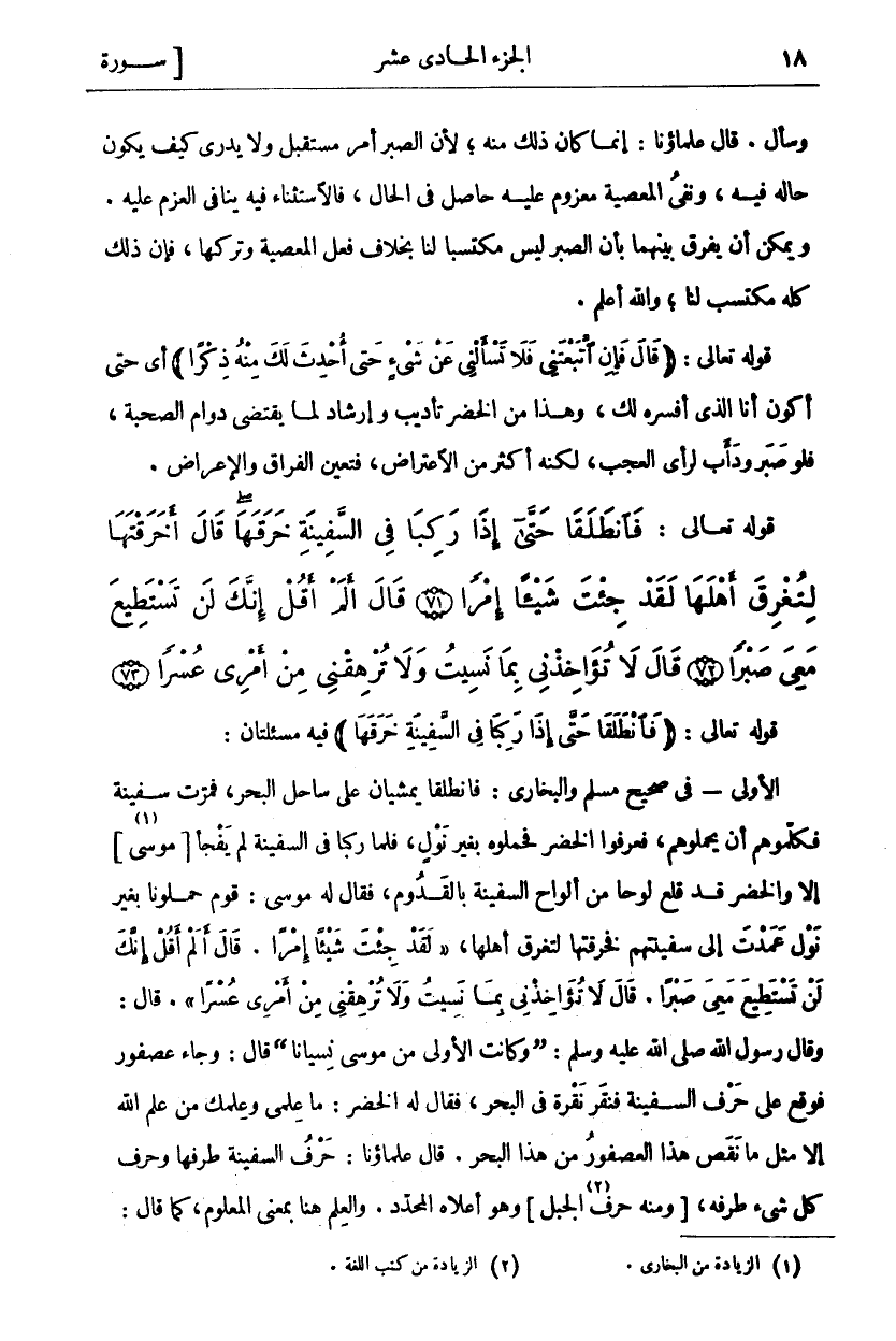 وَسَأَلَ، قَالَ عُلَمَاؤُنَا: إِنَّمَا كَانَ ذَلِكَ مِنْهُ، لِأَنَّ الصَّبْرَ أَمْرٌ مُسْتَقْبَلٌ وَلَا يُدْرَى كَيْفَ يَكُونُ حَالُهُ فِيهِ، وَنَفْيُ الْمَعْصِيَةِ مَعْزُومٌ عَلَيْهِ حَاصِلٌ فِي الْحَالِ، فَالِاسْتِثْنَاءُ فِيهِ يُنَافِي الْعَزْمَ عَلَيْهِ. وَيُمْكِنُ أَنْ يُفَرَّقَ بَيْنَهُمَا بِأَنَّ الصَّبْرَ ليس مكتسبا لنا بخلاف فعل المعصية وتركها، فَإِنَّ ذَلِكَ كُلَّهُ مُكْتَسَبٌ لَنَا، وَاللَّهُ أَعْلَمُ. قوله تعالى: (قالَ فَإِنِ اتَّبَعْتَنِي فَلا تَسْئَلْنِي عَنْ شَيْءٍ حَتَّى أُحْدِثَ لَكَ مِنْهُ ذِكْراً) ٧٠ أَيْ حَتَّى أَكُونَ أَنَا الَّذِي أُفَسِّرُهُ لَكَ، وَهَذَا مِنْ الْخَضِرِ تَأْدِيبٌ وَإِرْشَادٌ لِمَا يَقْتَضِي دَوَامَ الصُّحْبَةِ، فَلَوْ صَبَرَ وَدَأَبَ لَرَأَى الْعَجَبَ، لَكِنَّهُ أَكْثَرَ مِنْ الِاعْتِرَاضِ فَتَعَيَّنَ الْفِرَاقُ وَالْإِعْرَاضُ.