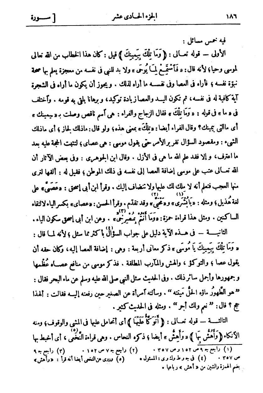 فِيهِ خَمْسُ مَسَائِلَ: الْأُولَى- قَوْلُهُ تَعَالَى: (وَما تِلْكَ بِيَمِينِكَ) ٢٠: ١٧ قِيلَ: كَانَ هَذَا الْخِطَابُ مِنَ اللَّهِ تَعَالَى لِمُوسَى وَحْيًا، لِأَنَّهُ قَالَ: (فَاسْتَمِعْ لِما يُوحى) ٢٠: ١٣ وَلَا بُدَّ لِلنَّبِيِّ فِي نَفْسِهِ مِنْ مُعْجِزَةٍ يَعْلَمُ بِهَا صِحَّةَ نُبُوَّةِ نَفْسِهِ، فَأَرَاهُ فِي الْعَصَا وَفِي نَفْسِهِ مَا أَرَاهُ لِذَلِكَ. وَيَجُوزُ أَنْ يَكُونَ مَا أَرَاهُ فِي الشَّجَرَةِ آيَةً كَافِيَةً لَهُ فِي نَفْسِهِ، ثُمَّ تَكُونُ الْيَدُ وَالْعَصَا زِيَادَةَ تَوْكِيدٍ، وَبُرْهَانًا يَلْقَى بِهِ قَوْمَهُ. وَاخْتُلِفَ فِي" مَا" فِي قَوْلِهِ: (وَما تِلْكَ) ٢٠: ١٧ فَقَالَ الزَّجَّاجُ وَالْفَرَّاءُ: هِيَ اسْمٌ نَاقِصٌ وُصِلَتْ ب"- يَمِينِكَ" أَيْ مَا الَّتِي بيمينك؟ وقال الفراء أَيْضًا:" تِلْكَ" بِمَعْنَى هَذِهِ، وَلَوْ قَالَ: مَا ذَلِكَ لَجَازَ، أَيْ مَا ذَلِكَ الشَّيْءُ: وَمَقْصُودُ السُّؤَالِ تَقْرِيرُ الْأَمْرِ حَتَّى يَقُولَ مُوسَى: هِيَ عصاي، لتثبت الْحُجَّةَ عَلَيْهِ بَعْدَ مَا اعْتَرَفَ، وَإِلَّا فَقَدْ عَلِمَ اللَّهُ مَا هِيَ فِي الْأَزَلِ. وَقَالَ ابْنُ الْجَوْهَرِيِّ وَفِي بَعْضِ الْآثَارِ أَنَّ اللَّهَ تَعَالَى عَتَبَ عَلَى مُوسَى إِضَافَةَ الْعَصَا إِلَى نَفْسِهِ فِي ذَلِكَ الْمَوْطِنِ، فَقِيلَ لَهُ: أَلْقِهَا لِتَرَى مِنْهَا الْعَجَبَ فَتَعْلَمَ أَنَّهُ لَا مِلْكَ عَلَيْهَا وَلَا تَنْضَافُ إِلَيْكَ. وَقَرَأَ ابْنُ أَبِي إِسْحَاقَ:" عَصَيَّ" عَلَى لُغَةِ هُذَيْلٍ، وَمِثْلُهُ" يَا بُشْرى " «١» وَ" مَحْيَيَّ" «٢» وَقَدْ تَقَدَّمَ. وَقَرَأَ الْحَسَنُ:" عَصايَ ٢٠: ١٨" بِكَسْرِ الْيَاءِ لِالْتِقَاءِ السَّاكِنَيْنِ. وَمِثْلُ هَذَا قراءة حمزة:" وَما أَنْتُمْ بِمُصْرِخِيَّ" «٣» [إبراهيم: ٢٢]. وَعَنِ ابْنِ أَبِي إِسْحَاقَ سُكُونُ الْيَاءِ. الثَّانِيَةُ- فِي هَذِهِ الْآيَةِ دَلِيلٌ عَلَى جَوَابِ السُّؤَالِ «٤» بِأَكْثَرَ مِمَّا سُئِلَ، لِأَنَّهُ لَمَّا قَالَ:" وَما تِلْكَ بِيَمِينِكَ يَا مُوسى ٢٠: ١٧" ذَكَرَ مَعَانِيَ أَرْبَعَةً: وَهِيَ: إِضَافَةُ الْعَصَا إِلَيْهِ، وَكَانَ حَقُّهُ أَنْ يَقُولَ عَصًا، وَالتَّوَكُّؤَ، وَالْهَشَّ وَالْمَآرِبَ الْمُطْلَقَةَ. فَذَكَرَ مُوسَى مِنْ مَنَافِعِ عَصَاهُ عِظَمَهَا وَجُمْهُورَهَا وَأَجْمَلَ سَائِرَ ذَلِكَ. وَفِي الْحَدِيثِ سُئِلَ النَّبِيُّ صَلَّى اللَّهُ عَلَيْهِ وَسَلَّمَ عَنْ مَاءِ الْبَحْرِ فَقَالَ: (هُوَ الطَّهُورُ مَاؤُهُ الْحِلُّ مَيْتَتُهُ). وَسَأَلَتْهُ امْرَأَةٌ عَنِ الصَّغِيرِ حِينَ رَفَعَتْهُ إِلَيْهِ فَقَالَتْ: أَلِهَذَا حَجٌّ؟ قَالَ (نَعَمْ وَلَكِ أَجْرٌ). وَمِثْلُهُ فِي الحديث كثير. الثالثة- قوله تعالى: (أَتَوَكَّؤُا عَلَيْها) ٢٠: ١٨ أَيْ أَتَحَامَلُ عَلَيْهَا فِي الْمَشْيِ وَالْوُقُوفِ، وَمِنْهُ الِاتِّكَاءُ (وَأَهُشُّ بِها) ٢٠: ١٨" وَأَهُشُّ ٢٠: ١٨" أَيْضًا، ذَكَرَهُ النَّحَّاسُ. وَهِيَ قِرَاءَةُ النَّخَعِيِّ «٥»، أَيْ أَخْبِطُ بِهَا