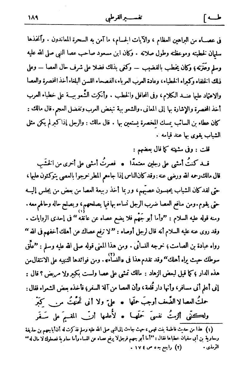 فِي عَصَاهُ مِنَ الْبَرَاهِينِ الْعِظَامِ، وَالْآيَاتِ الْجِسَامِ، مَا آمَنَ بِهِ السَّحَرَةُ الْمُعَانِدُونَ. وَاتَّخَذَهَا سُلَيْمَانُ لِخُطْبَتِهِ وَمَوْعِظَتِهِ وَطُولِ صَلَاتِهِ. وَكَانَ ابْنُ مَسْعُودٍ صَاحِبَ عَصَا النَّبِيِّ صَلَّى اللَّهُ عَلَيْهِ وَسَلَّمَ وَعَنَزَتِهِ، وَكَانَ يَخْطُبُ بِالْقَضِيبِ- وَكَفَى بِذَلِكَ فَضْلًا عَلَى شَرَفِ حَالِ الْعَصَا- وَعَلَى ذَلِكَ الْخُلَفَاءُ وَكُبَرَاءُ الْخُطَبَاءِ، وَعَادَةُ الْعَرَبِ الْعَرْبَاءِ، الْفُصَحَاءِ اللُّسُنِ الْبُلَغَاءِ أَخْذُ الْمِخْصَرَةِ وَالْعَصَا وَالِاعْتِمَادُ عَلَيْهَا عِنْدَ الْكَلَامِ، وَفِي الْمَحَافِلِ وَالْخُطَبِ. وَأَنْكَرَتِ الشُّعُوبِيَّةُ عَلَى خُطَبَاءِ الْعَرَبِ أَخْذَ الْمِخْصَرَةِ وَالْإِشَارَةَ بِهَا إِلَى الْمَعَانِي. وَالشُّعُوبِيَّةُ تُبْغِضُ الْعَرَبَ وَتُفَضِّلُ الْعَجَمَ. قَالَ مَالِكٌ: كَانَ عَطَاءُ بْنُ السَّائِبِ يُمْسِكُ الْمِخْصَرَةَ يَسْتَعِينُ بِهَا. قَالَ مَالِكٌ: وَالرَّجُلُ إِذَا كَبِرَ لَمْ يَكُنْ مِثْلَ الشَّبَابِ يَقْوَى بِهَا عِنْدَ قِيَامِهِ. قُلْتُ: وَفِي مِشْيَتِهِ كَمَا قَالَ بَعْضُهُمْ:
