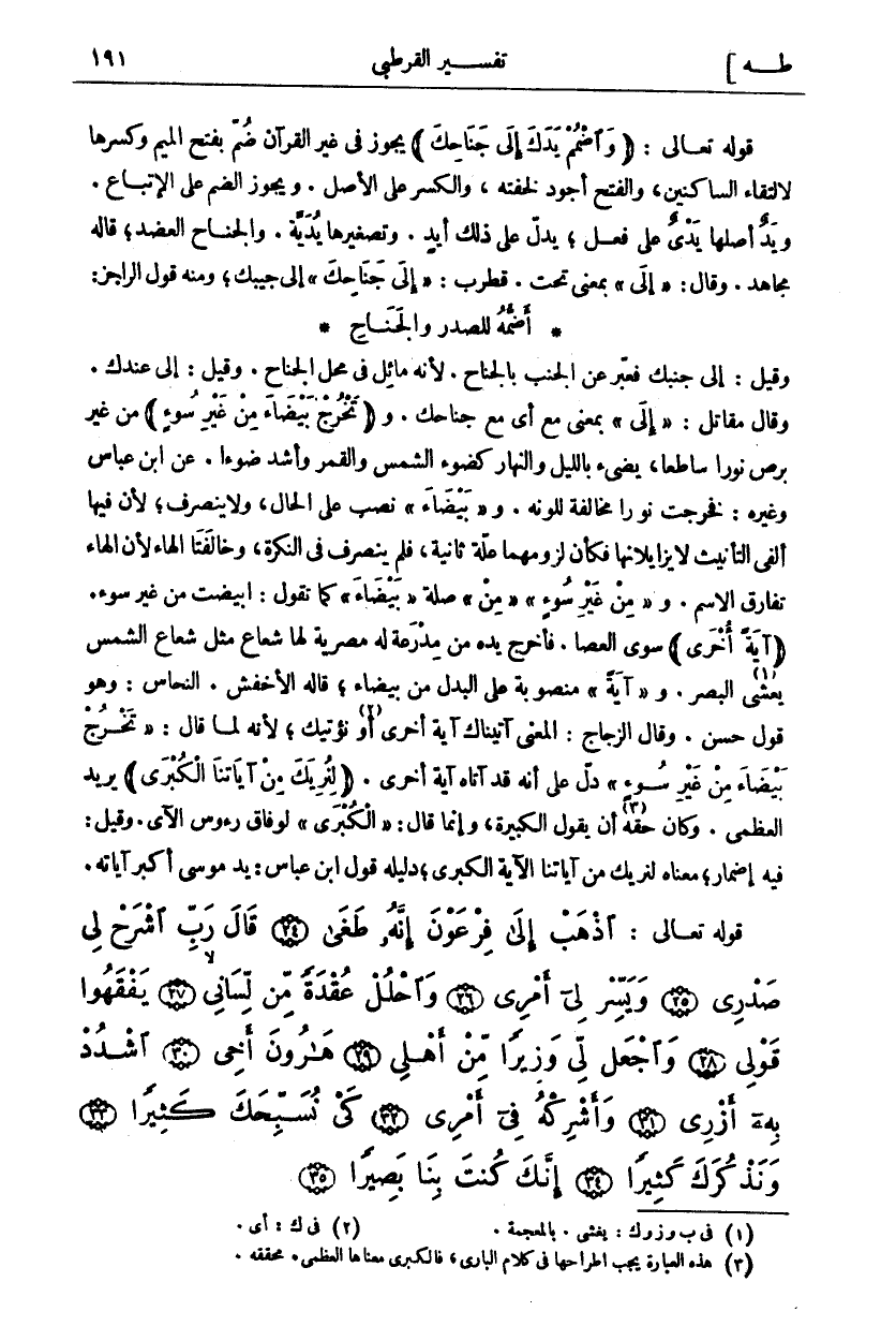 وَقِيلَ: إِلَى جَنْبِكَ فَعَبَّرَ عَنِ الْجَنْبِ بِالْجَنَاحِ. لِأَنَّهُ مَائِلٌ فِي مَحَلِّ الْجَنَاحِ. وَقِيلَ إِلَى عِنْدِكَ. وَقَالَ مُقَاتِلٌ" إِلى " بِمَعْنَى مَعَ أَيْ مَعَ جَنَاحِكَ. (تَخْرُجْ بَيْضاءَ مِنْ غَيْرِ سُوءٍ) من غير برص نورا ساطعا، يضئ بِاللَّيْلِ وَالنَّهَارِ كَضَوْءِ الشَّمْسِ وَالْقَمَرِ وَأَشَدُّ ضَوْءًا. عَنِ ابْنِ عَبَّاسٍ وَغَيْرِهِ: فَخَرَجَتْ نُورًا مُخَالِفَةً للونه. و" بَيْضاءَ" نُصِبَ عَلَى الْحَالِ، وَلَا يَنْصَرِفُ لِأَنَّ فِيهَا أَلِفَيِ التَّأْنِيثِ لَا يُزَايِلَانِهَا فَكَأَنَّ لُزُومَهُمَا عِلَّةٌ ثَانِيَةٌ، فَلَمْ يَنْصَرِفْ فِي النَّكِرَةِ، وَخَالَفَتَا الْهَاءَ لِأَنَّ الْهَاءَ تُفَارِقُ الِاسْمَ. وَ" مِنْ غَيْرِ سُوءٍ"" مِنْ" صِلَةُ" بَيْضاءَ" كَمَا تَقُولُ: ابْيَضَّتْ مِنْ غَيْرِ سُوءٍ. (آيَةً أُخْرَى) سِوَى الْعَصَا. فَأَخْرَجَ يَدَهُ مِنْ مِدْرَعَةٍ لَهُ مِصْرِيَّةٍ لَهَا شعاع مثل شعاع الشمس يعشي «١» البصر. و" آيَةً ١٠" مَنْصُوبَةٌ عَلَى الْبَدَلِ مِنْ بَيْضَاءَ، قَالَهُ الْأَخْفَشُ. النَّحَّاسُ: وَهُوَ قَوْلٌ حَسَنٌ. وَقَالَ الزَّجَّاجُ: الْمَعْنَى آتَيْنَاكَ آيَةً أُخْرَى أَوْ «٢» نُؤْتِيكَ، لِأَنَّهُ لَمَّا قَالَ:" تَخْرُجْ بَيْضاءَ مِنْ غَيْرِ سُوءٍ" دَلَّ عَلَى أَنَّهُ قَدْ آتَاهُ آيَةً أُخْرَى. (لِنُرِيَكَ مِنْ آياتِنَا الْكُبْرى) يُرِيدُ الْعُظْمَى. وَكَانَ حَقُّهُ «٣» أَنْ يَقُولَ الْكَبِيرَةَ وَإِنَّمَا قَالَ:" الْكُبْرى ٢٠: ٢٣" لِوِفَاقِ رُءُوسِ الْآيِ. وَقِيلَ: فِيهِ إِضْمَارٌ، مَعْنَاهُ لِنُرِيَكَ مِنْ آيَاتِنَا الْآيَةَ الْكُبْرَى دَلِيلُهُ قَوْلُ ابْنِ عباس يد موسى أكبر آياته.