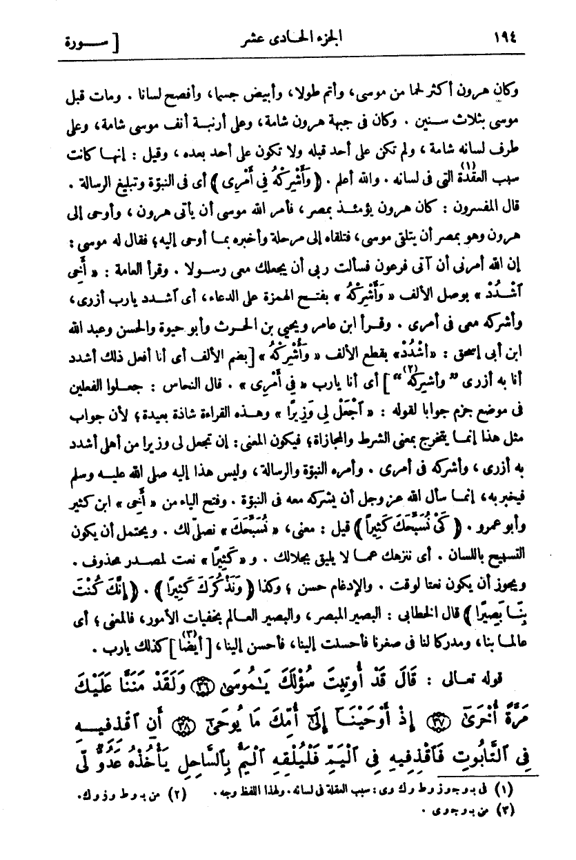 وكان هرون أَكْثَرَ لَحْمًا مِنْ مُوسَى، وَأَتَمَّ طُولًا، وَأَبْيَضَ جِسْمًا، وَأَفْصَحَ لِسَانًا. وَمَاتَ قَبْلَ مُوسَى بِثَلَاثِ سنين. وكان في جبهة هرون شَامَةٌ، وَعَلَى أَرْنَبَةِ أَنْفِ مُوسَى شَامَةٌ، وَعَلَى طَرَفِ لِسَانِهِ شَامَةٌ، وَلَمْ تَكُنْ عَلَى أَحَدٍ قَبْلَهُ وَلَا تَكُونُ عَلَى أَحَدٍ بَعْدَهُ، وَقِيلَ: إِنَّهَا كَانَتْ سَبَبَ الْعُقْدَةِ «١» الَّتِي فِي لِسَانِهِ. وَاللَّهُ أَعْلَمُ. (وَأَشْرِكْهُ فِي أَمْرِي) أَيْ فِي النُّبُوَّةِ وَتَبْلِيغِ الرِّسَالَةِ. قَالَ الْمُفَسِّرُونَ: كَانَ هَارُونُ يَوْمَئِذٍ بِمِصْرَ، فَأَمَرَ اللَّهُ مُوسَى أَنْ يَأْتِيَ هرون، وأوحى إلى هرون وَهُوَ بِمِصْرَ أَنْ يَتَلَقَّى مُوسَى، فَتَلَقَّاهُ إِلَى مَرْحَلَةٍ وَأَخْبَرَهُ بِمَا أُوحِيَ إِلَيْهِ، فَقَالَ لَهُ مُوسَى: إِنَّ اللَّهَ أَمَرَنِي أَنْ آتِيَ فِرْعَوْنَ فَسَأَلْتُ رَبِّي أَنْ يَجْعَلَكَ مَعِي رَسُولًا. وَقَرَأَ الْعَامَّةُ" أَخِي اشْدُدْ" بِوَصْلِ الْأَلِفِ" وَأَشْرِكْهُ ٢٠: ٣٢" بِفَتْحِ الْهَمْزَةِ عَلَى الدُّعَاءِ، أَيِ اشْدُدْ يَا رَبِّ أَزْرِي وَأَشْرِكْهُ مَعِي فِي أَمْرِي. وَقَرَأَ ابْنُ عامر ويحيى بن الحرث وأبو حيوة والحسن وعبد الله ابن أبي إسحاق" أشدد" بقطع الالف" وأشركه" [بضم الالف أي أنا أفعل ذلك أشدد أنا به أزري (وأشركه) «٢»] أي أَيْ أَنَا يَا رَبِّ" فِي أَمْرِي". قَالَ النَّحَّاسُ: جَعَلُوا الْفِعْلَيْنِ فِي مَوْضِعِ جَزْمٍ جَوَابًا لِقَوْلِهِ:" اجْعَلْ لِي وَزِيراً ٢٠: ٢٩" وَهَذِهِ الْقِرَاءَةُ شَاذَّةٌ بَعِيدَةٌ، لِأَنَّ جَوَابَ مِثْلِ هَذَا إِنَّمَا يَتَخَرَّجُ بِمَعْنَى الشَّرْطِ وَالْمُجَازَاةِ، فَيَكُونُ الْمَعْنَى: إِنْ تَجْعَلْ لِي وَزِيرًا مِنْ أَهْلِي أَشْدُدْ بِهِ أَزْرِي، وَأُشْرِكْهُ فِي أَمْرِي. وَأَمْرُهُ النُّبُوَّةُ وَالرِّسَالَةُ، وَلَيْسَ هَذَا إِلَيْهِ صَلَّى اللَّهُ عَلَيْهِ وَسَلَّمَ فَيُخْبِرُ بِهِ، إِنَّمَا سَأَلَ اللَّهَ عَزَّ وَجَلَّ أَنْ يُشْرِكَهُ مَعَهُ فِي النُّبُوَّةِ. وَفَتَحَ الْيَاءَ مِنْ" أَخِي" ابْنُ كَثِيرٍ وَأَبُو عُمَرَ. (كَيْ نُسَبِّحَكَ كَثِيراً) ٢٠: ٣٣ قِيلَ: مَعْنَى" نُسَبِّحَكَ ٢٠: ٣٣" نُصَلِّي لَكَ. وَيَحْتَمِلُ أَنْ يَكُونَ التَّسْبِيحُ بِاللِّسَانِ. أَيْ نُنَزِّهَكَ عَمَّا لا يليق بجلالك. و" كَثِيراً" نَعْتٌ لِمَصْدَرٍ مَحْذُوفٍ. وَيَجُوزُ أَنْ يَكُونَ نَعْتًا لِوَقْتٍ. وَالْإِدْغَامُ حَسَنٌ. وَكَذَا (وَنَذْكُرَكَ كَثِيراً) ٢٠: ٣٤. (إِنَّكَ كُنْتَ بِنا بَصِيراً) ٢٠: ٣٥ قَالَ الْخَطَّابِيُّ: الْبَصِيرُ الْمُبْصِرُ، وَالْبَصِيرُ الْعَالِمُ بِخَفِيَّاتِ الْأُمُورِ، فَالْمَعْنَى، أَيْ عَالِمًا بِنَا، وَمُدْرِكًا لَنَا فِي صِغَرِنَا فَأَحْسَنْتَ إِلَيْنَا، فأحسن إلينا [أيضا «٣»] كذلك يا رب ..