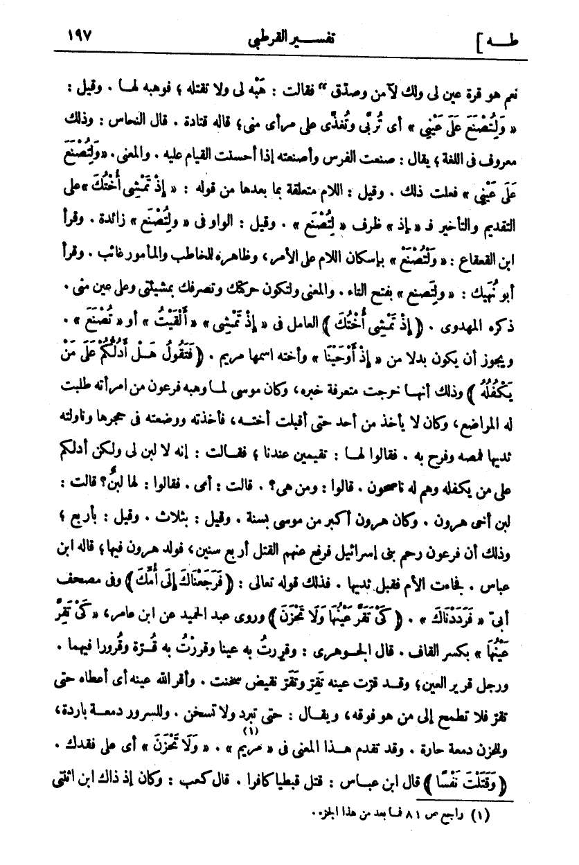 نَعَمْ هُوَ قُرَّةُ عَيْنٍ لِي وَلَكِ لَآمَنَ وَصَدَّقَ) فَقَالَتْ: هَبْهُ لِي وَلَا تَقْتُلْهُ، فَوَهَبَهُ لَهَا. وَقِيلَ:" وَلِتُصْنَعَ عَلى عَيْنِي" أَيْ تُرَبَّى وَتُغَذَّى عَلَى مَرْأًى مِنِّي، قَالَهُ قَتَادَةُ. قَالَ النَّحَّاسُ: وَذَلِكَ مَعْرُوفٌ فِي اللُّغَةِ، يُقَالُ: صَنَعْتُ الفرس وأصنعت إِذَا أَحْسَنْتُ الْقِيَامَ عَلَيْهِ. وَالْمَعْنَى." وَلِتُصْنَعَ عَلى عَيْنِي ٢٠: ٣٩" فَعَلْتُ ذَلِكَ. وَقِيلَ: اللَّامُ مُتَعَلِّقَةٌ بِمَا بَعْدَهَا مِنْ قَوْلِهِ:" إِذْ تَمْشِي أُخْتُكَ" عَلَى التَّقْدِيمِ وَالتَّأْخِيرِ ف"- إِذْ" ظَرْفٌ" لِتُصْنَعَ". وَقِيلَ: الْوَاوُ فِي" وَلِتُصْنَعَ" زَائِدَةٌ. وَقَرَأَ ابْنُ الْقَعْقَاعِ" وَلِتُصْنَعْ" بِإِسْكَانِ اللَّامِ عَلَى الْأَمْرِ، وَظَاهِرُهُ لِلْمُخَاطَبِ وَالْمَأْمُورُ غَائِبٌ. وَقَرَأَ أَبُو نَهِيكٍ:" وَلِتَصْنَعَ" بِفَتْحِ التَّاءِ. وَالْمَعْنَى وَلِتَكُونَ حَرَكَتُكَ وَتَصَرُّفُكَ بِمَشِيئَتِي وَعَلَى عَيْنٍ مِنِّي. ذَكَرَهُ الْمَهْدَوِيُّ." إِذْ تَمْشِي أُخْتُكَ" الْعَامِلُ فِي" إِذْ تَمْشِي ٢٠: ٤٠"" أَلْقَيْتُ" أَوْ" تُصْنَعَ". وَيَجُوزُ أَنْ يَكُونَ بَدَلًا مِنْ" إِذْ أَوْحَيْنا" وَأُخْتُهُ اسْمُهَا مَرْيَمُ. (فَتَقُولُ هَلْ أَدُلُّكُمْ عَلى مَنْ يَكْفُلُهُ) وَذَلِكَ أَنَّهَا خَرَجَتْ مُتَعَرِّفَةً خَبَرَهُ، وَكَانَ مُوسَى لَمَّا وَهَبَهُ فِرْعَوْنُ مِنَ امْرَأَتِهِ طلبت له المراضع، كان لَا يَأْخُذُ مِنْ أَحَدٍ حَتَّى أَقْبَلَتْ أُخْتُهُ، فَأَخَذَتْهُ وَوَضَعَتْهُ فِي حِجْرِهَا وَنَاوَلَتْهُ ثَدْيَهَا فَمَصَّهُ وَفَرِحَ بِهِ. فَقَالُوا لَهَا: تُقِيمِينَ عِنْدَنَا، فَقَالَتْ: إِنَّهُ لَا لَبَنَ لِي وَلَكِنْ أَدُلُّكُمْ عَلَى مَنْ يَكْفُلُهُ وَهُمْ لَهُ نَاصِحُونَ. قَالُوا: وَمَنْ هِيَ؟. قَالَتْ: أُمِّي. فَقَالُوا: لَهَا لَبَنٌ؟ قَالَتْ: لبن أخى هرون. وكان هرون أَكْبَرَ مِنْ مُوسَى بِسَنَةٍ. وَقِيلَ: بِثَلَاثٍ. وَقِيلَ: بِأَرْبَعٍ، وَذَلِكَ أَنَّ فِرْعَوْنَ رَحِمَ بَنِي إِسْرَائِيلَ فَرَفَعَ عَنْهُمُ الْقَتْلَ أَرْبَعَ سِنِينَ، فَوُلِدَ هَارُونُ فيها، قاله ابن عباس. فجاءت الام فقبل ثديها. فذلك قوله تعالى: (فَرَجَعْناكَ إِلى أُمِّكَ) ٢٠: ٤٠ وَفَى مُصْحَفِ أُبَيٍّ" فَرَدَدْنَاكَ". (كَيْ تَقَرَّ عَيْنُها وَلا تَحْزَنَ) وَرَوَى عَبْدُ الْحَمِيدِ عَنِ ابْنِ عَامِرٍ" كَيْ تَقَرَّ عَيْنُها" بِكَسْرِ الْقَافِ. قَالَ الْجَوْهَرِيُّ: وَقَرِرْتُ بِهِ عَيْنًا وَقَرَرْتُ بِهِ قُرَّةً وَقُرُورًا فِيهِمَا. وَرَجُلٌ قَرِيرُ الْعَيْنِ، وَقَدْ قَرَّتْ عَيْنُهُ تَقِرُّ وَتَقَرُّ نَقِيضَ سَخِنَتْ. وَأَقَرَّ اللَّهُ عَيْنَهُ أَيْ أَعْطَاهُ حَتَّى تَقَرَّ فَلَا تَطْمَحُ إِلَى مَنْ هُوَ فَوْقَهُ، وَيُقَالُ: حَتَّى تَبْرُدَ وَلَا تَسْخَنَ. وَلِلسُّرُورِ دَمْعَةٌ بَارِدَةٌ، وَلِلْحُزْنِ دَمْعَةٌ حَارَّةٌ. وَقَدْ تَقَدَّمَ هَذَا الْمَعْنَى فِي (مَرْيَمَ) «١»." وَلا تَحْزَنَ" أَيْ عَلَى فَقْدِكَ. (وَقَتَلْتَ نَفْساً) ٢٠: ٤٠ قَالَ ابْنُ عَبَّاسٍ: قَتَلَ قِبْطِيًّا كَافِرًا. قَالَ كَعْبٌ: وَكَانَ إذ ذاك ابن اثنتي