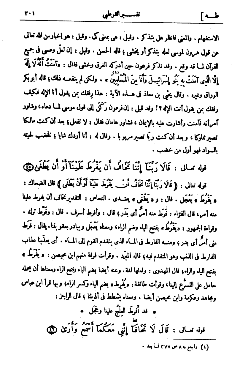 قَوْلُهُ تَعَالَى: (قَالَا رَبَّنا إِنَّنا نَخافُ أَنْ يَفْرُطَ عَلَيْنا أَوْ أَنْ يَطْغى) ٢٠: ٤٥ قال الضحاك:" يَفْرُطَ ٢٠: ٤٥" يعجل. قال: و" يَطْغى " يَعْتَدِي. النَّحَّاسُ: التَّقْدِيرُ نَخَافُ أَنْ يَفْرُطَ عَلَيْنَا مِنْهُ أَمْرٌ، قَالَ الْفَرَّاءُ: فَرَطَ مِنْهُ أَمْرٌ أَيْ بَدَرَ، قَالَ: وَأَفْرَطَ أَسْرَفَ. قَالَ: وَفَرَّطَ تَرَكَ. وَقِرَاءَةُ الْجُمْهُورِ" يَفْرُطَ" بِفَتْحِ الْيَاءِ وَضَمِّ الرَّاءِ، وَمَعْنَاهُ يَعْجَلُ وَيُبَادِرُ بِعُقُوبَتِنَا. يُقَالُ: فَرَطَ مِنِّي أَمْرٌ أَيْ بَدَرَ، وَمِنْهُ الْفَارِطُ فِي الْمَاءِ الَّذِي يَتَقَدَّمُ الْقَوْمَ إِلَى الْمَاءِ. أَيْ يُعَذِّبُنَا عَذَابَ الْفَارِطِ فِي الذَّنْبِ وَهُوَ الْمُتَقَدِّمُ فِيهِ، قَالَهُ الْمُبَرِّدُ. وَقَرَأَتْ فِرْقَةٌ مِنْهُمُ ابْنُ مُحَيْصِنٍ" يَفْرَطَ" بِفَتْحِ الْيَاءِ وَالرَّاءِ، قَالَ الْمَهْدَوِيُّ: وَلَعَلَّهَا لُغَةٌ. وَعَنْهُ أَيْضًا بِضَمِّ الْيَاءِ وَفَتْحِ الرَّاءِ وَمَعْنَاهَا أَنْ يَحْمِلَهُ حَامِلُ التَّسَرُّعِ إِلَيْنَا. وَقَرَأَتْ طَائِفَةٌ" يُفْرِطَ" بِضَمِّ الْيَاءِ وَكَسْرِ الرَّاءِ، وبها قرأ ابن عباس ومجاهد وعكرمة وَابْنُ مُحَيْصِنٍ أَيْضًا. وَمَعْنَاهُ يُشْطِطُ فِي أَذِيَّتِنَا، قَالَ الرَّاجِزُ: