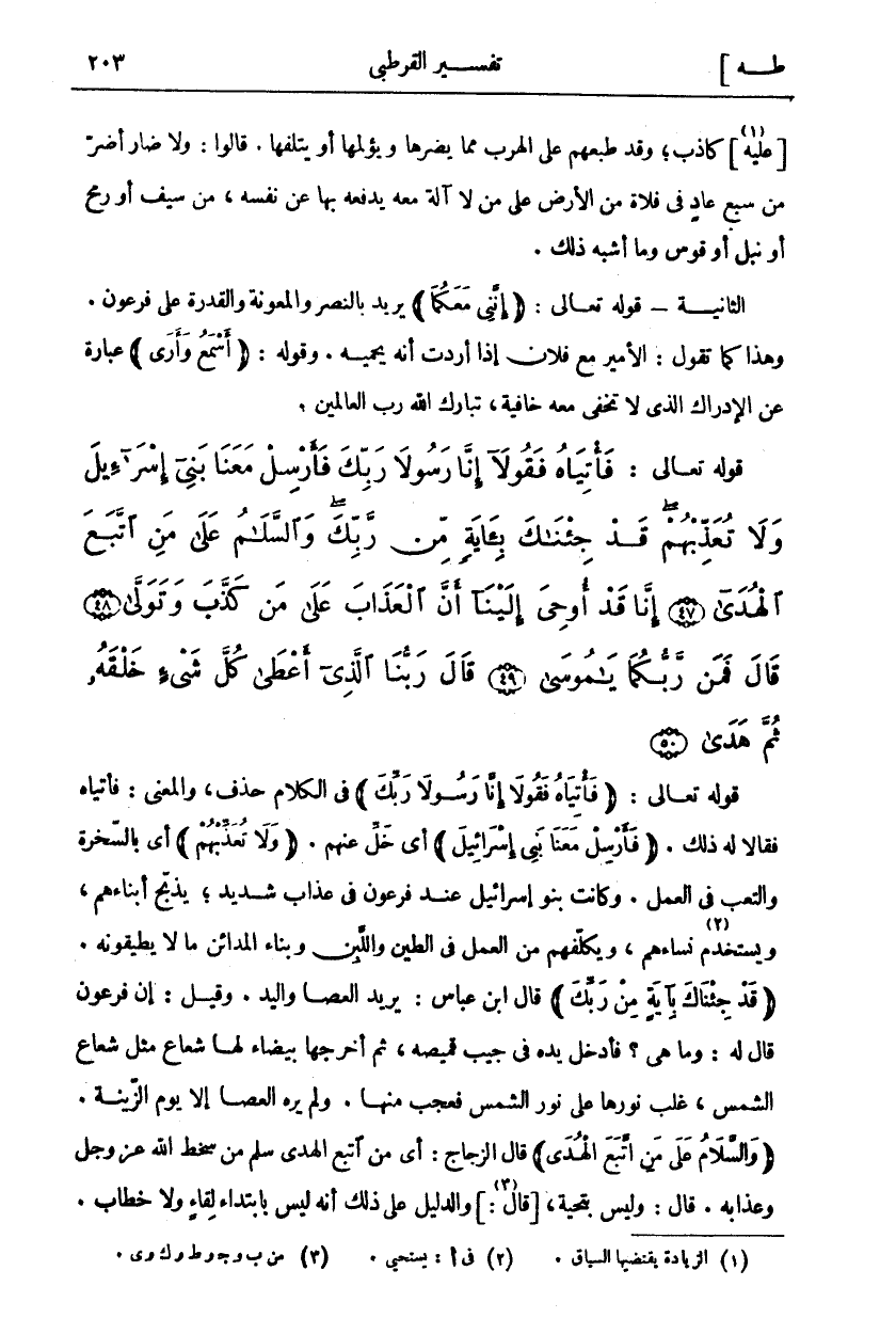 قَوْلُهُ تَعَالَى: (فَأْتِياهُ فَقُولا إِنَّا رَسُولا رَبِّكَ) ٢٠: ٤٧ فِي الْكَلَامِ حَذْفٌ، وَالْمَعْنَى: فَأَتَيَاهُ فَقَالَا لَهُ ذَلِكَ. (فَأَرْسِلْ مَعَنا بَنِي إِسْرائِيلَ) ٢٠: ٤٧ أَيْ خَلِّ عَنْهُمْ. (وَلا تُعَذِّبْهُمْ) ٢٠: ٤٧ أَيْ بِالسُّخْرَةِ وَالتَّعَبِ فِي الْعَمَلِ. وَكَانَتْ بَنُو إِسْرَائِيلَ عِنْدَ فِرْعَوْنَ فِي عَذَابٍ شَدِيدٍ، يُذَبِّحُ أَبْنَاءَهُمْ، ويستخدم «٢» نِسَاءَهُمْ، وَيُكَلِّفُهُمْ مِنَ الْعَمَلِ فِي الطِّينِ وَاللَّبِنِ وبناء المدائن مالا يُطِيقُونَهُ. (قَدْ جِئْناكَ بِآيَةٍ مِنْ رَبِّكَ) ٢٠: ٤٧ قَالَ ابْنُ عَبَّاسٍ: يُرِيدُ الْعَصَا وَالْيَدَ. وَقِيلَ: إِنَّ فِرْعَوْنَ قَالَ لَهُ: وَمَا هِيَ؟ فَأَدْخَلَ يَدَهُ فِي جَيْبِ قَمِيصِهِ، ثُمَّ أَخْرَجَهَا بَيْضَاءَ لَهَا شُعَاعٌ مِثْلَ شُعَاعِ الشَّمْسِ، غَلَبَ نُورُهَا عَلَى نُورِ الشَّمْسِ فَعَجِبَ مِنْهَا. وَلَمْ يُرِهِ الْعَصَا إِلَّا يَوْمَ الزِّينَةِ. (وَالسَّلامُ عَلى مَنِ اتَّبَعَ الْهُدى) ٢٠: ٤٧ قَالَ الزَّجَّاجُ: أَيْ مَنِ اتَّبَعَ الْهُدَى سَلِمَ مِنْ سَخَطِ اللَّهِ عَزَّ وَجَلَّ وَعَذَابِهِ. قال: وليس بتحية، [قال: «٣»] وَالدَّلِيلُ عَلَى ذَلِكَ أَنَّهُ لَيْسَ بِابْتِدَاءِ لِقَاءٍ ولا خطاب.
