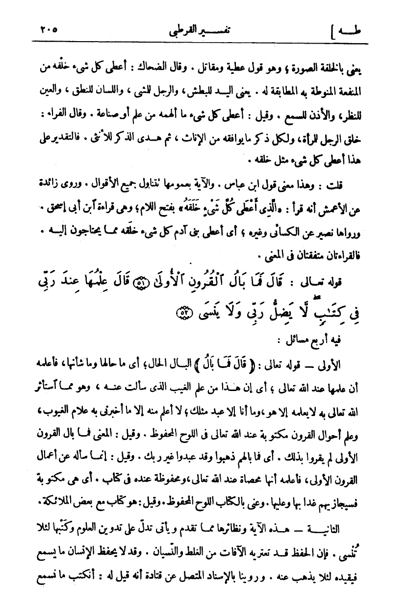 فِيهِ أَرْبَعُ مَسَائِلَ: الْأُولَى- قَوْلُهُ تَعَالَى: (قالَ فَما بالُ) ٢٠: ٥١ الْبَالُ الْحَالُ، أَيْ وَمَا حَالُهَا وَمَا شَأْنُهَا، فَأَعْلَمَهُ أَنَّ عِلْمَهَا عِنْدَ اللَّهِ تَعَالَى، أَيْ إِنَّ هَذَا مِنْ عِلْمِ الْغَيْبِ الَّذِي سَأَلْتُ عَنْهُ، وَهُوَ مِمَّا اسْتَأْثَرَ اللَّهُ تَعَالَى بِهِ لَا يَعْلَمُهُ إِلَّا هُوَ، وَمَا أَنَا إِلَّا عَبْدٌ مِثْلُكَ لَا أعلم منه إِلَّا مَا أَخْبَرَنِي بِهِ عَلَّامُ الْغُيُوبِ، وَعِلْمُ أحوال القرون مكتوبة عند الله تعالى فِي اللَّوْحِ الْمَحْفُوظِ. وَقِيلَ: الْمَعْنَى فَمَا بَالُ الْقُرُونِ الْأُولَى لَمْ يُقِرُّوا بِذَلِكَ. أَيْ فَمَا بَالُهُمْ ذَهَبُوا وَقَدْ عَبَدُوا غَيْرَ رَبِّكَ. وَقِيلَ: إنما سأله عَنْ أَعْمَالِ الْقُرُونِ الْأُولَى فَأَعْلَمَهُ أَنَّهَا مُحْصَاةٌ عِنْدَ اللَّهِ تَعَالَى، وَمَحْفُوظَةٌ عِنْدَهُ فِي كِتَابٍ. أَيْ هِيَ مَكْتُوبَةٌ فَسَيُجَازِيهِمْ غَدًا بِهَا وَعَلَيْهَا. وَعَنَى بِالْكِتَابِ اللَّوْحَ الْمَحْفُوظَ. وَقِيلَ: هُوَ كِتَابٌ مَعَ بَعْضِ الْمَلَائِكَةِ. الثَّانِيَةُ- هَذِهِ الْآيَةُ وَنَظَائِرُهَا مِمَّا تَقَدَّمَ وَيَأْتِي تَدُلُّ عَلَى تَدْوِينِ الْعُلُومِ وَكَتْبِهَا لِئَلَّا تُنْسَى. فَإِنَّ الْحِفْظَ قَدْ تَعْتَرِيهِ الْآفَاتُ مِنَ الْغَلَطِ وَالنِّسْيَانِ. وَقَدْ لَا يَحْفَظُ الْإِنْسَانُ مَا يَسْمَعُ فَيُقَيِّدُهُ لِئَلَّا يَذْهَبَ عَنْهُ. وَرُوِّينَا بِالْإِسْنَادِ الْمُتَّصِلِ عَنْ قَتَادَةَ أَنَّهُ قِيلَ لَهُ: أَنَكْتُبُ مَا نَسْمَعُ