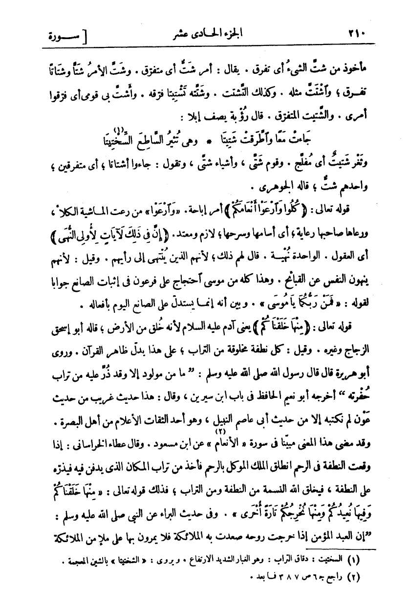 وَثَغْرٌ شَتِيتٌ أَيْ مُفَلَّجٌ. وَقَوْمٌ شَتَّى، وَأَشْيَاءُ شَتَّى، وَتَقُولُ: جَاءُوا أَشْتَاتًا، أَيْ مُتَفَرِّقِينَ، وَاحِدُهُمْ شَتٌّ، قَالَهُ الْجَوْهَرِيُّ. قَوْلُهُ تَعَالَى: (كُلُوا وَارْعَوْا أَنْعامَكُمْ) ٢٠: ٥٤ أَمْرُ إِبَاحَةٍ." وَارْعَوْا ٢٠: ٥٤" مِنْ رَعَتِ الْمَاشِيَةُ الْكَلَأَ، وَرَعَاهَا صاحبها رعاية، أي أسامها وسرحها، لازم ومعتد. (إِنَّ فِي ذلِكَ لَآياتٍ لِأُولِي النُّهى) أَيِ الْعُقُولِ. الْوَاحِدَةُ نُهْيَةٌ. قَالَ لَهُمْ ذَلِكَ، لِأَنَّهُمُ الَّذِينَ يُنْتَهَى إِلَى رَأْيِهِمْ. وَقِيلَ: لِأَنَّهُمْ يَنْهَوْنَ النَّفْسَ عَنِ الْقَبَائِحِ. وَهَذَا كُلُّهُ مِنْ مُوسَى احْتِجَاجٌ عَلَى فِرْعَوْنَ فِي إِثْبَاتِ الصَّانِعِ جَوَابًا لِقَوْلِهِ:" فَمَنْ رَبُّكُما يَا مُوسى ٢٠: ٤٩". وَبَيَّنَ أَنَّهُ إِنَّمَا يُسْتَدَلُّ عَلَى الصَّانِعِ الْيَوْمَ بِأَفْعَالِهِ. قَوْلُهُ تَعَالَى: (مِنْها خَلَقْناكُمْ) ٢٠: ٥٥ يَعْنِي آدَمَ عَلَيْهِ السَّلَامُ لِأَنَّهُ خُلِقَ مِنَ الْأَرْضِ، قَالَهُ أَبُو إِسْحَاقَ الزَّجَّاجُ وَغَيْرُهُ. وَقِيلَ: كُلُّ نُطْفَةٍ مَخْلُوقَةٍ مِنَ التُّرَابِ، عَلَى هَذَا يَدُلُّ ظَاهِرُ الْقُرْآنِ. وَرَوَى أَبُو هُرَيْرَةَ قَالَ قَالَ رَسُولُ اللَّهِ صَلَّى اللَّهُ عَلَيْهِ وَسَلَّمَ: (مَا مِنْ مَوْلُودٍ إِلَّا وَقَدْ ذُرَّ عَلَيْهِ مِنْ تُرَابِ حُفْرَتِهِ) أَخْرَجَهُ أَبُو نُعَيْمٍ الْحَافِظُ فِي بَابِ ابْنِ سِيرِينَ، وَقَالَ: هَذَا حَدِيثٌ غَرِيبٌ مِنْ حَدِيثِ عَوْنٍ لَمْ نَكْتُبْهُ إِلَّا مِنْ حَدِيثِ أَبِي عَاصِمٍ النَّبِيلِ، وَهُوَ أَحَدُ الثِّقَاتِ الْأَعْلَامِ مِنْ أَهْلِ الْبَصْرَةِ. وَقَدْ مَضَى هَذَا الْمَعْنَى مُبَيَّنًا فِي سُورَةِ (الْأَنْعَامِ) «٢» عَنِ ابْنِ مَسْعُودٍ. وَقَالَ عَطَاءٌ الْخُرَاسَانِيُّ: إِذَا وَقَعَتِ النُّطْفَةُ فِي الرَّحِمِ انْطَلَقَ الْمَلَكُ الْمُوَكَّلُ بِالرَّحِمِ فَأَخَذَ مِنْ تُرَابِ الْمَكَانِ الَّذِي يُدْفَنُ فِيهِ فَيَذُرُّهُ عَلَى النُّطْفَةِ فَيَخْلُقُ اللَّهُ النَّسَمَةَ مِنَ النُّطْفَةِ وَمِنَ التُّرَابِ، فَذَلِكَ قَوْلُهُ تَعَالَى:" مِنْها خَلَقْناكُمْ وَفِيها نُعِيدُكُمْ وَمِنْها نُخْرِجُكُمْ تارَةً أُخْرى ٢٠: ٥٥". وَفِي حَدِيثِ الْبَرَاءِ عَنِ النَّبِيِّ صَلَّى اللَّهُ عَلَيْهِ وَسَلَّمَ: (أَنَّ الْعَبْدَ الْمُؤْمِنَ إِذَا خَرَجَتْ رُوحُهُ صَعِدَتْ بِهِ الْمَلَائِكَةُ فَلَا يَمُرُّونَ بِهَا عَلَى مَلَأٍ مِنَ الْمَلَائِكَةِ