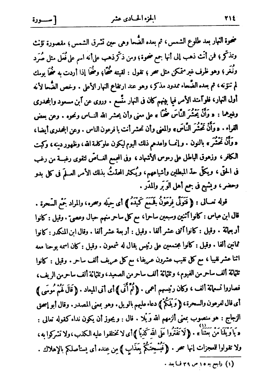 ضَحْوَةُ النَّهَارِ بَعْدَ طُلُوعِ الشَّمْسِ، ثُمَّ بَعْدَهُ الضحا وَهِيَ حِينَ تُشْرِقُ الشَّمْسُ، مَقْصُورَةً تُؤَنَّثُ وَتُذَكَّرُ، فَمَنْ أَنَّثَ ذَهَبَ إِلَى أَنَّهَا جَمْعُ ضَحْوَةٍ، وَمَنْ ذَكَّرَ ذَهَبَ إِلَى أَنَّهُ اسْمٌ عَلَى فِعْلٍ مِثْلَ صُرَدٍ وَنُغَرٍ، وَهُوَ ظَرْفٌ غَيْرُ مُتَمَكِّنٍ مِثْلَ سَحَرٍ، تَقُولُ: لَقِيتُهُ ضُحًا، وَضُحَا إذ أَرَدْتَ بِهِ ضُحَا يَوْمِكَ لَمْ تُنَوِّنْهُ، ثُمَّ بَعْدَهُ الضَّحَاءُ مَمْدُودٌ مُذَكَّرٌ، وَهُوَ عِنْدَ ارْتِفَاعِ النهار الأعلى. وخص الضحا لِأَنَّهُ أَوَّلُ النَّهَارِ، فَلَوِ امْتَدَّ الْأَمْرُ فِيمَا بَيْنَهُمْ كَانَ فِي النَّهَارِ مُتَّسَعٌ. وَرُوِيَ عَنِ ابْنِ مَسْعُودٍ وَالْجَحْدَرِيِّ وَغَيْرِهِمَا:" وَأَنْ يُحْشَرَ النَّاسُ ضُحًى ٢٠: ٥٩" عَلَى مَعْنَى وَأَنْ يَحْشُرَ اللَّهُ النَّاسَ وَنَحْوِهِ. وَعَنْ بَعْضِ الْقُرَّاءِ" وَأَنْ تَحْشُرَ النَّاسَ" وَالْمَعْنَى وَأَنْ تَحْشُرَ أَنْتَ يَا فِرْعَوْنُ النَّاسَ وَعَنِ الْجَحْدَرِيِّ أَيْضًا" وَأَنْ نَحْشُرَ" بِالنُّونِ وَإِنَّمَا وَاعَدَهُمْ ذَلِكَ الْيَوْمَ لِيَكُونَ عُلُوُّ كَلِمَةِ اللَّهِ، وَظُهُورُ دِينِهِ، وَكَبْتُ الْكَافِرِ، وَزُهُوقُ الْبَاطِلِ عَلَى رُءُوسِ الْأَشْهَادِ، وَفِي الْمَجْمَعِ الْغَاصِّ لِتَقْوَى رَغْبَةُ مَنْ رَغِبَ فِي الْحَقِّ، وَيَكِلَّ حَدَّ الْمُبْطِلِينَ وَأَشْيَاعِهِمْ، وَيُكْثِرَ الْمُحَدِّثُ بِذَلِكَ الْأَمْرِ الْعِلْمَ فِي كُلِّ بَدْوٍ وَحَضَرٍ، وَيَشِيعَ فِي جَمْعِ أَهْلِ الْوَبَرِ وَالْمَدَرِ. قَوْلُهُ تَعَالَى: (فَتَوَلَّى فِرْعَوْنُ فَجَمَعَ كَيْدَهُ) ٢٠: ٦٠ أَيْ حِيَلَهُ وَسِحْرَهُ، وَالْمُرَادُ جَمْعُ السَّحَرَةِ. قَالَ ابْنُ عَبَّاسٍ: كَانُوا اثْنَيْنِ وَسَبْعِينَ سَاحِرًا، مَعَ كُلِّ سَاحِرٍ مِنْهُمْ حِبَالٌ وَعِصِيٌّ. وَقِيلَ: كَانُوا أَرْبَعَمِائَةٍ. وَقِيلَ: كَانُوا اثْنَيْ عَشَرَ أَلْفًا. وَقِيلَ: أربعة عشرا أَلْفًا. وَقَالَ ابْنُ الْمُنْكَدِرِ: كَانُوا ثَمَانِينَ أَلْفًا. وقيل: كانوا مجتمعين عَلَى رَئِيسٍ يُقَالُ لَهُ شَمْعُونُ. وَقِيلَ: كَانَ اسْمُهُ يُوحَنَّا مَعَهُ اثْنَا عَشَرَ نَقِيبًا، مَعَ كُلِّ نَقِيبٍ عِشْرُونَ عَرِيفًا، مَعَ كُلِّ عَرِيفٍ ألف ساحر. وقيل كانوا ثلاثمائة ألف ساحر من الفيوم، وَثَلَاثَمِائَةِ أَلْفِ سَاحِرٍ مِنَ الصَّعِيدِ، وَثَلَاثَمِائَةِ أَلْفِ سَاحِرٍ مِنَ الرِّيفِ، فَصَارُوا تِسْعَمِائَةِ أَلْفٍ وَكَانَ رَئِيسُهُمْ أَعْمَى. (ثُمَّ أَتى) ٢٠: ٦٠ أَيْ أَتَى الْمِيعَادُ. (قالَ لَهُمْ مُوسى) أَيْ قَالَ لِفِرْعَوْنَ وَالسَّحَرَةِ (وَيْلَكُمْ) دُعَاءٌ عَلَيْهِمْ بِالْوَيْلِ. وَهُوَ بِمَعْنَى الْمَصْدَرِ. وَقَالَ أَبُو إِسْحَاقَ الزَّجَّاجُ: هُوَ مَنْصُوبٌ بِمَعْنَى أَلْزَمَهُمُ اللَّهُ وَيْلًا. قَالَ: وَيَجُوزُ أَنْ يَكُونَ نِدَاءً كَقَوْلِهِ تَعَالَى:" يَا وَيْلَنا مَنْ بَعَثَنا" «١» [يس: ٥٢] (لَا تَفْتَرُوا عَلَى اللَّهِ كَذِباً) ٢٠: ٦١ أَيْ لَا تَخْتَلِقُوا عَلَيْهِ الْكَذِبَ، وَلَا تُشْرِكُوا بِهِ، وَلَا تَقُولُوا لِلْمُعْجِزَاتِ إِنَّهَا سِحْرٌ. (فَيُسْحِتَكُمْ بِعَذابٍ) ٢٠: ٦١ مِنْ عنده أي يستأصلكم بالإهلاك.