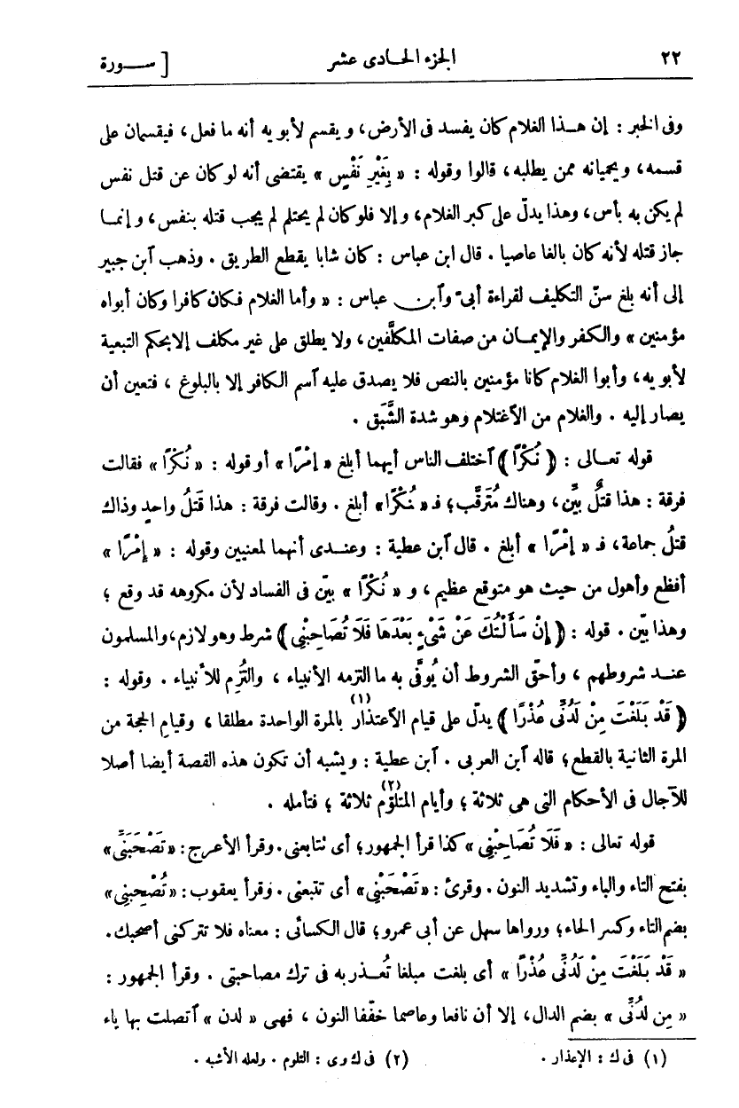 وَفِي الْخَبَرِ: إِنَّ هَذَا الْغُلَامَ كَانَ يُفْسِدُ فِي الْأَرْضِ، وَيُقْسِمُ لِأَبَوَيْهِ أَنَّهُ مَا فَعَلَ، فَيُقْسِمَانِ عَلَى قَسَمِهِ، وَيَحْمِيَانِهِ مِمَّنْ يَطْلُبُهُ، قَالُوا وَقَوْلُهُ:" بِغَيْرِ نَفْسٍ" يَقْتَضِي أَنَّهُ لَوْ كَانَ عَنْ قَتْلِ نَفْسٍ لَمْ يَكُنْ بِهِ بَأْسٌ، وَهَذَا يَدُلُّ عَلَى كِبَرِ الْغُلَامِ، وَإِلَّا فَلَوْ كَانَ لَمْ يَحْتَلِمْ لَمْ يَجِبْ قَتْلُهُ بِنَفْسٍ، وَإِنَّمَا جَازَ قَتْلُهُ لِأَنَّهُ كَانَ بَالِغًا عَاصِيًا. قَالَ ابْنُ عَبَّاسٍ: كَانَ شَابًّا يَقْطَعُ الطَّرِيقَ. وَذَهَبَ ابْنُ جُبَيْرٍ إِلَى أَنَّهُ بَلَغَ سِنَّ التَّكْلِيفِ لِقِرَاءَةِ أُبَيٍّ وَابْنِ عَبَّاسٍ" وَأَمَّا الْغُلَامُ فَكَانَ كَافِرًا وَكَانَ أَبَوَاهُ مُؤْمِنَيْنِ" وَالْكُفْرُ وَالْإِيمَانُ مِنْ صِفَاتِ الْمُكَلَّفِينَ، وَلَا يُطْلَقُ عَلَى غَيْرِ مُكَلَّفٍ إِلَّا بِحُكْمِ التَّبَعِيَّةِ لِأَبَوَيْهِ، وَأَبَوَا الْغُلَامِ كَانَا مُؤْمِنَيْنِ بِالنَّصِّ فَلَا يَصْدُقُ عَلَيْهِ اسْمُ الْكَافِرِ إِلَّا بِالْبُلُوغِ، فَتَعَيَّنَ أَنْ يُصَارَ إِلَيْهِ. وَالْغُلَامُ مِنْ الِاغْتِلَامِ وَهُوَ شِدَّةُ الشَّبَقِ. قَوْلُهُ تَعَالَى:" نُكْراً" اخْتَلَفَ النَّاسُ أَيُّهُمَا أَبْلَغُ" أَمْراً" أَوْ قَوْلُهُ" نُكْراً" فَقَالَتْ فِرْقَةٌ: هَذَا قَتْلٌ بَيِّنٌ، وَهُنَاكَ مُتَرَقِّبٌ، فَ"- نُكْراً" أَبْلَغُ. وَقَالَتْ فِرْقَةٌ: هَذَا قَتْلُ وَاحِدٍ وَذَاكَ قَتْلُ جَمَاعَةٍ فَ" إِمْراً" أَبْلَغُ. قَالَ ابْنُ عَطِيَّةَ: وَعِنْدِي أَنَّهُمَا لِمَعْنَيَيْنِ وَقَوْلُهُ:" إِمْرًا" أَفْظَعُ وَأَهْوَلُ مِنْ حيث هو متوقع عظيم، و" نكرا" بَيِّنٌ فِي الْفَسَادِ لِأَنَّ مَكْرُوهَهُ قَدْ وَقَعَ، وهذا بين. قوله: (إِنْ سَأَلْتُكَ عَنْ شَيْءٍ بَعْدَها فَلا تُصاحِبْنِي) شَرْطٌ وَهُوَ لَازِمٌ، وَالْمُسْلِمُونَ عِنْدَ شُرُوطِهِمْ، وَأَحَقُّ الشُّرُوطِ أَنْ يُوَفَّى بِهِ مَا الْتَزَمَهُ الْأَنْبِيَاءُ، وَالْتُزِمَ لِلْأَنْبِيَاءِ. وَقَوْلُهُ: (قَدْ بَلَغْتَ مِنْ لَدُنِّي عُذْراً) يَدُلُّ عَلَى قِيَامِ الِاعْتِذَارِ «١» بِالْمَرَّةِ الْوَاحِدَةِ مُطْلَقًا، وَقِيَامِ الْحُجَّةِ مِنَ الْمَرَّةِ الثَّانِيَةِ بِالْقَطْعِ، قَالَهُ ابْنُ الْعَرَبِيِّ. ابْنُ عَطِيَّةَ: وَيُشْبِهُ أَنْ تَكُونَ هَذِهِ الْقِصَّةُ أَيْضًا أَصْلًا لِلْآجَالِ فِي الْأَحْكَامِ الَّتِي هِيَ ثَلَاثَةٌ، وَأَيَّامُ الْمُتَلَوَّمِ «٢» ثَلَاثَةٌ، فَتَأَمَّلْهُ. قَوْلُهُ تَعَالَى: (فَلا تُصاحِبْنِي) كَذَا قَرَأَ الْجُمْهُورُ أَيْ تُتَابِعُنِي. وَقَرَأَ الْأَعْرَجُ: (تَصْحَبَنِّي) بِفَتْحِ التاء والباء وتشديد النون. وقرى: (تَصْحَبْنِي) أَيْ تَتْبَعْنِي. وَقَرَأَ يَعْقُوبُ: (تُصْحِبْنِي) بِضَمِّ التَّاءِ وَكَسْرِ الْحَاءِ، وَرَوَاهَا سَهْلٌ عَنْ أَبِي عَمْرٍو قَالَ الْكِسَائِيُّ: مَعْنَاهُ فَلَا تَتْرُكُنِي أَصْحَبُكَ." قَدْ بَلَغْتَ مِنْ لَدُنِّي عُذْراً" أَيْ بَلَغْتَ مَبْلَغًا تُعْذَرُ بِهِ فِي تَرْكِ مُصَاحَبَتِي، وَقَرَأَ الْجُمْهُورُ:" مِنْ لَدُنِّي" بِضَمِّ الدَّالِ، إِلَّا أَنَّ نَافِعًا وَعَاصِمًا خَفَّفَا النُّونَ، فَهِيَ" لَدُنْ" اتَّصَلَتْ بها ياء