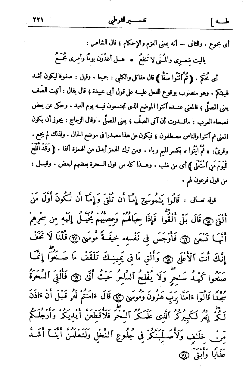 أَيْ مُحْكَمٌ. (ثُمَّ ائْتُوا صَفًّا) ٢٠: ٦٤ قَالَ مُقَاتِلٌ وَالْكَلْبِيُّ: جَمِيعًا. وَقِيلَ: صُفُوفًا لِيَكُونَ أَشَدَّ لِهَيْبَتِكُمْ. وَهُوَ مَنْصُوبٌ بِوُقُوعِ الْفِعْلِ عَلَيْهِ عَلَى قَوْلِ أَبِي عُبَيْدَةَ، قَالَ يُقَالُ: أَتَيْتُ الصَّفَّ يَعْنِي الْمُصَلَّى، فَالْمَعْنَى عِنْدَهُ ائْتُوا الْمَوْضِعَ الَّذِي تَجْتَمِعُونَ فِيهِ يَوْمَ الْعِيدِ. وَحُكِيَ عَنْ بَعْضِ فُصَحَاءِ الْعَرَبِ: مَا قَدَرْتُ أَنْ آتِيَ الصَّفَّ، يَعْنِي الْمُصَلَّى. وَقَالَ الزَّجَّاجُ: يَجُوزُ أَنْ يَكُونَ الْمَعْنَى ثُمَّ ائْتُوا وَالنَّاسُ مُصْطَفُّونَ، فَيَكُونُ عَلَى هَذَا مَصْدَرًا في موضع الحال. ولذلك لم يجمع. وقرى:" ثُمِّ ايِتُوا" بِكَسْرِ الْمِيمِ وَيَاءٍ. وَمَنْ تَرَكَ الْهَمْزَةَ أَبْدَلَ مِنَ الْهَمْزَةِ أَلِفًا. (وَقَدْ أَفْلَحَ الْيَوْمَ مَنِ اسْتَعْلى) ٢٠: ٦٤ أَيْ مَنْ غَلَبَ. وَهَذَا كُلُّهُ مِنْ قَوْلِ السَّحَرَةِ بَعْضِهِمْ لِبَعْضٍ. وَقِيلَ: من قول فرعون لهم.