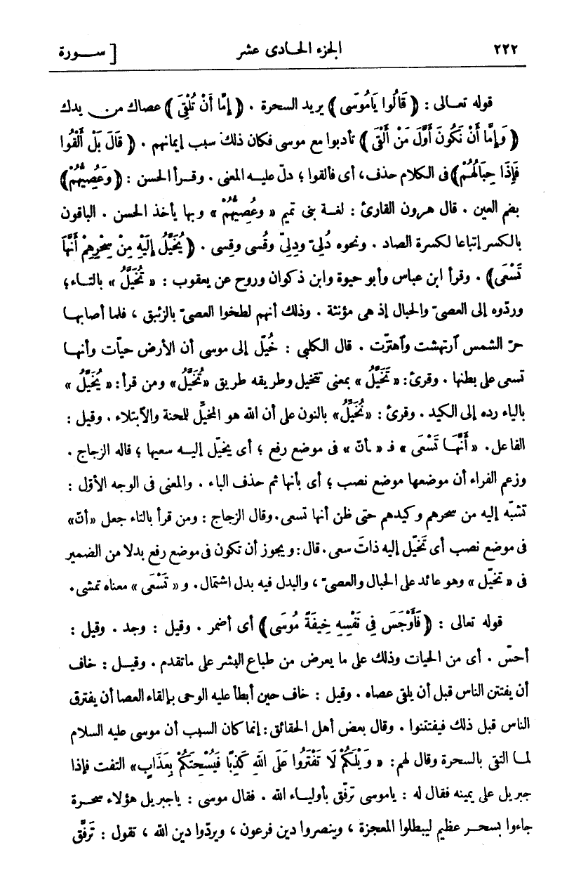 قَوْلُهُ تَعَالَى: (قالُوا يَا مُوسى) يُرِيدُ السَّحَرَةَ. (إِمَّا أَنْ تُلْقِيَ) عَصَاكَ مِنْ يَدِكَ (وَإِمَّا أَنْ نَكُونَ أَوَّلَ مَنْ أَلْقى) تَأَدَّبُوا مَعَ مُوسَى فَكَانَ ذَلِكَ سَبَبَ إِيمَانِهِمْ. (قالَ بَلْ أَلْقُوا فَإِذا حِبالُهُمْ) ٢٠: ٦٦ فِي الْكَلَامِ حَذْفٌ، أَيْ فَأَلْقَوْا، دَلَّ عَلَيْهِ الْمَعْنَى. وَقَرَأَ الْحَسَنُ: (وَعُصِيَّهُمْ) بِضَمِّ الْعَيْنِ. قَالَ هَارُونُ الْقَارِئُ: لُغَةُ بَنِي تَمِيمٍ" وَعُصِيُّهُمْ" وَبِهَا يَأْخُذُ الْحَسَنُ. الْبَاقُونَ بِالْكَسْرِ اتِّبَاعًا لِكَسْرَةِ الصَّادِ. وَنَحْوُهُ دُلِيٌّ وَدِلِيٌّ وَقُسِيٌّ وَقِسِيٌّ. (يُخَيَّلُ إِلَيْهِ مِنْ سِحْرِهِمْ أَنَّها تَسْعى) ٢٠: ٦٦. وَقَرَأَ ابْنُ عَبَّاسٍ وَأَبُو حَيْوَةَ وَابْنُ ذَكْوَانَ وَرَوْحٌ عَنْ يَعْقُوبَ:" تُخَيَّلُ" بِالتَّاءِ، وَرَدُّوهُ إِلَى الْعِصِيِّ وَالْحِبَالِ إِذْ هِيَ مُؤَنَّثَةٌ. وَذَلِكَ أَنَّهُمْ لَطَّخُوا الْعِصِيَّ بِالزِّئْبَقِ، فَلَمَّا أَصَابَهَا حَرُّ الشَّمْسِ ارْتَهَشَتْ وَاهْتَزَّتْ. قَالَ الْكَلْبِيُّ: خُيِّلَ إِلَى مُوسَى أَنَّ الْأَرْضَ حَيَّاتٌ وَأَنَّهَا تَسْعَى عَلَى بَطْنِهَا. وقرى:" تَخَيَّلُ" بِمَعْنَى تَتَخَيَّلُ وَطَرِيقُهُ طَرِيقُ" تُخَيَّلُ" وَمَنْ قرأ" يخيل" بالياء رده إلى الكيد. وقرى" نُخَيِّلُ" بِالنُّونِ عَلَى أَنَّ اللَّهَ هُوَ الْمُخَيِّلُ لِلْمِحْنَةِ وَالِابْتِلَاءِ. وَقِيلَ: الْفَاعِلُ." أَنَّها تَسْعى " فَ"- أَنَّ" فِي مَوْضِعِ رَفْعٍ، أَيْ يُخَيَّلُ إِلَيْهِ سَعْيُهَا، قَالَهُ الزَّجَّاجُ. وَزَعَمَ الْفَرَّاءُ أَنَّ مَوْضِعَهَا مَوْضِعُ نَصْبٍ، أَيْ بِأَنَّهَا ثُمَّ حَذَفَ الْبَاءَ. وَالْمَعْنَى فِي الْوَجْهِ الْأَوَّلِ: تَشَبَّهَ إِلَيْهِ مِنْ سِحْرِهِمْ وَكَيْدِهِمْ حَتَّى ظَنَّ أَنَّهَا تَسْعَى. وَقَالَ الزَّجَّاجُ: وَمَنْ قَرَأَ بِالتَّاءِ جَعَلَ" أَنَّ" فِي مَوْضِعِ نَصْبٍ أَيْ تُخَيَّلُ إِلَيْهِ ذَاتَ سَعْيٍ. قَالَ: وَيَجُوزُ أَنْ تَكُونَ فِي مَوْضِعِ رَفْعٍ بَدَلًا مِنَ الضَّمِيرِ فِي" تَخَيَّلُ" وَهُوَ عَائِدٌ عَلَى الْحِبَالِ وَالْعِصِيِّ، وَالْبَدَلُ فِيهِ بَدَلُ اشْتِمَالٍ. و" تَسْعى " مَعْنَاهُ تَمْشِي. قَوْلُهُ تَعَالَى: (فَأَوْجَسَ فِي نَفْسِهِ خِيفَةً مُوسى) أَيْ أَضْمَرَ. وَقِيلَ: وَجَدَ. وَقِيلَ: أَحَسَّ. أَيْ مِنَ الْحَيَّاتِ وَذَلِكَ عَلَى مَا يَعْرِضُ مِنْ طِبَاعِ الْبَشَرِ عَلَى مَا تَقَدَّمَ. وَقِيلَ: خَافَ أَنْ يَفْتَتِنَ النَّاسُ قَبْلَ أَنْ يُلْقِيَ عَصَاهُ. وَقِيلَ: خَافَ حِينَ أَبْطَأَ عَلَيْهِ الْوَحْيُ بِإِلْقَاءِ الْعَصَا أَنْ يَفْتَرِقَ النَّاسُ قَبْلَ ذلك فيفتتنوا. وقال بعض أهل الحقائق: إن كَانَ السَّبَبُ أَنَّ مُوسَى عَلَيْهِ السَّلَامُ لَمَّا الْتَقَى بِالسَّحَرَةِ وَقَالَ لَهُمْ:" وَيْلَكُمْ لَا تَفْتَرُوا عَلَى اللَّهِ كَذِباً فَيُسْحِتَكُمْ بِعَذابٍ ٢٠: ٦١" الْتَفَتَ فَإِذَا جِبْرِيلُ عَلَى يَمِينِهِ فَقَالَ لَهُ يَا مُوسَى تَرَفَّقْ بِأَوْلِيَاءِ اللَّهِ. فَقَالَ مُوسَى: يَا جِبْرِيلُ هَؤُلَاءِ سَحَرَةٌ جَاءُوا بِسِحْرٍ عَظِيمٍ لِيُبْطِلُوا الْمُعْجِزَةَ، وَيَنْصُرُوا دِينَ فِرْعَوْنَ، وَيَرُدُّوا دِينَ اللَّهِ، تَقُولُ: ترفق