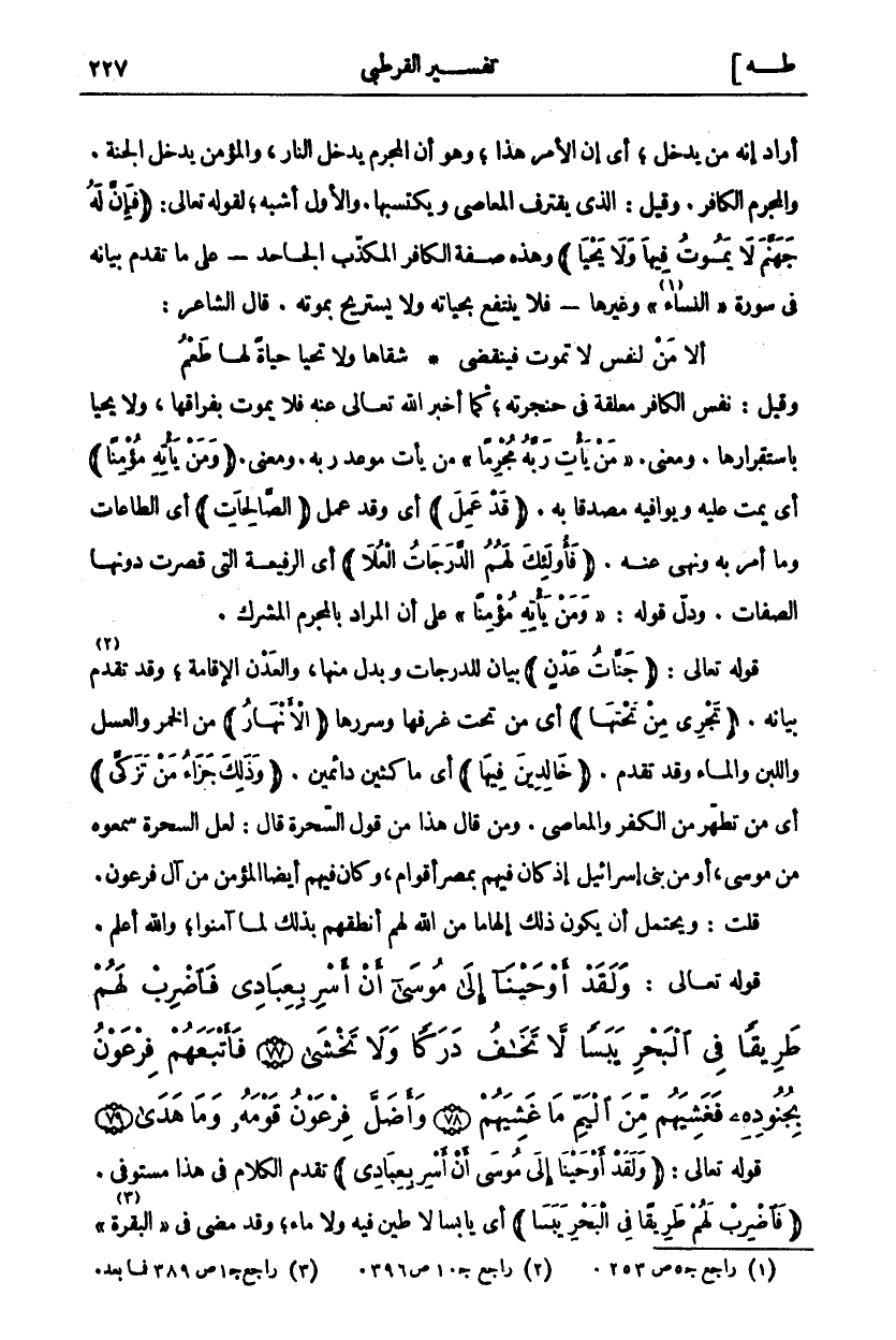 وَقِيلَ: نَفْسُ الكافر معلقة في حنجرته أَخْبَرَ اللَّهُ تَعَالَى عَنْهُ فَلَا يَمُوتُ بِفِرَاقِهَا، ولا يحيا باستقرارها. وَمَعْنَى. (مَنْ يَأْتِ رَبَّهُ مُجْرِماً) ٢٠: ٧٤ مَنْ يَأْتِ موعد ربه. ومعنى (وَمَنْ يَأْتِهِ مُؤْمِناً) ٢٠: ٧٥ أَيْ يَمُتْ عَلَيْهِ وَيُوَافِيهِ مصدقا به. (قَدْ عَمِلَ) أَيْ وَقَدْ عَمِلَ" الصَّالِحاتِ" أَيِ الطَّاعَاتِ وَمَا أُمِرَ بِهِ وَنُهِيَ عَنْهُ. (فَأُولئِكَ لَهُمُ الدَّرَجاتُ الْعُلى) ٢٠: ٧٥ أَيِ الرَّفِيعَةُ الَّتِي قَصُرَتْ دُونَهَا الصِّفَاتُ. وَدَلَّ قَوْلُهُ:" وَمَنْ يَأْتِهِ مُؤْمِناً ٢٠: ٧٥" عَلَى أَنَّ الْمُرَادَ بِالْمُجْرِمِ الْمُشْرِكُ. قَوْلُهُ تَعَالَى: (جَنَّاتُ عَدْنٍ) بَيَانٌ لِلدَّرَجَاتِ وَبَدَلٌ مِنْهَا، وَالْعَدْنُ الْإِقَامَةُ. وَقَدْ تَقَدَّمَ «٢» بَيَانُهُ. (تَجْرِي مِنْ تَحْتِهَا) أَيْ مِنْ تَحْتِ غُرَفِهَا وَسُرُرِهَا (الْأَنْهارُ) مِنَ الْخَمْرِ وَالْعَسَلِ وَاللَّبَنِ وَالْمَاءِ. وَقَدْ تَقَدَّمَ. (خالِدِينَ فِيها) أَيْ مَاكِثِينَ دَائِمِينَ. (وَذلِكَ جَزاءُ مَنْ تَزَكَّى) ٢٠: ٧٦ أَيْ مَنْ تَطَهَّرَ مِنَ الْكُفْرِ وَالْمَعَاصِي. وَمَنْ قَالَ هَذَا مِنْ قَوْلِ السَّحَرَةِ قَالَ: لَعَلَّ السَّحَرَةَ سَمِعُوهُ مِنْ مُوسَى أَوْ مِنْ بَنِي إِسْرَائِيلَ إِذْ كَانَ فِيهِمْ بِمِصْرَ أَقْوَامٌ، وَكَانَ فِيهِمْ أَيْضًا الْمُؤْمِنُ مِنْ آلِ فِرْعَوْنَ. قُلْتُ: وَيَحْتَمِلُ أَنْ يَكُونَ ذَلِكَ إِلْهَامًا مِنَ اللَّهِ لَهُمْ أَنْطَقَهُمْ بذلك لما آمنوا، والله أعلم.