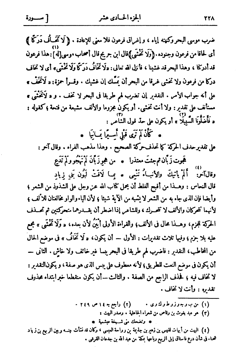 قَالَ النَّحَّاسُ: وَهَذَا مِنْ أَقْبَحِ الْغَلَطِ أَنْ يُحْمَلَ كِتَابُ اللَّهِ عَزَّ وَجَلَّ عَلَى الشُّذُوذِ مِنَ الشِّعْرِ، وَأَيْضًا فَإِنَّ الَّذِي جَاءَ بِهِ مِنَ الشِّعْرِ لَا يُشْبِهُ مِنَ الْآيَةِ شَيْئًا، لِأَنَّ الْيَاءَ وَالْوَاوَ مُخَالِفَتَانِ لِلْأَلِفِ، لِأَنَّهُمَا تَتَحَرَّكَانِ وَالْأَلِفُ لَا تَتَحَرَّكُ، وَلِلشَّاعِرِ إِذَا اضْطُرَّ أَنْ يُقَدِّرَهُمَا مُتَحَرِّكَتَيْنِ ثُمَّ تُحْذَفُ الْحَرَكَةُ لِلْجَزْمِ، وَهَذَا مُحَالٌ فِي الْأَلِفِ، وَالْقِرَاءَةُ الْأُولَى أَبْيَنُ لِأَنَّ بَعْدَهُ" وَلا تَخْشى ٢٠: ٧٧" مُجْمَعٌ عَلَيْهِ بِلَا جَزْمٍ، وَفِيهَا ثَلَاثُ تَقْدِيرَاتٍ: الْأَوَّلُ- أَنْ يَكُونَ" لَا تَخافُ ٢٠: ٧٧" فِي مَوْضِعِ الْحَالِ مِنَ الْمُخَاطَبِ، التَّقْدِيرُ: فَاضْرِبْ لَهُمْ طَرِيقًا فِي الْبَحْرِ يَبَسًا غَيْرَ خَائِفٍ وَلَا خَاشٍ. الثَّانِي أَنْ يَكُونَ فِي مَوْضِعِ النَّعْتِ لِلطَّرِيقِ، لِأَنَّهُ مَعْطُوفٌ عَلَى يَبَسٍ الَّذِي هُوَ صِفَةٌ، وَيَكُونُ التَّقْدِيرُ: لَا تَخَافُ فِيهِ، فَحَذَفَ الرَّاجِعَ مِنَ الصِّفَةِ. وَالثَّالِثُ- أَنْ يَكُونَ مُنْقَطِعًا خَبَرَ ابتداء محذوف تقديره: وأنت لا تخاف.