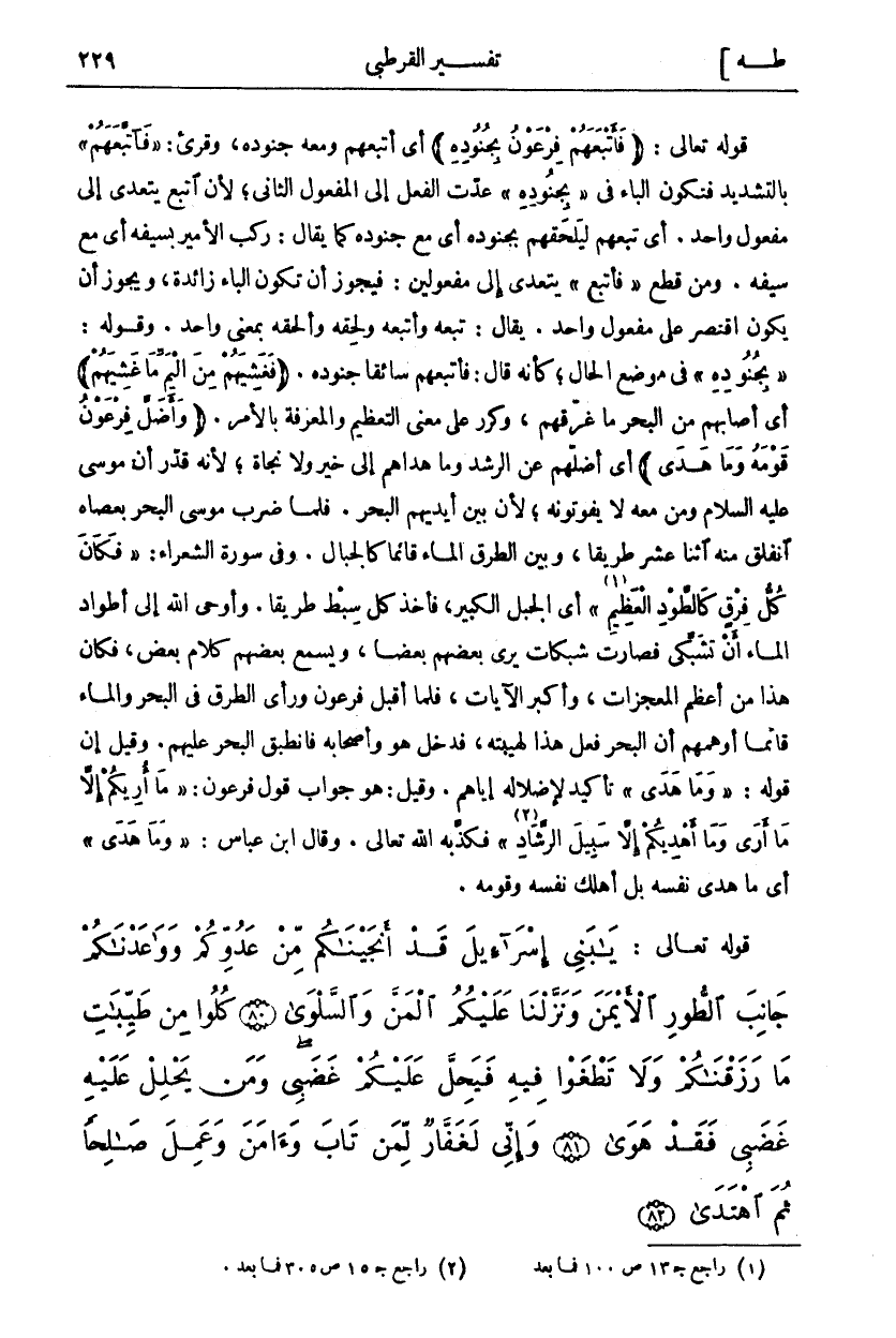 قَوْلُهُ تَعَالَى: (فَأَتْبَعَهُمْ فِرْعَوْنُ بِجُنُودِهِ) ٢٠: ٧٨ أَيِ اتَّبَعَهُمْ ومعه جنوده، وقرى" فَاتَّبَعَهُمْ" بِالتَّشْدِيدِ فَتَكُونُ الْبَاءُ فِي" بِجُنُودِهِ ٢٠: ٧٨" عَدَّتِ الْفِعْلَ إِلَى الْمَفْعُولِ الثَّانِي، لِأَنَّ اتَّبَعَ يَتَعَدَّى إِلَى مَفْعُولٍ وَاحِدٍ. أَيْ تَبِعَهُمْ لِيَلْحَقَهُمْ بِجُنُودِهِ أَيْ مَعَ جُنُودِهِ كَمَا يُقَالُ: رَكِبَ الْأَمِيرُ بِسَيْفِهِ أَيْ مَعَ سَيْفِهِ. وَمَنْ قَطَعَ" فَأَتْبَعَ" يَتَعَدَّى إِلَى مَفْعُولَيْنِ: فَيَجُوزُ أَنْ تَكُونَ الْبَاءُ زَائِدَةً، وَيَجُوزُ أَنْ يَكُونَ اقْتَصَرَ عَلَى مَفْعُولٍ وَاحِدٍ. يُقَالُ: تَبِعَهُ وَأَتْبَعَهُ وَلَحِقَهُ وَأَلْحَقَهُ بِمَعْنًى وَاحِدٍ. وَقَوْلُهُ:" بِجُنُودِهِ" فِي مَوْضِعِ الْحَالِ، كَأَنَّهُ قَالَ: فَأَتْبَعَهُمْ سَائِقًا جُنُودَهُ. (فَغَشِيَهُمْ مِنَ الْيَمِّ مَا غَشِيَهُمْ) ٢٠: ٧٨ أَيْ أَصَابَهُمْ مِنَ الْبَحْرِ مَا غَرَّقَهُمْ، وَكَرَّرَ عَلَى مَعْنَى التَّعْظِيمِ وَالْمَعْرِفَةِ بِالْأَمْرِ. (وَأَضَلَّ فِرْعَوْنُ قَوْمَهُ وَما هَدى) ٢٠: ٧٩ أَيْ أَضَلَّهُمْ عَنِ الرُّشْدِ وَمَا هَدَاهُمْ إِلَى خَيْرٍ وَلَا نَجَاةٍ، لِأَنَّهُ قَدَّرَ أَنَّ مُوسَى عَلَيْهِ السَّلَامُ وَمَنْ مَعَهُ لَا يَفُوتُونَهُ، لِأَنَّ بَيْنَ أَيْدِيهِمُ الْبَحْرَ. فَلَمَّا ضَرَبَ مُوسَى الْبَحْرَ بِعَصَاهُ انْفَلَقَ مِنْهُ اثْنَا عَشَرَ طَرِيقًا وَبَيْنَ الطُّرُقِ الْمَاءُ قَائِمًا كَالْجِبَالِ. وَفِي سُورَةِ الشُّعَرَاءِ:" فَكانَ كُلُّ فِرْقٍ كَالطَّوْدِ الْعَظِيمِ" «١» أَيِ الْجَبَلِ الْكَبِيرِ، فَأَخَذَ كُلُّ سِبْطٍ طَرِيقًا. وَأَوْحَى اللَّهُ إِلَى أَطْوَادِ الْمَاءِ أَنْ تَشَبَّكِي فَصَارَتْ شَبَكَاتٍ يَرَى بَعْضُهُمْ بعضا ويسمع بعضهم كلام بعض، فكان هَذَا مِنْ أَعْظَمِ الْمُعْجِزَاتِ، وَأَكْبَرِ الْآيَاتِ، فَلَمَّا أَقْبَلَ فِرْعَوْنُ وَرَأَى الطُّرُقَ فِي الْبَحْرِ وَالْمَاءَ قَائِمًا أَوْهَمَهُمْ أَنَّ الْبَحْرَ فَعَلَ هَذَا لِهَيْبَتِهِ، فَدَخَلَ هُوَ وَأَصْحَابُهُ فَانْطَبَقَ الْبَحْرُ عَلَيْهِمْ. وَقِيلَ إِنَّ قَوْلَهُ:" وَما هَدى ٢٠: ٧٩" تَأْكِيدٌ لِإِضْلَالِهِ إِيَّاهُمْ. وَقِيلَ: هُوَ جَوَابُ قَوْلِ فِرْعَوْنَ:" مَا أُرِيكُمْ إِلَّا مَا أَرى وَما أَهْدِيكُمْ إِلَّا سَبِيلَ الرَّشادِ ٤٠: ٢٩" «٢» [غافر: ٢٩] فَكَذَّبَهُ اللَّهُ تَعَالَى. وَقَالَ ابْنُ عَبَّاسٍ" وَما هَدى ٢٠: ٧٩" أَيْ مَا هَدَى نَفْسَهُ بَلْ أَهْلَكَ نفسه وقومه.