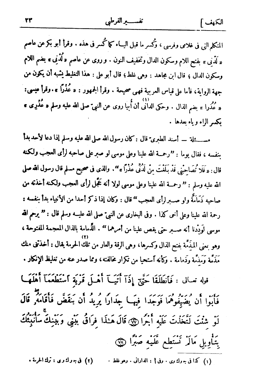 الْمُتَكَلِّمِ الَّتِي فِي غُلَامِي وَفَرَسِي، وَكُسِرَ مَا قَبْلَ الْيَاءِ كَمَا كُسِرَ فِي هَذِهِ. وَقَرَأَ أَبُو بَكْرٍ عَنْ عَاصِمٍ" لَدْنِي" بِفَتْحِ اللَّامِ وَسُكُونِ الدَّالِ وَتَخْفِيفِ النُّونِ. وَرُوِيَ عَنْ عَاصِمٍ" لُدْنِي" بِضَمِّ اللَّامِ وَسُكُونِ الدَّالِ، قَالَ ابْنُ مُجَاهِدٍ: وَهِيَ غَلَطٌ، قَالَ أَبُو عَلِيٍّ: هَذَا التَّغْلِيطُ يُشْبِهُ أَنْ يَكُونَ مِنْ جِهَةِ الرِّوَايَةِ، فَأَمَّا عَلَى قِيَاسِ الْعَرَبِيَّةِ فَهِيَ صَحِيحَةٌ. وَقَرَأَ الجمهور:" عذر". وَقَرَأَ عِيسَى:" عُذُرًا" بِضَمِّ الذَّالِ. وَحَكَى الدَّانِيُّ «١» أَنَّ أُبَيًّا رَوَى عَنِ النَّبِيِّ صَلَّى اللَّهُ عَلَيْهِ وَسَلَّمَ" عُذْرِي" بِكَسْرِ الرَّاءِ وَيَاءٍ بَعْدَهَا. مَسْأَلَةٌ: أَسْنَدَ الطَّبَرِيُّ قَالَ: كَانَ رَسُولُ اللَّهِ صَلَّى اللَّهُ عَلَيْهِ وَسَلَّمَ إِذَا دَعَا لِأَحَدٍ بَدَأَ بِنَفْسِهِ، فَقَالَ يَوْمًا:" رَحْمَةُ اللَّهِ عَلَيْنَا وَعَلَى مُوسَى لَوْ صَبَرَ عَلَى صَاحِبِهِ لَرَأَى الْعَجَبَ وَلَكِنَّهُ قَالَ:" فَلا تُصاحِبْنِي قَدْ بَلَغْتَ مِنْ لَدُنِّي عُذْراً" (. وَالَّذِي فِي صَحِيحِ مُسْلِمٍ قَالَ رَسُولُ اللَّهِ صَلَّى اللَّهُ عَلَيْهِ وَسَلَّمَ:) رَحْمَةُ اللَّهِ عَلَيْنَا وَعَلَى مُوسَى لَوْلَا أَنَّهُ عَجَلَ لَرَأَى الْعَجَبَ وَلَكِنَّهُ أَخَذَتْهُ مِنْ صَاحِبِهِ ذَمَامَةٌ وَلَوْ صَبَرَ لَرَأَى الْعَجَبَ) قَالَ: وَكَانَ إِذَا ذَكَرَ أَحَدًا مِنَ الْأَنْبِيَاءِ بَدَأَ بِنَفْسِهِ: رَحْمَةُ اللَّهِ عَلَيْنَا وَعَلَى أَخِي كَذَا. وَفِي الْبُخَارِيِّ عَنِ النَّبِيِّ صَلَّى اللَّهُ عَلَيْهِ وَسَلَّمَ قَالَ: (يَرْحَمُ اللَّهُ مُوسَى لَوَدِدْنَا أَنَّهُ صَبَرَ حَتَّى يَقُصَّ عَلَيْنَا مِنْ أَمْرِهِمَا). الذَّمَامَةَ بِالذَّالِ الْمُعْجَمَةِ الْمَفْتُوحَةِ، وَهُوَ بِمَعْنَى الْمَذَمَّةِ بِفَتْحِ الذَّالِ وَكَسْرِهَا، وَهِيَ الرِّقَّةُ وَالْعَارُ مِنْ تِلْكَ «٢» الْحُرْمَةِ: يُقَالُ أَخَذَتْنِي مِنْكَ مَذَمَّةٌ وَمَذِمَّةٌ وَذَمَامَةٌ. وَكَأَنَّهُ اسْتَحْيَا مِنْ تَكْرَارِ مُخَالَفَتِهِ، وَمِمَّا صَدَرَ عَنْهُ من تغليظ الإنكار.