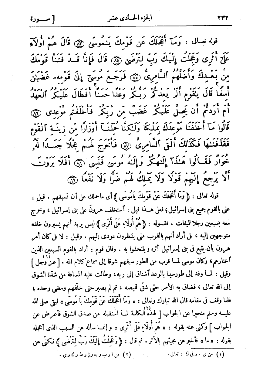 وَما أَعْجَلَكَ عَنْ قَوْمِكَ يا مُوسى (٨٣) قالَ هُمْ أُولاءِ عَلى أَثَرِي وَعَجِلْتُ إِلَيْكَ رَبِّ لِتَرْضى (٨٤) قالَ فَإِنَّا قَدْ فَتَنَّا قَوْمَكَ مِنْ بَعْدِكَ وَأَضَلَّهُمُ السَّامِرِيُّ (٨٥) فَرَجَعَ مُوسى إِلى قَوْمِهِ غَضْبانَ أَسِفاً قالَ يَا قَوْمِ أَلَمْ يَعِدْكُمْ رَبُّكُمْ وَعْداً حَسَناً أَفَطالَ عَلَيْكُمُ الْعَهْدُ أَمْ أَرَدْتُمْ أَنْ يَحِلَّ عَلَيْكُمْ غَضَبٌ مِنْ رَبِّكُمْ فَأَخْلَفْتُمْ مَوْعِدِي (٨٦) قالُوا مَا أَخْلَفْنا مَوْعِدَكَ بِمَلْكِنا وَلكِنَّا حُمِّلْنا أَوْزاراً مِنْ زِينَةِ الْقَوْمِ فَقَذَفْناها فَكَذلِكَ أَلْقَى السَّامِرِيُّ (٨٧)