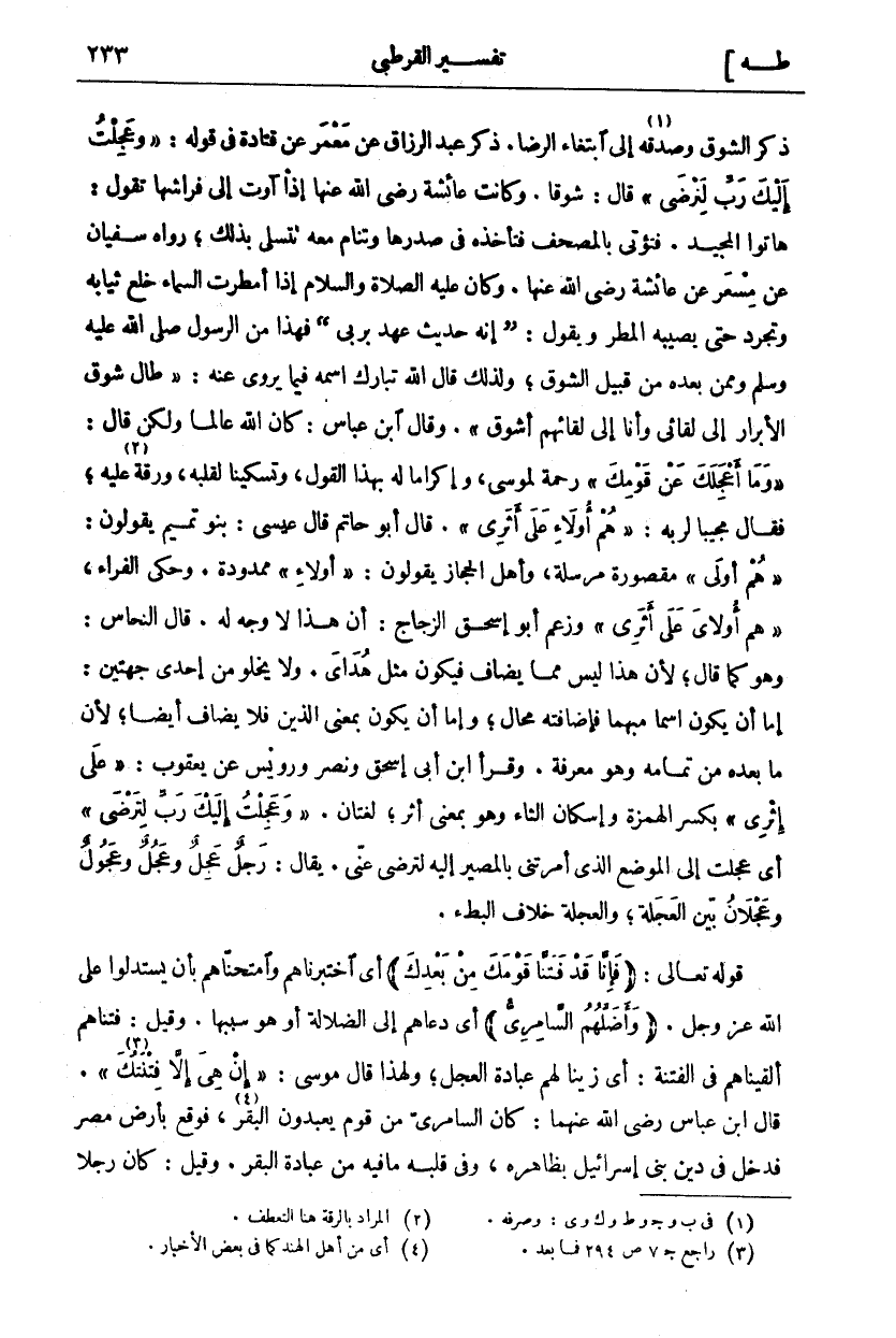 ذِكْرِ الشَّوْقِ وَصِدْقِهِ «١» إِلَى ابْتِغَاءِ الرِّضَا. ذَكَرَ عَبْدُ الرَّزَّاقِ عَنْ مَعْمَرٍ عَنْ قَتَادَةَ فِي قَوْلِهِ:" وَعَجِلْتُ إِلَيْكَ رَبِّ لِتَرْضى ٢٠: ٨٤" قَالَ: شَوْقًا. وَكَانَتْ عَائِشَةُ رَضِيَ اللَّهُ عَنْهَا إِذَا آوَتْ إِلَى فِرَاشِهَا تَقُولُ: هَاتُوا الْمَجِيدَ. فَتُؤْتَى بِالْمُصْحَفِ فَتَأْخُذُهُ فِي صَدْرِهَا وَتَنَامُ مَعَهُ تَتَسَلَّى بِذَلِكَ، رواه سفيان عن معسر عَنْ عَائِشَةَ رَضِيَ اللَّهُ عَنْهَا. وَكَانَ عَلَيْهِ الصَّلَاةُ وَالسَّلَامُ إِذَا أَمْطَرَتِ السَّمَاءُ خَلَعَ ثِيَابَهُ وَتَجَرَّدَ حَتَّى يُصِيبَهُ الْمَطَرُ وَيَقُولَ:" إِنَّهُ حَدِيثُ عَهْدٍ بِرَبِّي" فَهَذَا مِنَ الرَّسُولِ صَلَّى اللَّهُ عَلَيْهِ وَسَلَّمَ وَمِمَّنْ بَعْدَهُ مِنْ قَبِيلِ الشَّوْقِ، وَلِذَلِكَ قَالَ اللَّهُ تَبَارَكَ اسْمُهُ فِيمَا يُرْوَى عَنْهُ:" طَالَ شَوْقُ الْأَبْرَارِ إِلَى لِقَائِي وَأَنَا إلى لقائهم أشوق". وقال ابْنُ عَبَّاسٍ: كَانَ اللَّهُ عَالِمًا وَلَكِنْ قَالَ:" وَما أَعْجَلَكَ عَنْ قَوْمِكَ ٢٠: ٨٣" رَحْمَةً لِمُوسَى، وَإِكْرَامًا لَهُ بِهَذَا الْقَوْلِ، وَتَسْكِينًا لِقَلْبِهِ، وَرِقَّةً «٢» عَلَيْهِ، فَقَالَ مُجِيبًا لِرَبِّهِ:" هُمْ أُولاءِ عَلى أَثَرِي ٢٠: ٨٤". قَالَ أَبُو حَاتِمٍ قَالَ عِيسَى: بَنُو تَمِيمٍ يَقُولُونَ:" هُمْ أُولَى" مَقْصُورَةً مُرْسَلَةً، وَأَهْلُ الْحِجَازِ يقولون" أُولاءِ" ممدودة. وحكى الفراء" هُمْ أُولاءِ عَلى أَثَرِي ٢٠: ٨٤" وَزَعَمَ أَبُو إِسْحَاقَ الزَّجَّاجُ: أَنَّ هَذَا لَا وَجْهَ لَهُ. قَالَ النَّحَّاسُ: وَهُوَ كَمَا قَالَ، لِأَنَّ هَذَا لَيْسَ مِمَّا يُضَافُ فَيَكُونُ مِثْلَ هُدَايَ. وَلَا يَخْلُو مِنْ إِحْدَى جِهَتَيْنِ: إِمَّا أَنْ يَكُونَ اسْمًا مُبْهَمًا فَإِضَافَتُهُ مُحَالٌ، وَإِمَّا أَنْ يَكُونَ بِمَعْنَى الَّذِينَ فَلَا يُضَافُ أَيْضًا، لِأَنَّ مَا بَعْدَهُ مِنْ تَمَامِهِ وَهُوَ مَعْرِفَةٌ. وَقَرَأَ ابْنُ أَبِي إِسْحَاقَ وَنَصْرٌ وَرُوَيْسٌ عَنْ يَعْقُوبَ" عَلَى إِثْرِي" بِكَسْرِ الْهَمْزَةِ وَإِسْكَانِ الثَّاءِ وَهُوَ بِمَعْنَى أَثَرٍ، لُغَتَانِ." وَعَجِلْتُ إِلَيْكَ رَبِّ لِتَرْضى ٢٠: ٨٤" أي عَجِلْتُ إِلَى الْمَوْضِعِ الَّذِي أَمَرْتَنِي بِالْمَصِيرِ إِلَيْهِ لِتَرْضَى عَنِّي. يُقَالُ: رَجُلٌ عَجِلٌ وَعُجُلٌ وَعَجُولٌ وَعَجْلَانُ بَيِّنُ الْعَجَلَةِ، وَالْعَجَلَةُ خِلَافُ الْبُطْءِ. قَوْلُهُ تَعَالَى: (فَإِنَّا قَدْ فَتَنَّا قَوْمَكَ مِنْ بَعْدِكَ) ٢٠: ٨٥ أَيِ اخْتَبَرْنَاهُمْ وَامْتَحَنَّاهُمْ بِأَنْ يَسْتَدِلُّوا عَلَى اللَّهِ عَزَّ وَجَلَّ. (وَأَضَلَّهُمُ السَّامِرِيُّ) ٢٠: ٨٥ أَيْ دَعَاهُمْ إِلَى الضَّلَالَةِ أَوْ هُوَ سَبَبُهَا. وَقِيلَ: فَتَنَّاهُمْ أَلْقَيْنَاهُمْ فِي الْفِتْنَةِ: أَيْ زَيَّنَّا لَهُمْ عِبَادَةَ الْعِجْلِ، وَلِهَذَا قَالَ مُوسَى:" إِنْ هِيَ إِلَّا فِتْنَتُكَ" «٣» [الأعراف: ١٥٥]. قَالَ ابْنُ عَبَّاسٍ رَضِيَ اللَّهُ عَنْهُمَا: كَانَ السَّامِرِيُّ مِنْ قَوْمٍ يَعْبُدُونَ الْبَقَرَ «٤»، فَوَقَعَ بِأَرْضِ مِصْرَ فَدَخَلَ فِي دِينِ بَنِي إِسْرَائِيلَ بِظَاهِرِهِ، وَفِي قَلْبِهِ مَا فِيهِ مِنْ عِبَادَةِ الْبَقَرِ. وقيل: كان رجلا