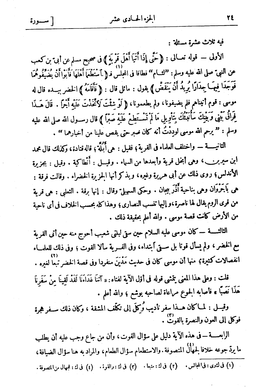 فِيهِ ثَلَاثَ عَشْرَةَ مَسْأَلَةً: الْأُولَى- قَوْلُهُ تَعَالَى: (حَتَّى إِذا أَتَيا أَهْلَ قَرْيَةٍ) فِي صَحِيحِ مُسْلِمٍ عَنْ أُبَيِّ بْنِ كَعْبٍ عَنِ النَّبِيِّ صَلَّى اللَّهُ عَلَيْهِ وَسَلَّمَ:" لئام" فطافا في المجلس «١» فَ"- اسْتَطْعَما أَهْلَها فَأَبَوْا أَنْ يُضَيِّفُوهُما فَوَجَدا فِيها جِداراً يُرِيدُ أَنْ يَنْقَضَّ" يَقُولُ: مَائِلٌ قَالَ:" فَأَقامَهُ" الْخَضِرُ بِيَدِهِ قَالَ لَهُ مُوسَى: قَوْمٌ أَتَيْنَاهُمْ فَلَمْ يُضَيِّفُونَا، وَلَمْ يُطْعِمُونَا،" لَوْ شِئْتَ لَاتَّخَذْتَ عَلَيْهِ أَجْراً، قالَ هَذَا فِراقُ بَيْنِي وَبَيْنِكَ سَأُنَبِّئُكَ بِتَأْوِيلِ ما لَمْ تَسْتَطِعْ عَلَيْهِ صَبْراً" قَالَ رَسُولُ اللَّهِ صَلَّى اللَّهُ عَلَيْهِ وَسَلَّمَ: (يَرْحَمُ اللَّهُ مُوسَى لَوَدِدْتُ أَنَّهُ كَانَ صَبَرَ حَتَّى يَقُصَّ عَلَيْنَا مِنْ أَخْبَارِهِمَا). الثَّانِيَةُ- وَاخْتَلَفَ الْعُلَمَاءُ فِي الْقَرْيَةِ فَقِيلَ: هِيَ أبلة، قاله قتادة، وكذلك قال محمد ابن سِيرِينَ، وَهِيَ أَبْخَلُ قَرْيَةٍ وَأَبْعَدُهَا مِنَ السَّمَاءِ. وَقِيلَ: أَنْطَاكِيَّةُ وَقِيلَ: بِجَزِيرَةِ الْأَنْدَلُسِ، رُوِيَ ذَلِكَ عَنْ أَبِي هُرَيْرَةَ وَغَيْرِهِ، وَيُذْكَرُ أَنَّهَا الْجَزِيرَةُ الْخَضْرَاءُ. وَقَالَتْ فِرْقَةٌ: هِيَ بَاجِرْوَانُ وَهِيَ بِنَاحِيَةِ أَذْرَبِيجَانَ. وَحَكَى السُّهَيْلِيُّ وَقَالَ: إِنَّهَا بَرْقَةُ. الثَّعْلَبِيُّ: هِيَ قَرْيَةٌ مِنْ قُرَى الرُّومِ يُقَالُ لَهَا نَاصِرَةُ، وَإِلَيْهَا تُنْسَبُ النَّصَارَى، وَهَذَا كُلُّهُ بِحَسَبِ الْخِلَافِ فِي أَيِّ نَاحِيَةٍ مِنَ الْأَرْضِ كَانَتْ قِصَّةُ مُوسَى. وَاللَّهُ أَعْلَمُ بِحَقِيقَةِ ذَلِكَ. الثَّالِثَةُ- كَانَ مُوسَى عَلَيْهِ السَّلَامُ حِينَ سَقَى لِبِنْتَيْ شُعَيْبٍ أَحْوَجَ مِنْهُ حِينَ أَتَى الْقَرْيَةَ مَعَ الْخَضِرِ، وَلَمْ يَسْأَلْ قُوتًا بَلْ سَقَى ابْتِدَاءً، وفي القرية سألا الْقُوتَ، وَفِي ذَلِكَ لِلْعُلَمَاءِ انْفِصَالَاتٌ كَثِيرَةٌ، مِنْهَا أَنَّ مُوسَى كَانَ فِي حَدِيثِ مَدْيَنَ مُنْفَرِدًا وَفِي قِصَّةِ الْخَضِرِ تَبَعًا «٢» لِغَيْرِهِ. قُلْتُ: وَعَلَى هَذَا الْمَعْنَى يَتَمَشَّى قَوْلُهُ فِي أَوَّلِ الْآيَةِ لِفَتَاهُ:" آتِنا غَداءَنا لَقَدْ لَقِينا مِنْ سَفَرِنا هَذَا نَصَباً" فَأَصَابَهُ الْجُوعُ مُرَاعَاةً لِصَاحِبِهِ يُوشَعَ، وَاللَّهُ أَعْلَمُ. وَقِيلَ: لَمَّا كَانَ هَذَا سَفَرَ تَأْدِيبٍ وُكِلَ إِلَى تَكَلُّفِ الْمَشَقَّةِ، وَكَانَ ذَلِكَ سَفَرَ هِجْرَةٍ فَوُكِلَ إِلَى الْعَوْنِ وَالنُّصْرَةِ بِالْقُوتِ «٣». الرَّابِعَةُ- فِي هَذِهِ الْآيَةِ دَلِيلٌ عَلَى سُؤَالِ الْقُوتِ، وَأَنَّ مَنْ جَاعَ وَجَبَ عَلَيْهِ أَنْ يَطْلُبَ مَا يَرُدُّ جُوعَهُ خِلَافًا لِجُهَّالِ «٤» الْمُتَصَوِّفَةِ. وَالِاسْتِطْعَامُ سُؤَالُ الطَّعَامِ، وَالْمُرَادُ بِهِ هُنَا سُؤَالُ الضيافة،