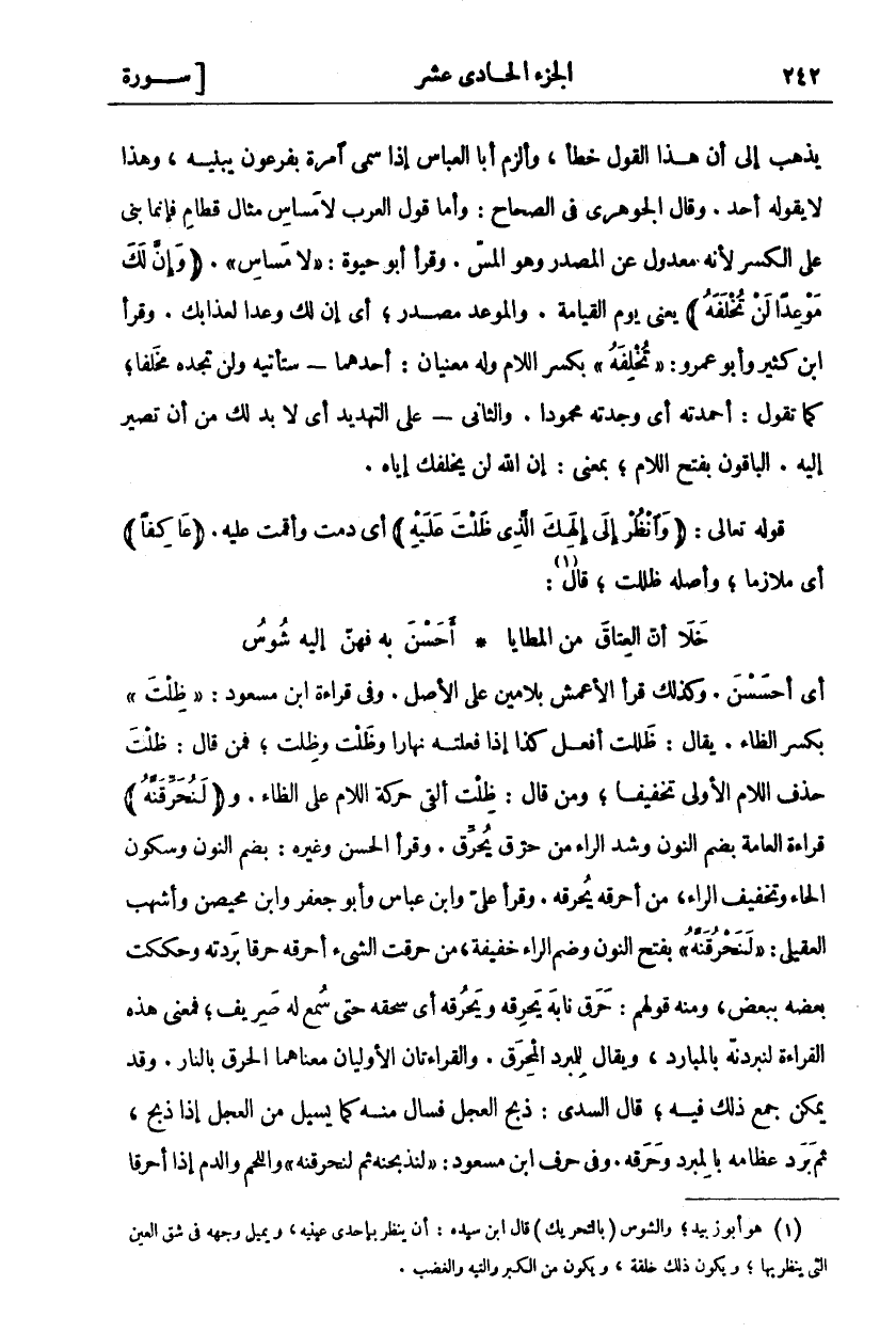 أَيْ أَحْسَسْنَ. وَكَذَلِكَ قَرَأَ الْأَعْمَشُ بِلَامَيْنِ عَلَى الْأَصْلِ. وَفِي قِرَاءَةِ ابْنِ مَسْعُودٍ:" ظِلْتَ" بِكَسْرِ الظَّاءِ. يُقَالُ: ظَلَلْتُ أَفْعَلُ كَذَا إِذَا فَعَلْتَهُ نَهَارًا وَظَلْتُ وَظِلْتُ، فَمَنْ قَالَ: ظَلْتُ حَذَفَ اللَّامَ الْأُولَى تَخْفِيفًا، وَمَنْ قَالَ: ظِلْتُ أَلْقَى حَرَكَةَ اللَّامِ عَلَى الظَّاءِ. (لَنُحَرِّقَنَّهُ) ٢٠: ٩٧ قِرَاءَةُ الْعَامَّةِ بِضَمِّ النُّونِ وَشَدِّ الرَّاءِ مِنْ حَرَّقَ يُحَرِّقُ. وَقَرَأَ الْحَسَنُ وَغَيْرُهُ: بِضَمِّ النُّونِ وَسُكُونِ الْحَاءِ وَتَخْفِيفِ الرَّاءِ مِنْ أَحْرَقَهُ يُحْرِقُهُ. وَقَرَأَ عَلِيٌّ وَابْنُ عَبَّاسٍ وَأَبُو جَعْفَرٍ وَابْنُ مُحَيْصِنٍ وَأَشْهَبُ الْعُقَيْلِيُّ" لَنَحْرُقَنَّهُ" بِفَتْحِ النُّونِ وَضَمِّ الرَّاءِ خَفِيفَةً، مِنْ حَرَقْتُ الشَّيْءَ أَحْرُقُهُ حَرْقًا بَرَدْتُهُ وَحَكَكْتُ بَعْضَهُ بِبَعْضٍ، وَمِنْهُ قَوْلُهُمْ: حَرَقَ نَابَهُ يُحْرِقُهُ وَيَحْرُقُهُ أَيْ سَحَقَهُ حَتَّى سُمِعَ لَهُ صَرِيفٌ، فَمَعْنَى هَذِهِ الْقِرَاءَةِ لَنَبْرُدَنَّهُ بِالْمَبَارِدِ، وَيُقَالُ لِلْمِبْرَدِ الْمِحْرَقُ. وَالْقِرَاءَتَانِ الْأُولَيَانِ مَعْنَاهُمَا الْحَرْقُ بِالنَّارِ. وَقَدْ يُمْكِنُ جَمْعُ ذَلِكَ فِيهِ، قَالَ السُّدِّيُّ: ذَبَحَ الْعِجْلَ فَسَالَ مِنْهُ كَمَا يَسِيلُ مِنَ الْعِجْلِ إِذَا ذُبِحَ، ثُمَّ بَرَدَ عِظَامَهُ بِالْمِبْرَدِ وَحَرَقَهُ. وَفِي حَرْفِ ابْنِ مَسْعُودٍ:" لَنَذْبَحَنَّهُ ثُمَّ لَنَحْرُقَنَّهُ" واللحم والدم إذا أحرقا