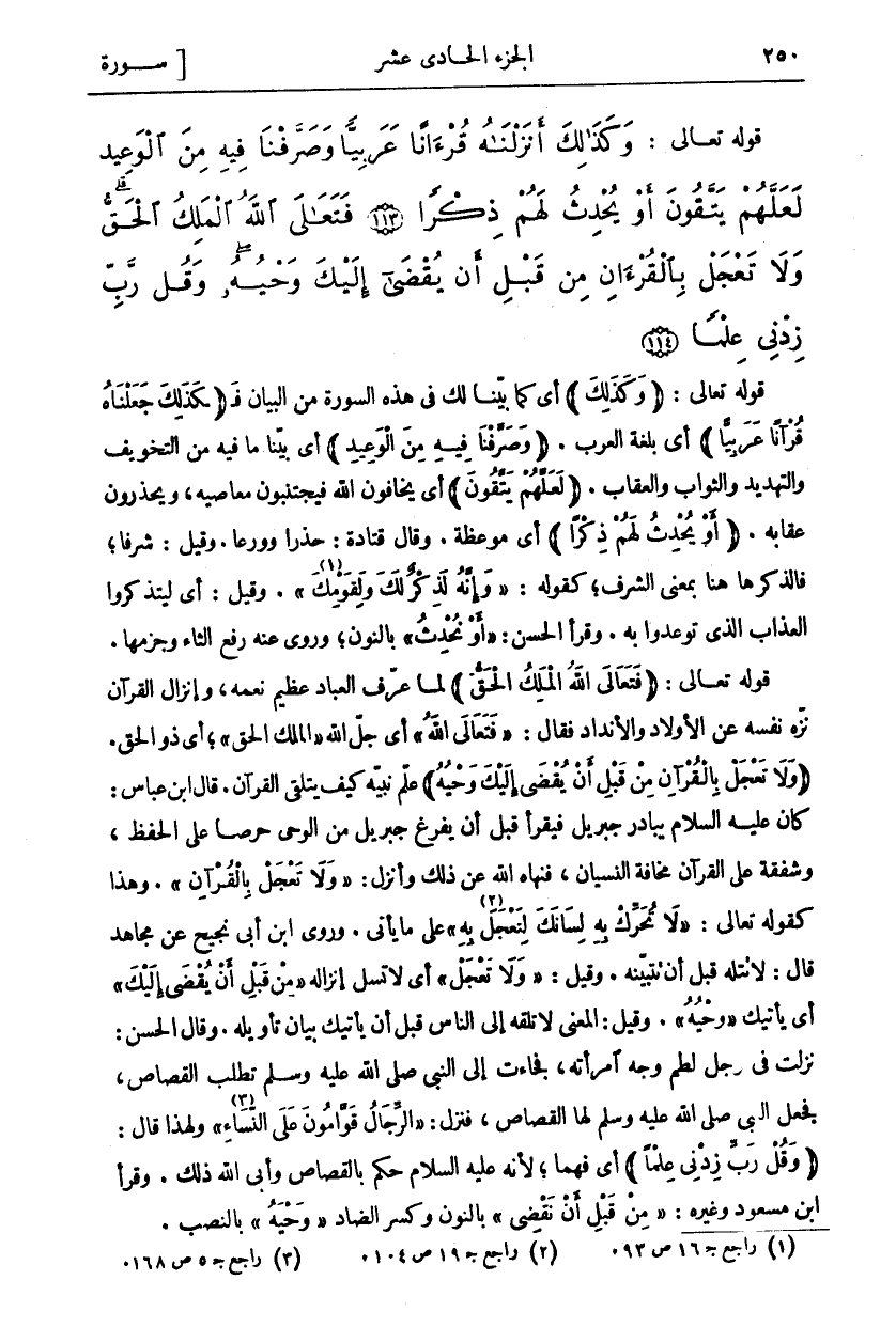 وَكَذلِكَ أَنْزَلْناهُ قُرْآناً عَرَبِيًّا وَصَرَّفْنا فِيهِ مِنَ الْوَعِيدِ لَعَلَّهُمْ يَتَّقُونَ أَوْ يُحْدِثُ لَهُمْ ذِكْراً (١١٣) فَتَعالَى اللَّهُ الْمَلِكُ الْحَقُّ وَلا تَعْجَلْ بِالْقُرْآنِ مِنْ قَبْلِ أَنْ يُقْضى إِلَيْكَ وَحْيُهُ وَقُلْ رَبِّ زِدْنِي عِلْماً (١١٤)