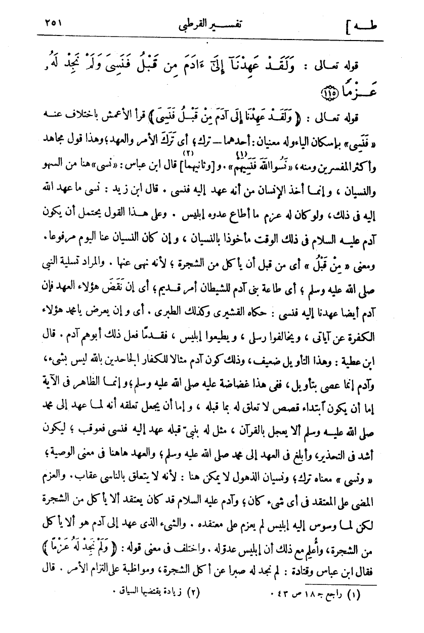 وَلَقَدْ عَهِدْنا إِلى آدَمَ مِنْ قَبْلُ فَنَسِيَ وَلَمْ نَجِدْ لَهُ عَزْماً (١١٥)