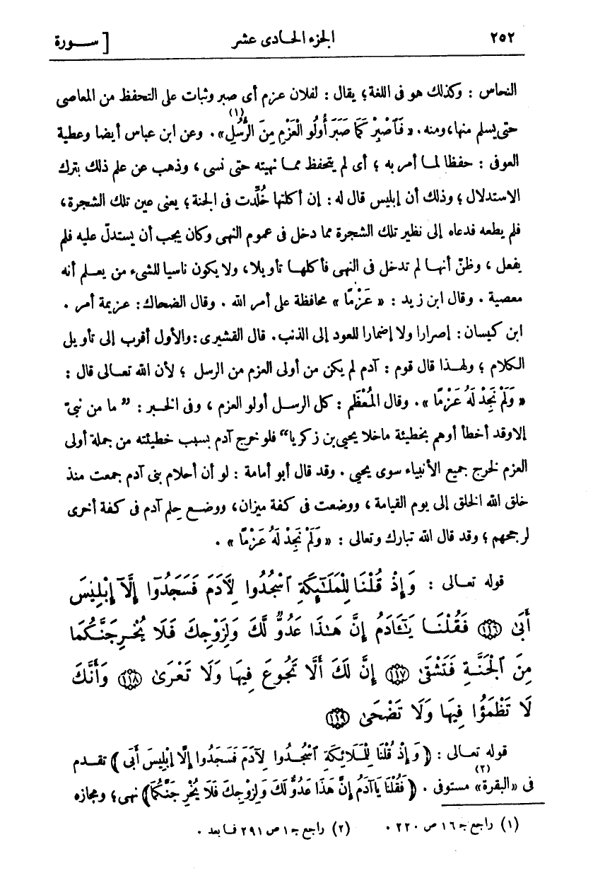 النَّحَّاسُ: وَكَذَلِكَ هُوَ فِي اللُّغَةِ، يُقَالُ: لِفُلَانٍ عَزْمٌ أَيْ صَبْرٌ وَثَبَاتٌ عَلَى التَّحَفُّظِ مِنَ الْمَعَاصِي حَتَّى يَسْلَمَ مِنْهَا، وَمِنْهُ." فَاصْبِرْ كَما صَبَرَ أُولُوا الْعَزْمِ مِنَ الرُّسُلِ" «١» [الأحقاف: ٣٥]. وَعَنِ ابْنِ عَبَّاسٍ أَيْضًا وَعَطِيَّةَ الْعَوْفِيِّ: حِفْظًا لِمَا أُمِرَ بِهِ، أَيْ لَمْ يَتَحَفَّظْ مِمَّا نَهَيْتُهُ حَتَّى نَسِيَ وَذَهَبَ عَنْ عِلْمِ ذَلِكَ بِتَرْكِ الِاسْتِدْلَالِ، وَذَلِكَ أَنَّ إِبْلِيسَ قَالَ لَهُ: إِنْ أَكَلْتَهَا خُلِّدْتَ فِي الْجَنَّةِ يَعْنِي عَيْنَ تِلْكَ الشَّجَرَةِ، فَلَمْ يُطِعْهُ فَدَعَاهُ إِلَى نَظِيرِ تِلْكَ الشَّجَرَةِ مِمَّا دَخَلَ فِي عُمُومِ النَّهْيِ وَكَانَ يَجِبُ أَنْ يَسْتَدِلَّ عَلَيْهِ فَلَمْ يَفْعَلْ، وَظَنَّ أَنَّهَا لَمْ تَدْخُلْ فِي النَّهْيِ فَأَكَلَهَا تَأْوِيلًا، وَلَا يَكُونُ نَاسِيًا لِلشَّيْءِ مَنْ يَعْلَمُ أَنَّهُ مَعْصِيَةٌ. وَقَالَ ابْنُ زَيْدٍ:" عَزْماً ٢٠: ١١٥" مُحَافَظَةً عَلَى أَمْرِ اللَّهِ. وَقَالَ الضَّحَّاكُ: عَزِيمَةُ أَمْرٍ. ابْنُ كَيْسَانَ: إِصْرَارًا وَلَا إِضْمَارًا لِلْعَوْدِ إِلَى الذَّنْبِ. قَالَ الْقُشَيْرِيُّ: وَالْأَوَّلُ أَقْرَبُ إِلَى تَأْوِيلِ الْكَلَامِ، وَلِهَذَا قَالَ قَوْمٌ: آدَمُ لَمْ يَكُنْ مِنْ أُولِي الْعَزْمِ مِنَ الرُّسُلِ، لِأَنَّ اللَّهَ تَعَالَى قَالَ:" وَلَمْ نَجِدْ لَهُ عَزْماً ٢٠: ١١٥". وَقَالَ المعظم: كان الرُّسُلِ أُولُو الْعَزْمِ، وَفِي الْخَبَرِ:" مَا مِنْ نَبِيٍّ إِلَّا وَقَدْ أَخْطَأَ أَوْ هَمَّ بِخَطِيئَةٍ مَا خَلَا يَحْيَى بْنَ زَكَرِيَّا" فَلَوْ خَرَجَ آدَمُ بِسَبَبِ خَطِيئَتِهِ مِنْ جُمْلَةِ أُولِي الْعَزْمِ لَخَرَجَ جَمِيعُ الْأَنْبِيَاءِ سِوَى يَحْيَى. وَقَدْ قَالَ أبو أمامة: أَنَّ أَحْلَامَ بَنِي آدَمَ جُمِعَتْ مُنْذُ خَلَقَ اللَّهُ الْخَلْقَ إِلَى يَوْمِ الْقِيَامَةِ، وَوُضِعَتْ فِي كِفَّةِ مِيزَانٍ، وَوُضِعَ حِلْمُ آدَمَ فِي كِفَّةٍ أُخْرَى لَرَجَحَهُمْ، وَقَدْ قَالَ اللَّهُ تَبَارَكَ وَتَعَالَى:" وَلَمْ نَجِدْ لَهُ عَزْماً ٢٠: ١١٥"